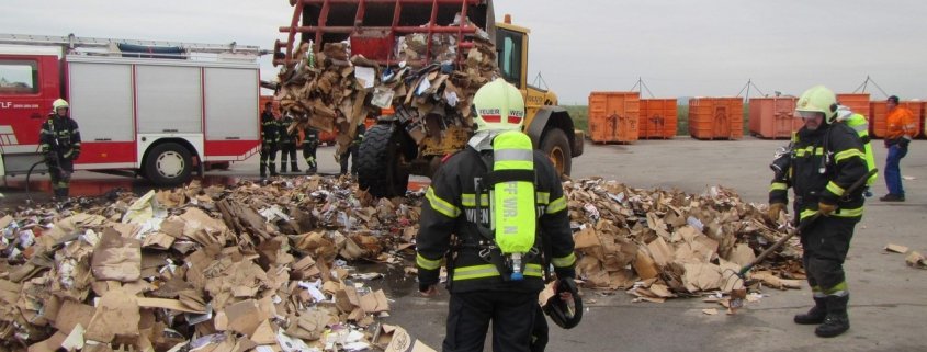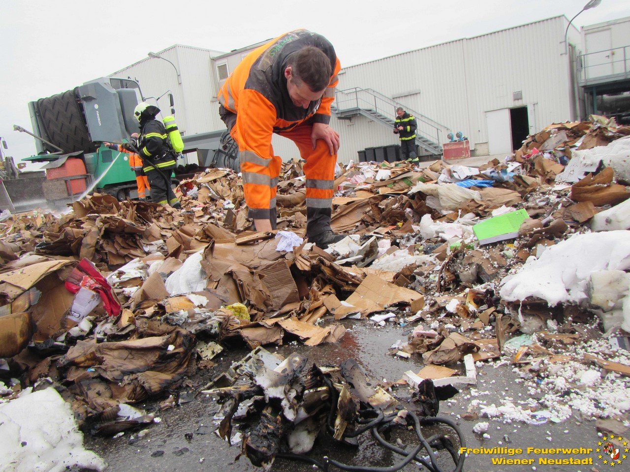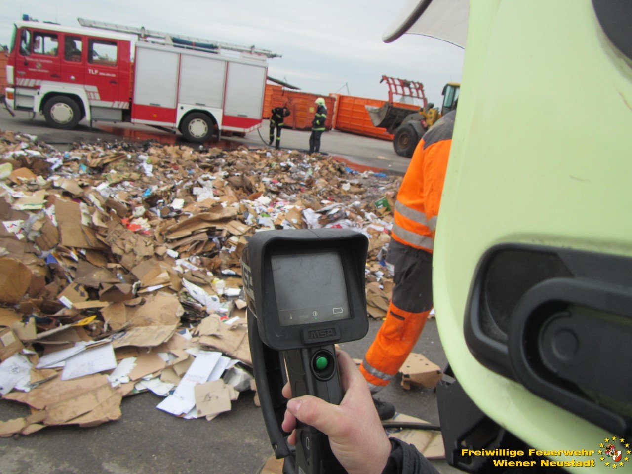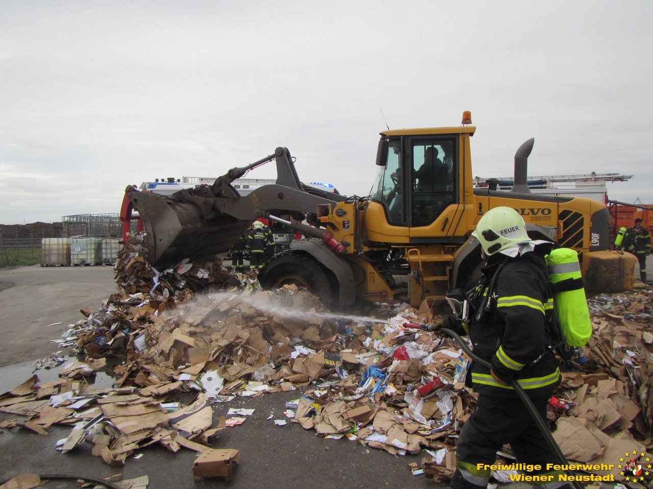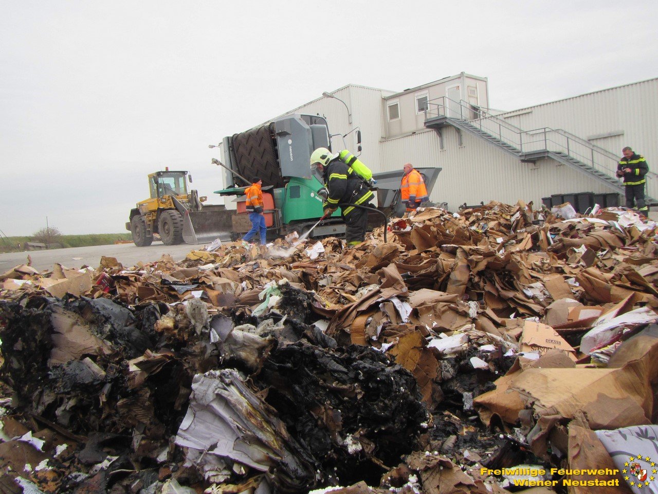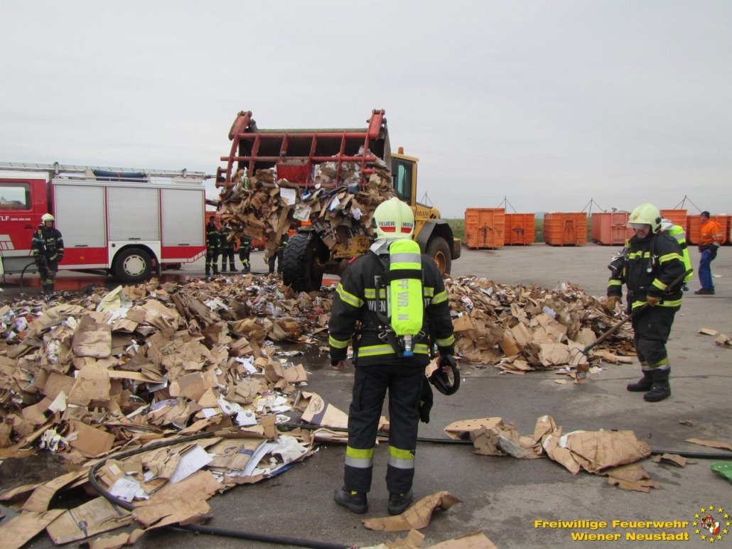 Ein Mitarbeiter – er ist Mitglied der Freiwilligen Feuerwehr Wiener Neustadt – erkannte frühzeitig den Brand in der Altpapierpresse und reagierte sofort. Er nahm die Presse mit einem kommunalen Wechseladefahrzeug auf, brachte diese sofort weg von den anderen Müllbehältern und leerte den Inhalt auf einen betonierten Platz, abseits von anderem Müll. Dort übernahm ein weiterer Mitarbeiter mit einem Rohr aus einem vorhandenen Wandhydranten die ersten Löschmaßnahmen. Ein weiterer Mitarbeiter zerteilte den Müll mit einem Radlader. Die kurze Zeit später eintreffende Mannschaft des ersten Tanklöschfahrzeuges übernahm die weiteren Löschmaßnahmen.