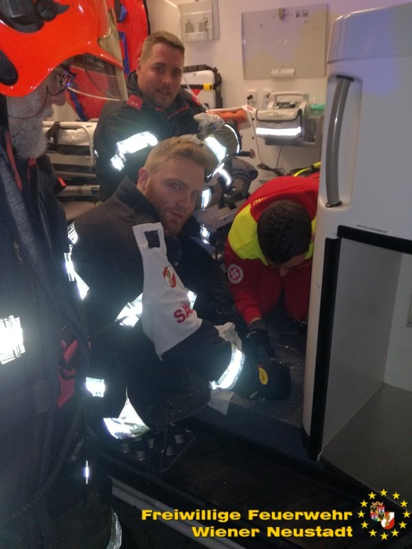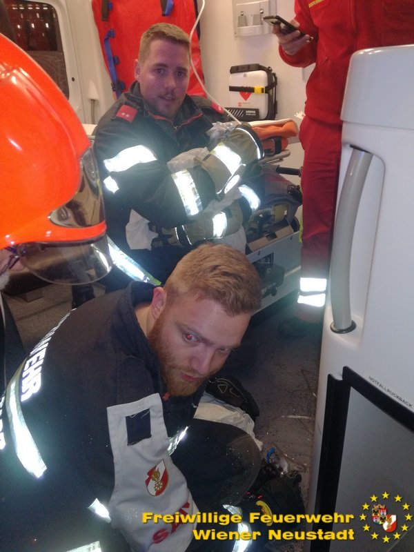 Die aufgebrochene Wohnungstüre wurde von der Feuerwehr provisorisch versperrt. Die Feuerwehr Wiener Neustadt stand mit neun Fahrzeugen und 49 Mann 1,5 Stunden im Einsatz.