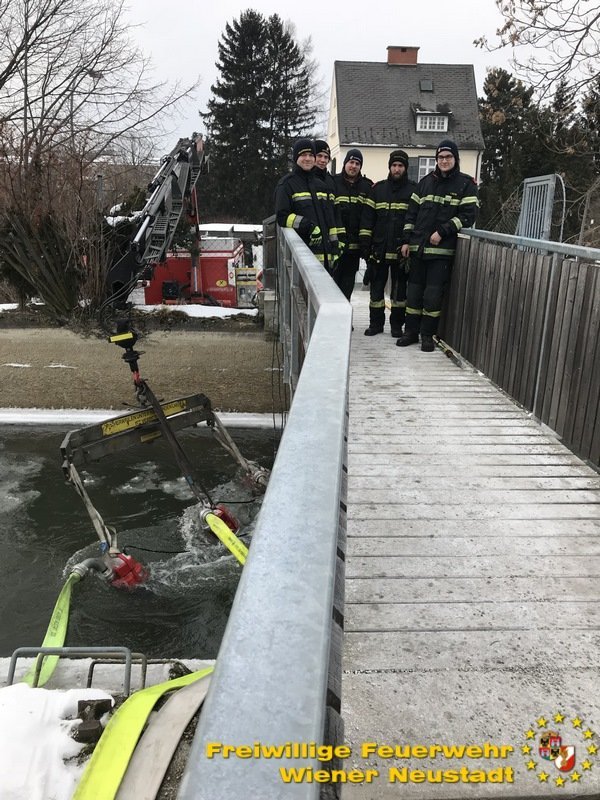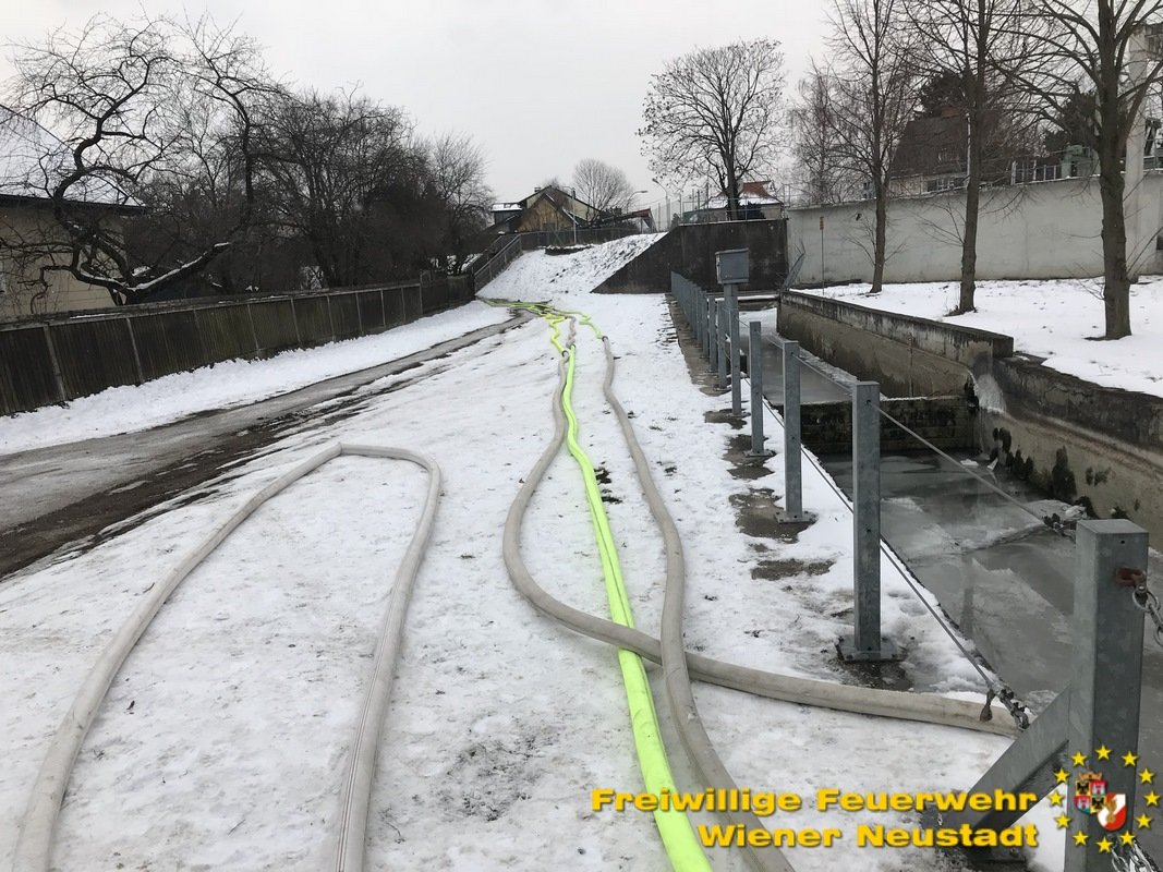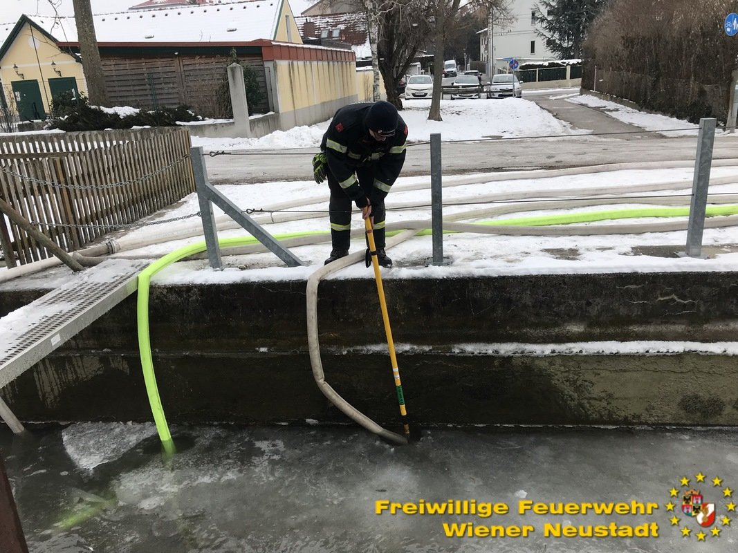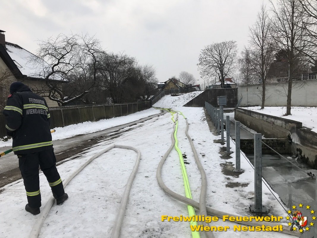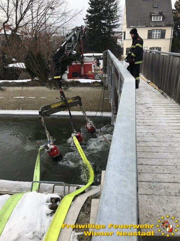 Die mehreren hundert Fische im Wiener Neustädter Kanal können aufgrund des niedrigen Wasserpegels und der hinzukommenden Eisschicht nicht überleben. Deshalb pumpt die Feuerwehr Wiener Neustadt mit mehreren Pumpen Wasser an mehreren Tagen vom Kehrbach in den Wiener Neustädter Kanal.