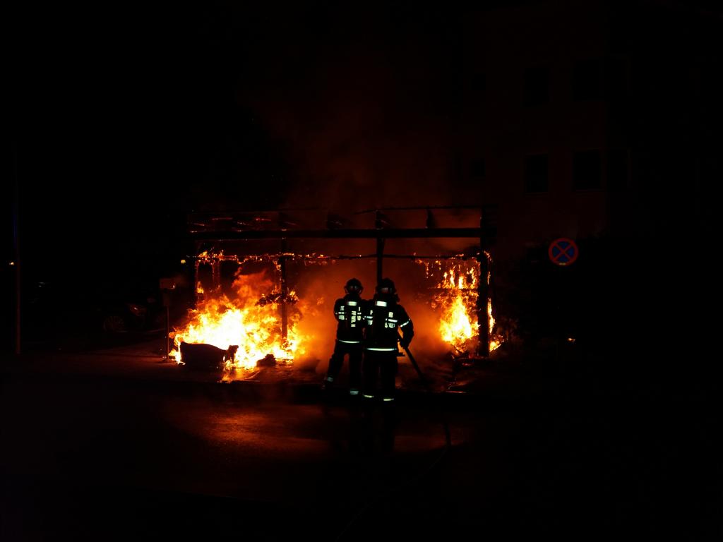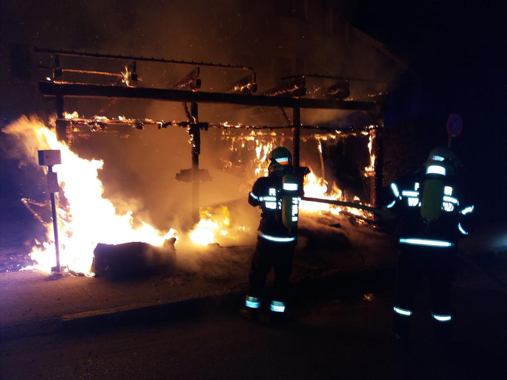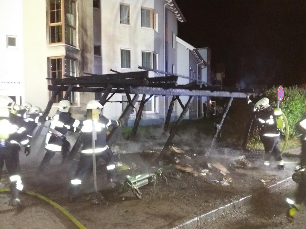 Bei der Ankunft war die Müllinsel vor einem Mehrparteienhaus bereits im Vollbrand. Neben der Müllinsel befinden sich in etwa 5 Metern Abstand Parkplätze. Durch den raschen Einsatz der Freiwilligen Feuerwehr Wiener Neustadt konnte ein Übergreifen des Feuers auf die Fahrzeuge und das Wohnhaus verhindert werden. Durch die Strahlungshitze waren dort bereits Fahrzeuge angeschmolzen worden. Auch die Fassade des hinter der Müllinsel befindlichen Hauses war bereits in Mitleidenschaft geraten und Fenster waren aufgrund der Hitze gesprungen.
