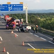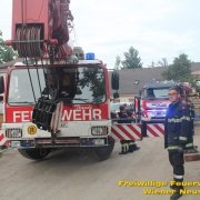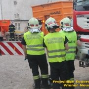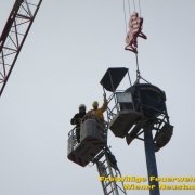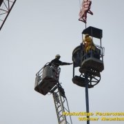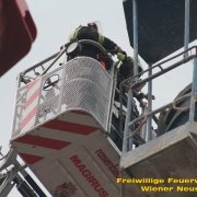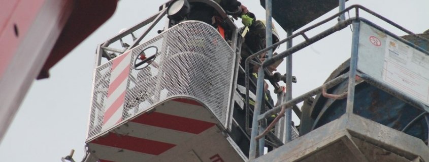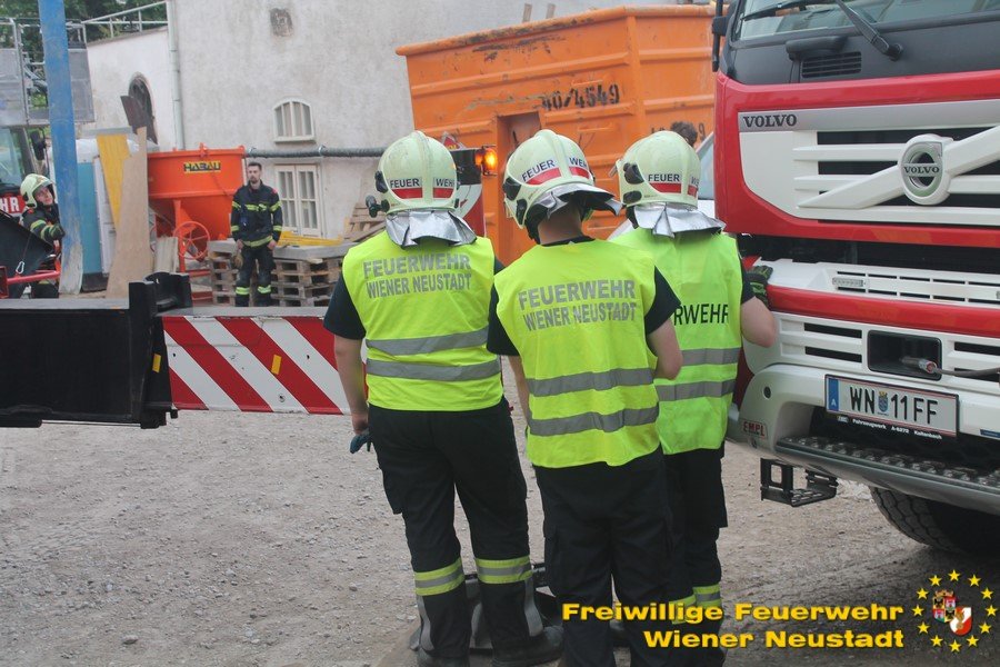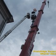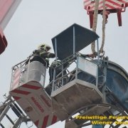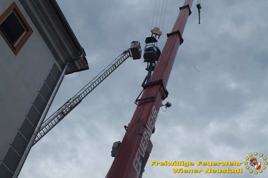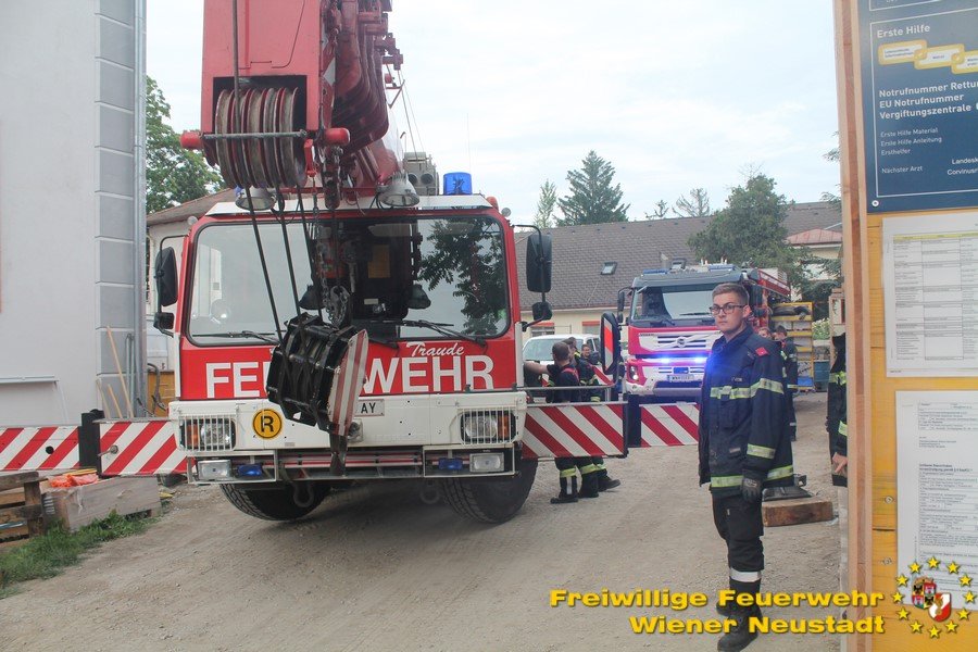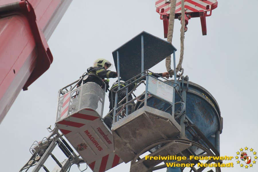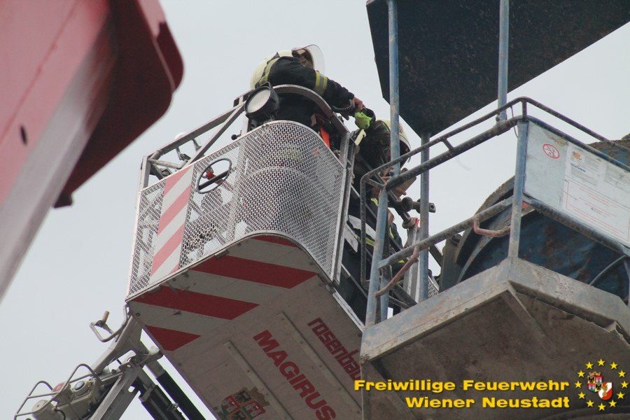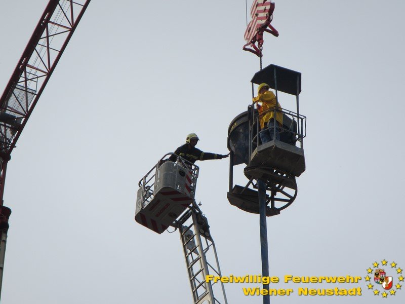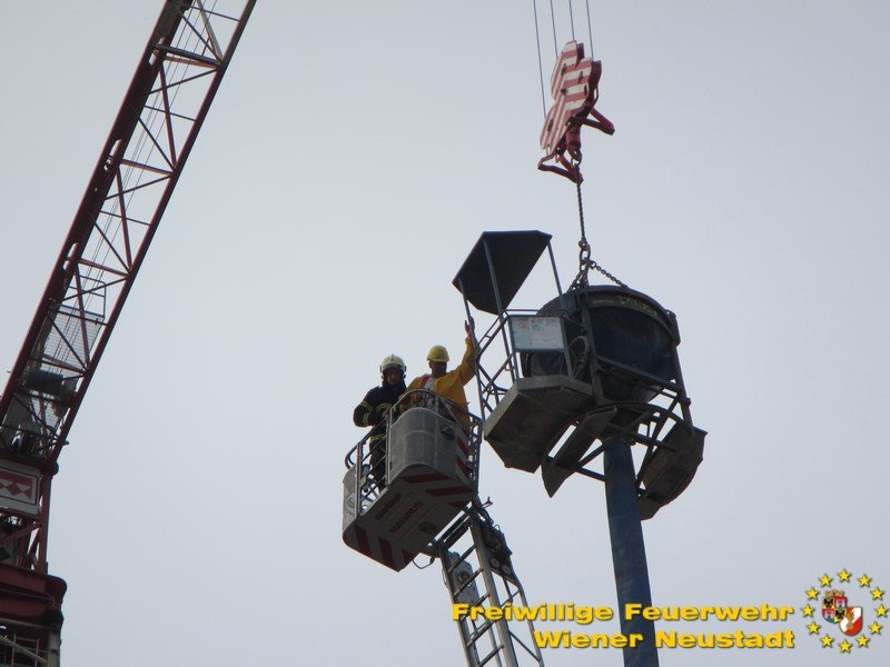 Zu einer Person in Notlage und einer Güterbergung musste die Feuerwehr Wiener Neustadt am Donnerstag, 24.05., in den frühen Abendstunden auf die FH- Baustelle beim Landesklinikum ausrücken. Ein Baukran konnte aufgrund eines betrieblichen Gebrechens den angehängten Betonkübel nicht mehr Senken. Ein Bauarbeiter, welcher sich auf einer Arbeitsplattform befand, war somit auf etwa 25 Meter Höhe gefangen. Der Arbeiter musste mit der Drehleiter gerettet werden. Anschließend wurde der volle Betonkübel mittels Feuerwehrkran geborgen. Der Arbeiter blieb unverletzt.