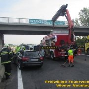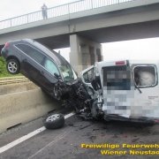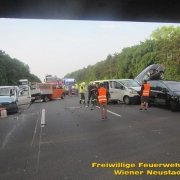 Ein Unfall mit acht beteiligten Fahrzeugen und fünf Verletzten war am Montagmorgen, 28.05., die Ursache für einen 12 Kilometer langen Stau und zwei Stunden Zeitverlust auf der Südautobahn Fahrtrichtung Wien. Ein Audi wurde bei dem Unfall sogar auf die Betonleitwand geschleudert und blieb in der Luft hängen. Die Autobahn musste während der Bergungsarbeiten auf einen Fahrstreifen eingeengt werden. Vier Personen mussten mit Verletzungen unbestimmten Grades ins Krankenhaus gebracht werden.