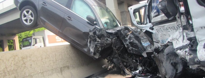 Ein Audi, welcher durch die Wucht der Kollision auf die Betonleitwand geschleudert wurde, musste mit dem Kran von der Leitwand gehoben werden.