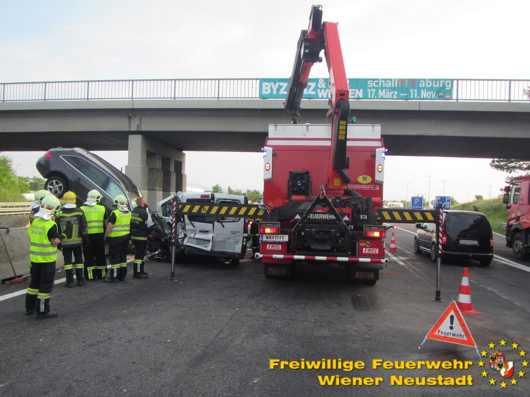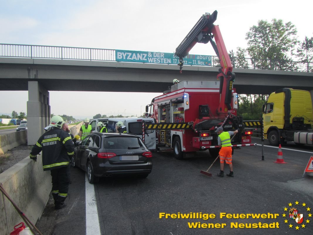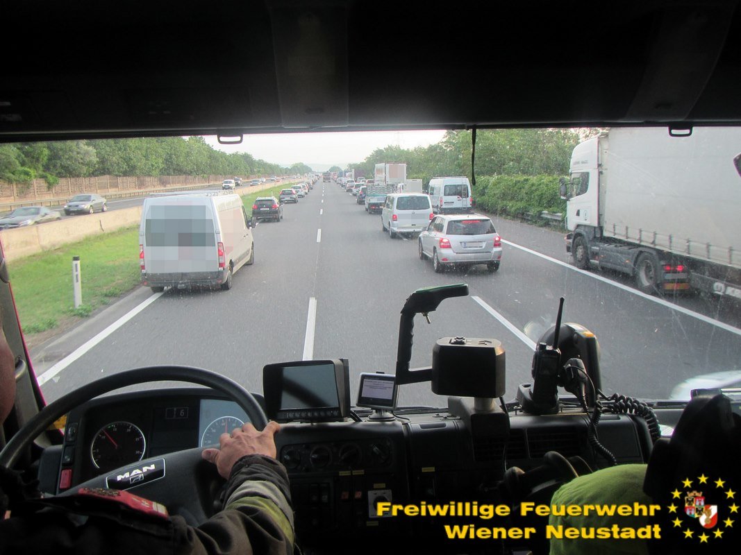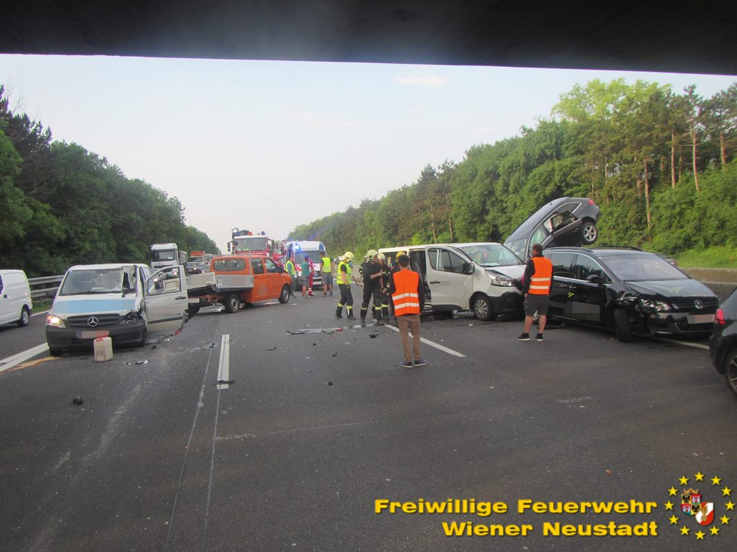 Gegen 06:15 ging die Meldung zu dem Verkehrsunfall mit mehreren Fahrzeugen auf der A2 in Fahrtrichtung Wien ein. Über Personenrufempfänger wurden weitere Einsatzkräfte alarmiert. Kurz darauf rückten mehrere Feuerwehrfahrzeuge zur Einsatzstelle aus.