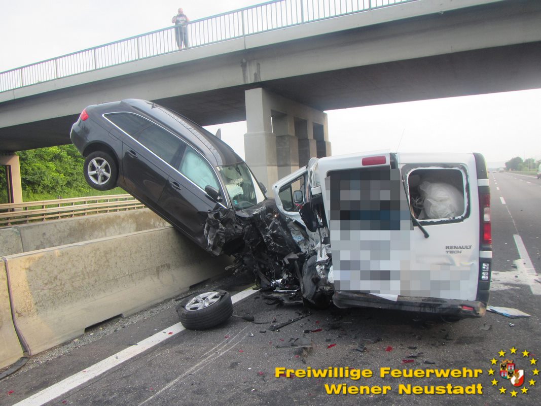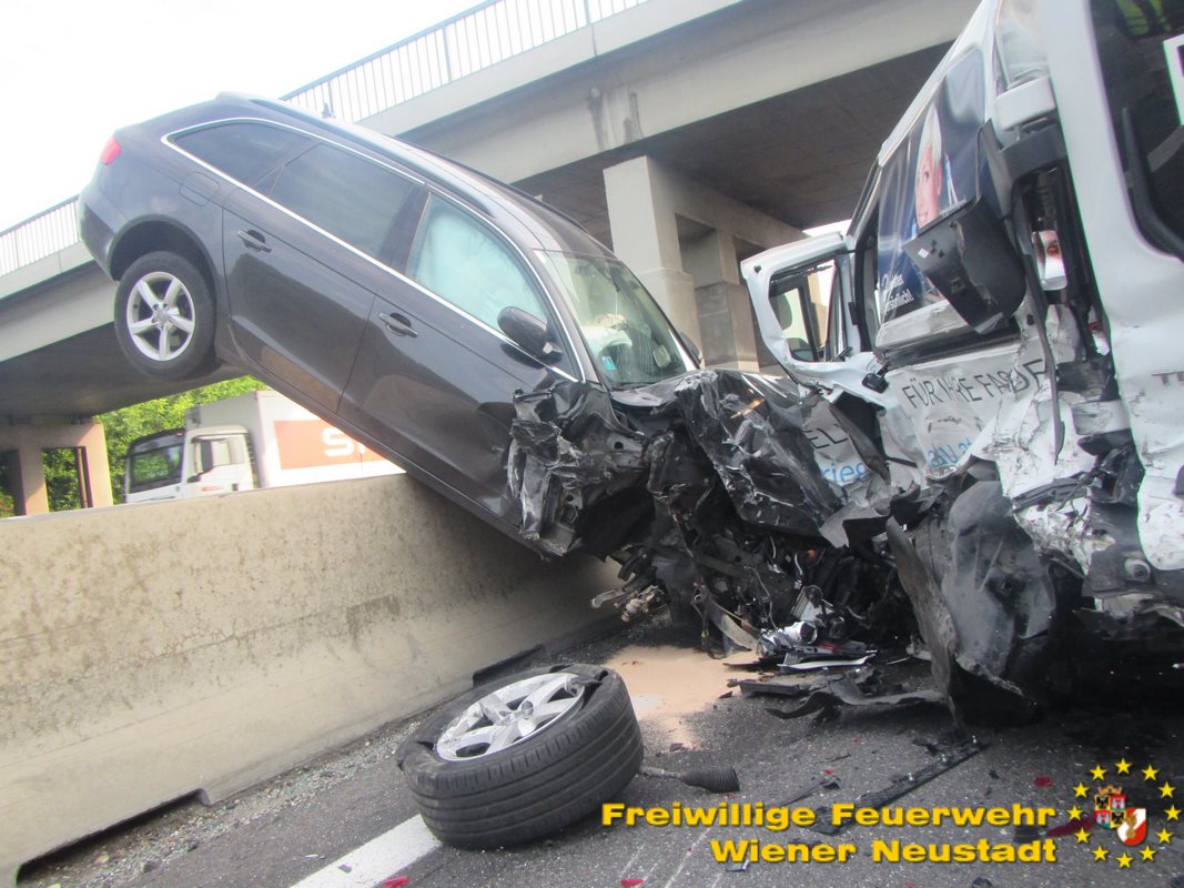 Ein Unfall mit acht beteiligten Fahrzeugen und fünf Verletzten war am Montagmorgen, 28.05., die Ursache für einen 12 Kilometer langen Stau und zwei Stunden Zeitverlust auf der Südautobahn Fahrtrichtung Wien. Ein Audi wurde bei dem Unfall sogar auf die Betonleitwand geschleudert und blieb in der Luft hängen. Die Autobahn musste während der Bergungsarbeiten auf einen Fahrstreifen eingeengt werden. Vier Personen mussten mit Verletzungen unbestimmten Grades ins Krankenhaus gebracht werden.
