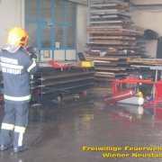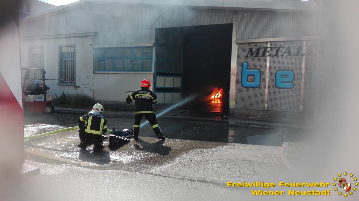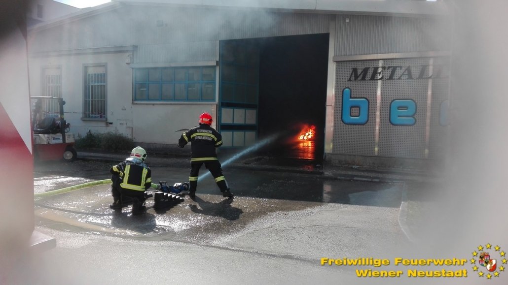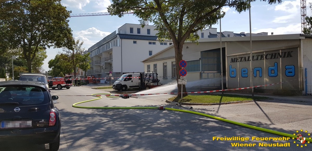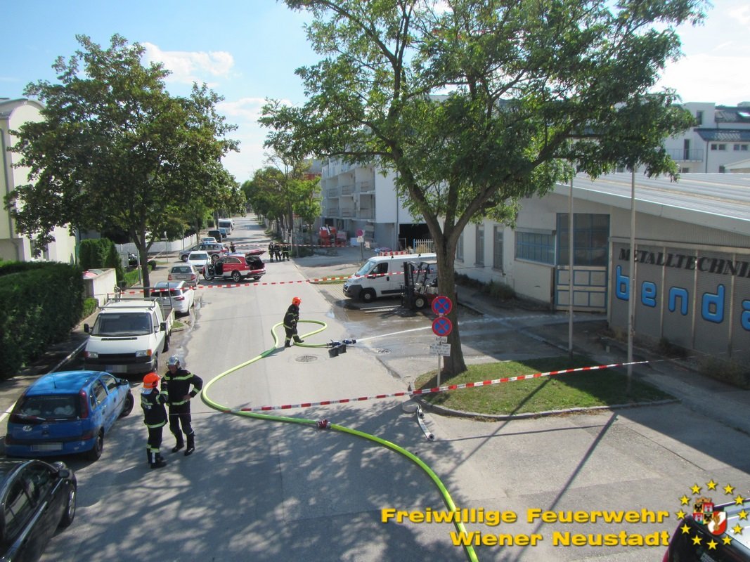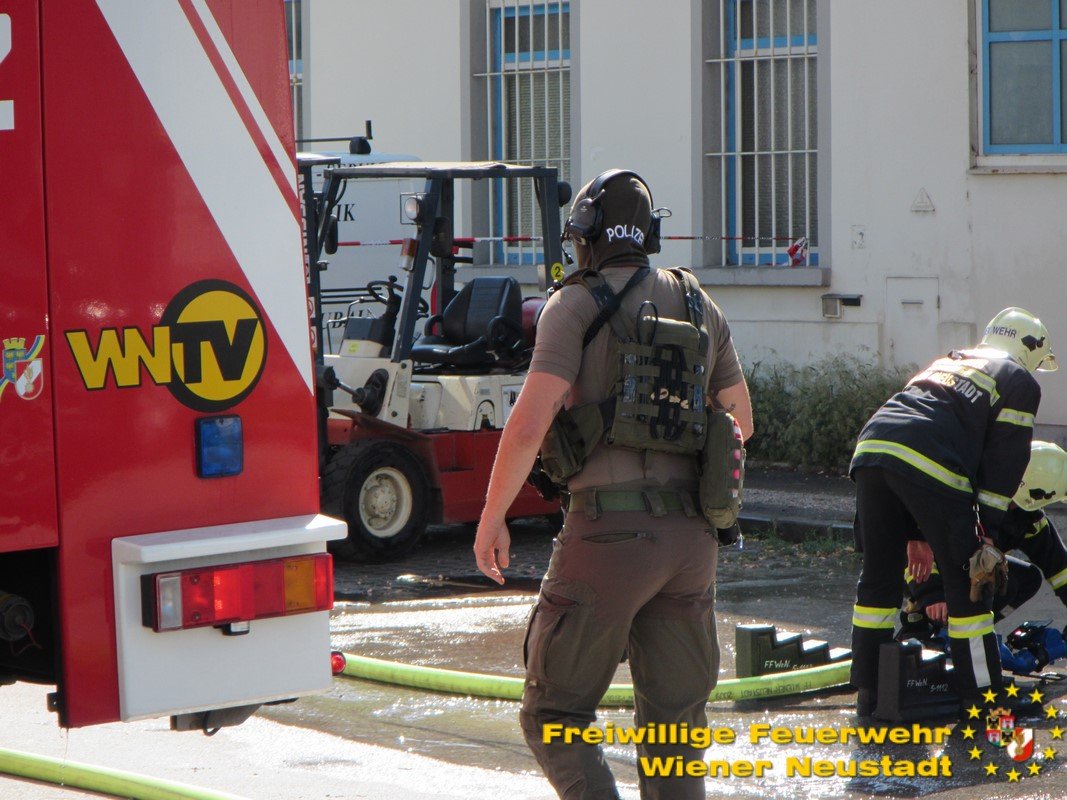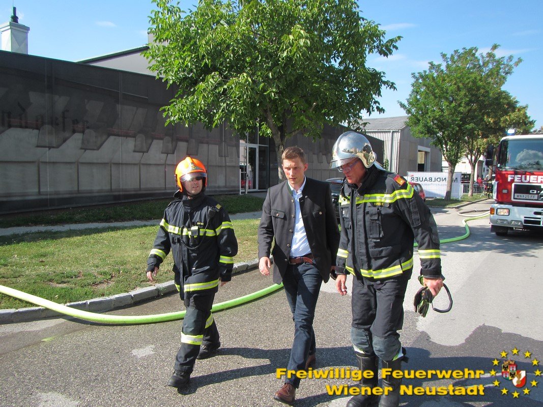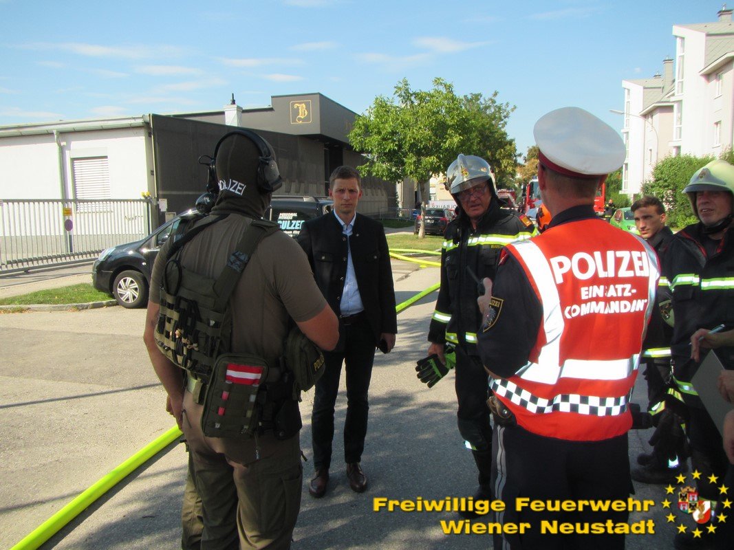 Kurz nach der Anzeige rückte die Feuerwehr Wiener Neustadt mit mehreren Fahrzeugen zur Einsatzstelle aus. Als einer der Ersten vor Ort veranlasste der Einsatzleiter BR Josef Bugnar eine Erhöhung der Alarmstufe auf die höchste Kategorie B4, wodurch die Sirenen heulten. „Da sich die Fertigungshalle in bebautem Gebiet befand und im Gefahrenbereich noch weitere explosionsgefährdete Objekte standen, war die Alarmierung mittels Sirene erforderlich, um im Falle einer Explosion genügend Einsatzkräfte vor Ort zu haben. Da vor allem in der Anfangsphase noch akute Explosionsgefahr bestand, wurde von der Feuerwehr auch ein gegenüberliegendes Mehrparteienhaus geräumt“, so Branddirektor Bugnar vor Ort.
