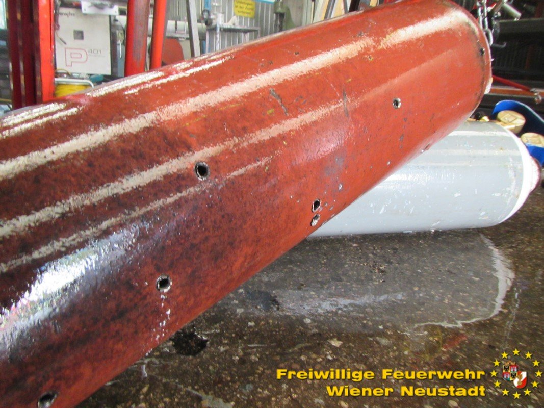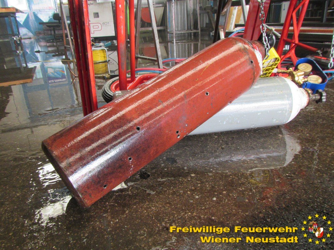 Die Arbeiter einer Metallverarbeitungsfirma in der Gymelsdorfer Gasse reagierten sofort vorbildlich, als die ersten Flammen aus der Gasflasche schlugen. Den Arbeitern gelang es rasch, die Flammen mittels Handfeuerlöscher zu löschen. Da die Flasche jedoch undicht war und deshalb akute Explosionsgefahr bestand, evakuierten die Arbeiter die Firma und verständigten die Feuerwehr.