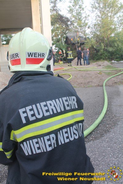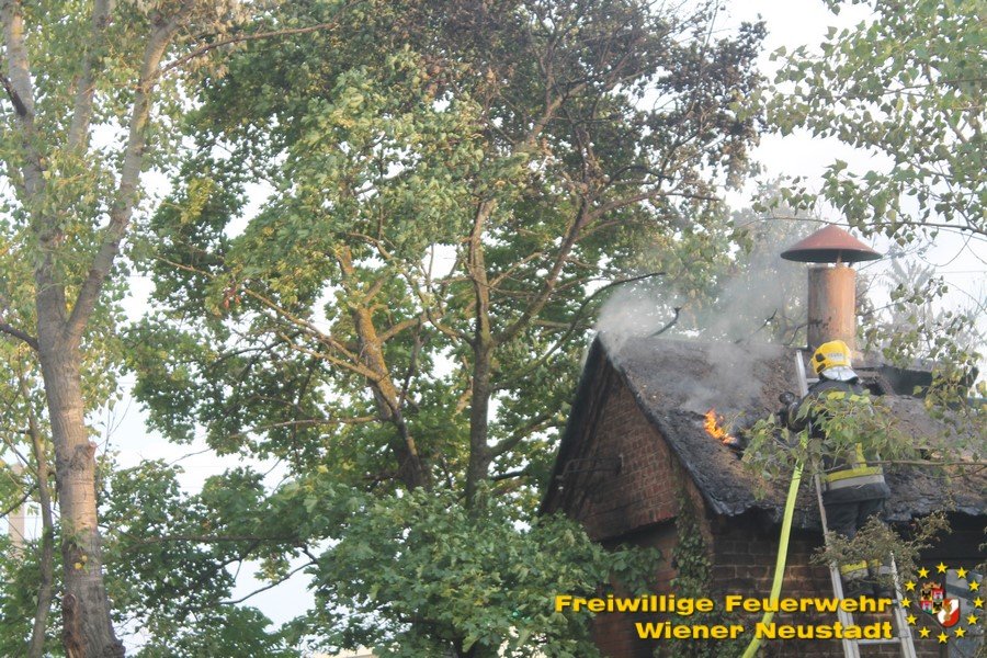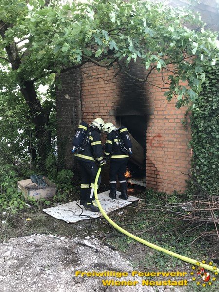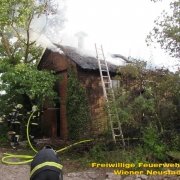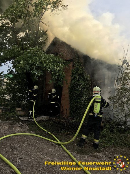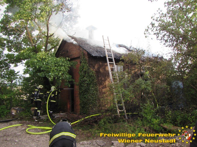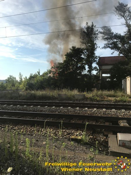 Über zwei dutzend Anzeiger meldeten am Freitagabend eine starke Rauchentwicklung neben einer Eisenbahnbrücke über die B17. Unter den Anrufern war auch ein Feuerwehrmann aus Wiener Neustadt. Aufgrund widersprüchlicher Meldungen ging der Disponent von einem Flurbrand entlang der Bahnstrecke aus. Das ersteintreffende Tanklöschfahrzeug fand jedoch eine leer stehende Hütte in Vollbrand vor. Unverzüglich wurde nachalarmiert und zusätzliche Einsatzkräfte hinzugezogen.