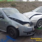 Aus bislang unbekannter Ursache kollidierten drei Fahrzeuge kurz vor der Bahnunterführung auf der Nordspange (B21) auf Höhe des EKZ Nord. Sofort wurden gemäß Alarmplan „Nordspange“ die Feuerwehren Wr. Neustadt und Theresienfeld zum Einsatzort berufen. Als die Feuerwehren eintrafen zeigte sich folgendes Bild: Drei Fahrzeuge waren fahruntauglich. Fünf Personen waren verletzt und wurden vom Roten Kreuz versorgt. Die Exekutive begann mit der Unfallaufnahme. Die eingetroffenen Feuerwehren sorgten für die Absicherung der Unfallstelle und stellten den Brandschutz her. Nach Beendigung der Unfallaufnahme durch die Polizei begannen die Feuerwehren Wiener Neustadt und Theresienfeld mit den Aufräumarbeiten. Hierbei wurde Hand-in-Hand gearbeitet und die Aufgabenteilung funktionierte ein weiteres Mal vorbildlich.