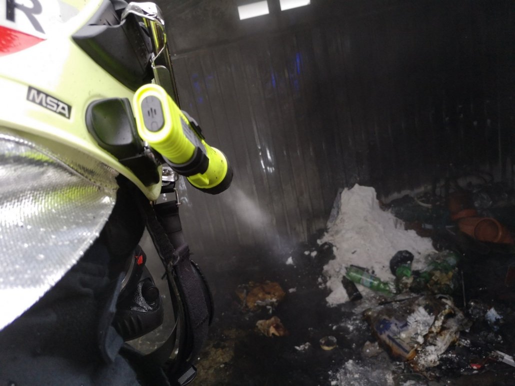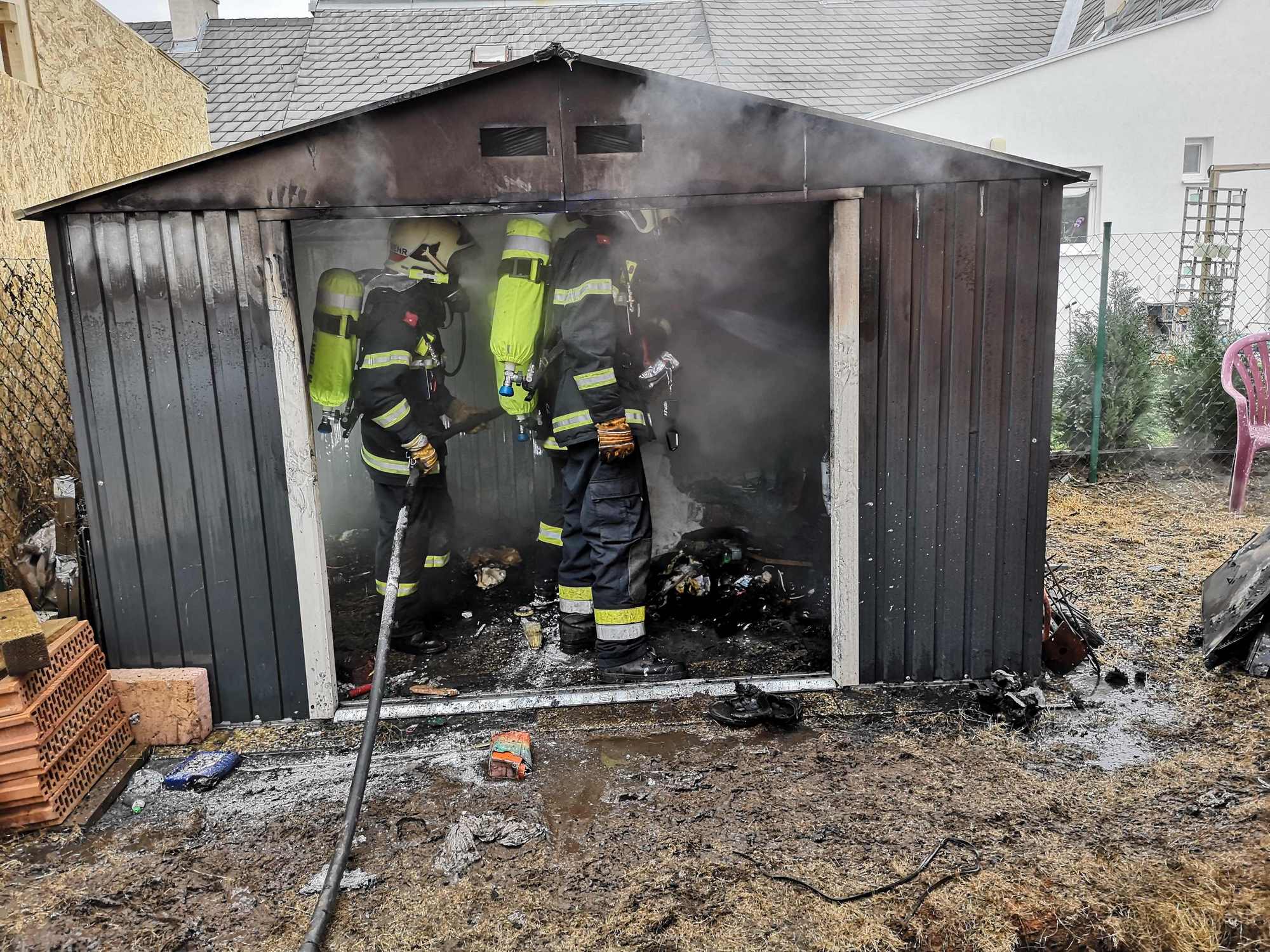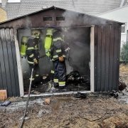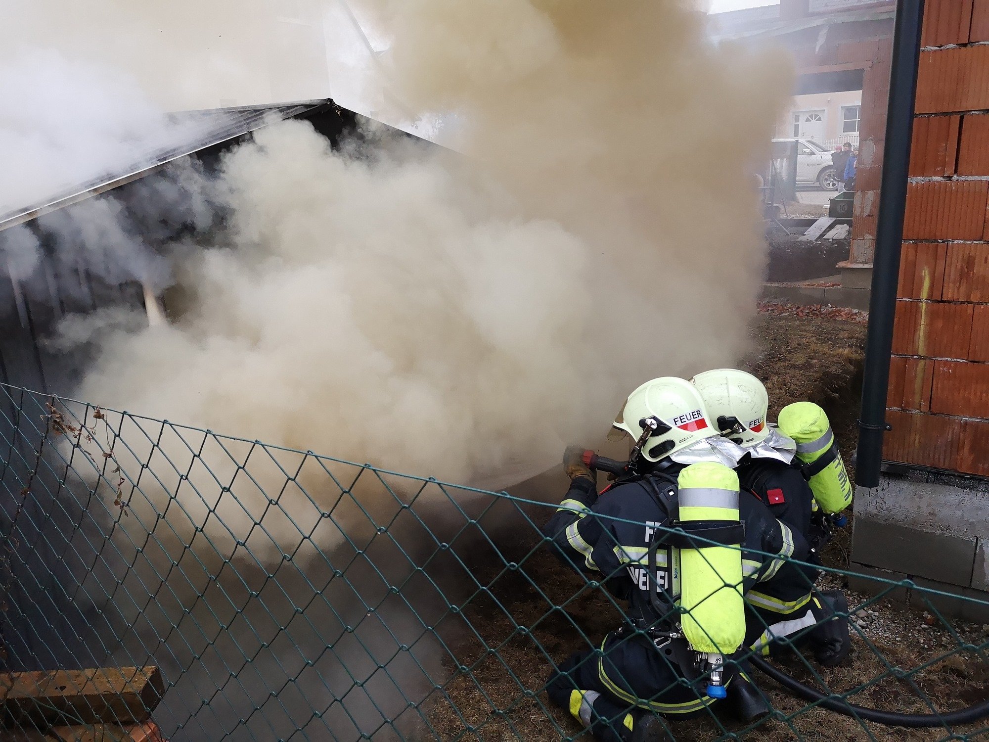 Mit zwei Tanklöschfahrzeugen und einem Kommandofahrzeug rückte die Mannschaft innerhalb von zwei Minuten aus und begab sich zum Einsatzort. Die Erkundung durch Einsatzleiter Branddirektor Brandrat Josef Bugnar und Brandinspektor Norbert Schmidtberger bestätigte die Meldung. Zwei bereits ausgerüstete Atemschutztrupps rückten mit einer Löschleitung vor. Ein Nachbar hielt bis zum Eintreffen der Feuerwehr mit einem Gartenschlauch den Brand in Schach. Die Strahlungshitze führte bereits dazu, dass die angrenzende im Bau befindliche Gartenhütte zu kokeln begann. Der sofortige Angriff des 1. Atemschutztrupps führte rasch zur Entschärfung der Situation.