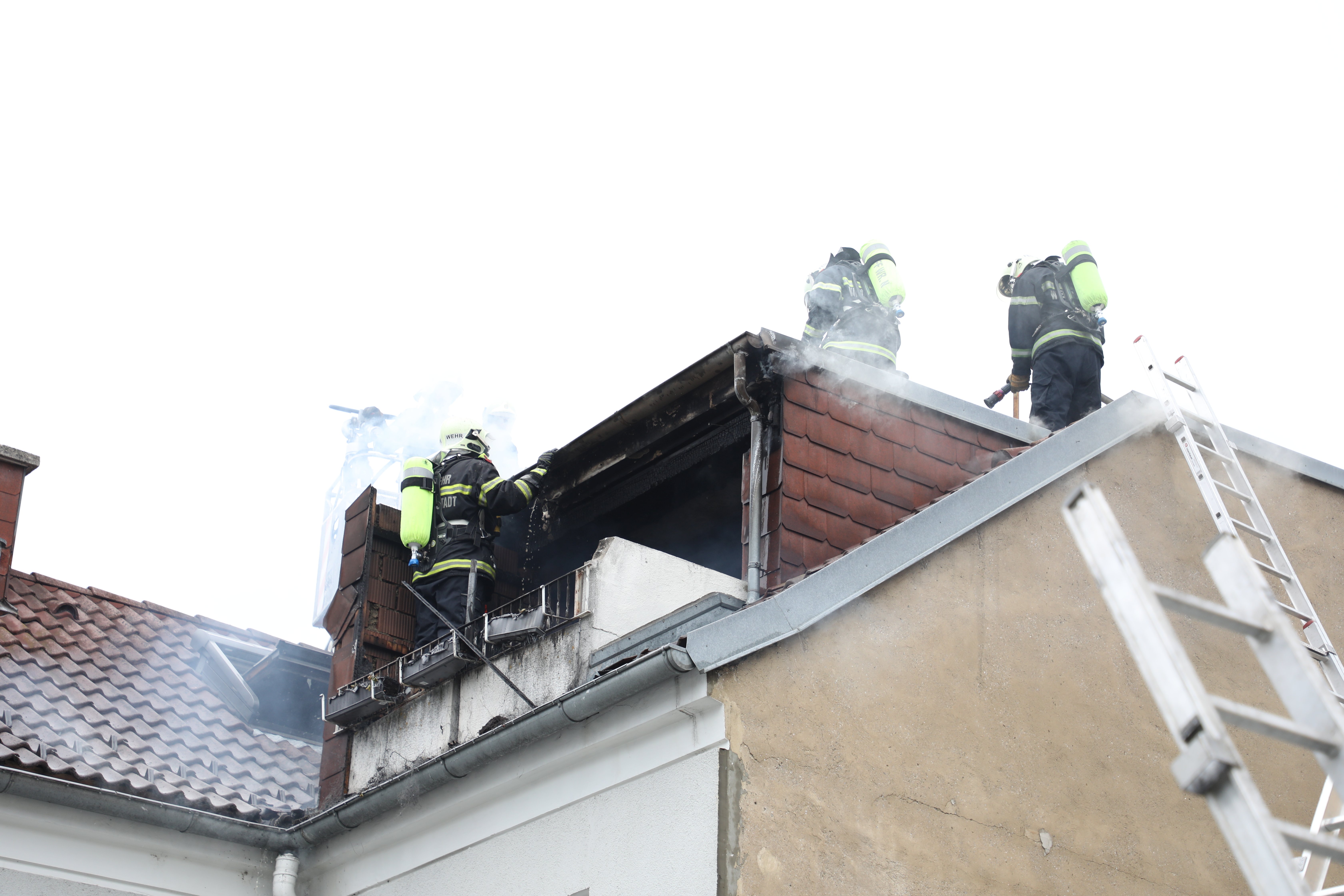 Die Dachhaut aus Blech und Holz wurde durch eine Rettungssäge geöffnet, um den Brand auch mit einem Strahlrohr bekämpfen zu können. Kurze Zeit später wurde der Dachausbau geräumt, weil die Dachkonstruktion rund um den Kamin durch den Brand und die Öffnungen zu instabil wurde. Die weitere Brandbekämpfung konnte von Innen weitergeführt werden. Kurz darauf konnte „Brand aus“ gegeben werden