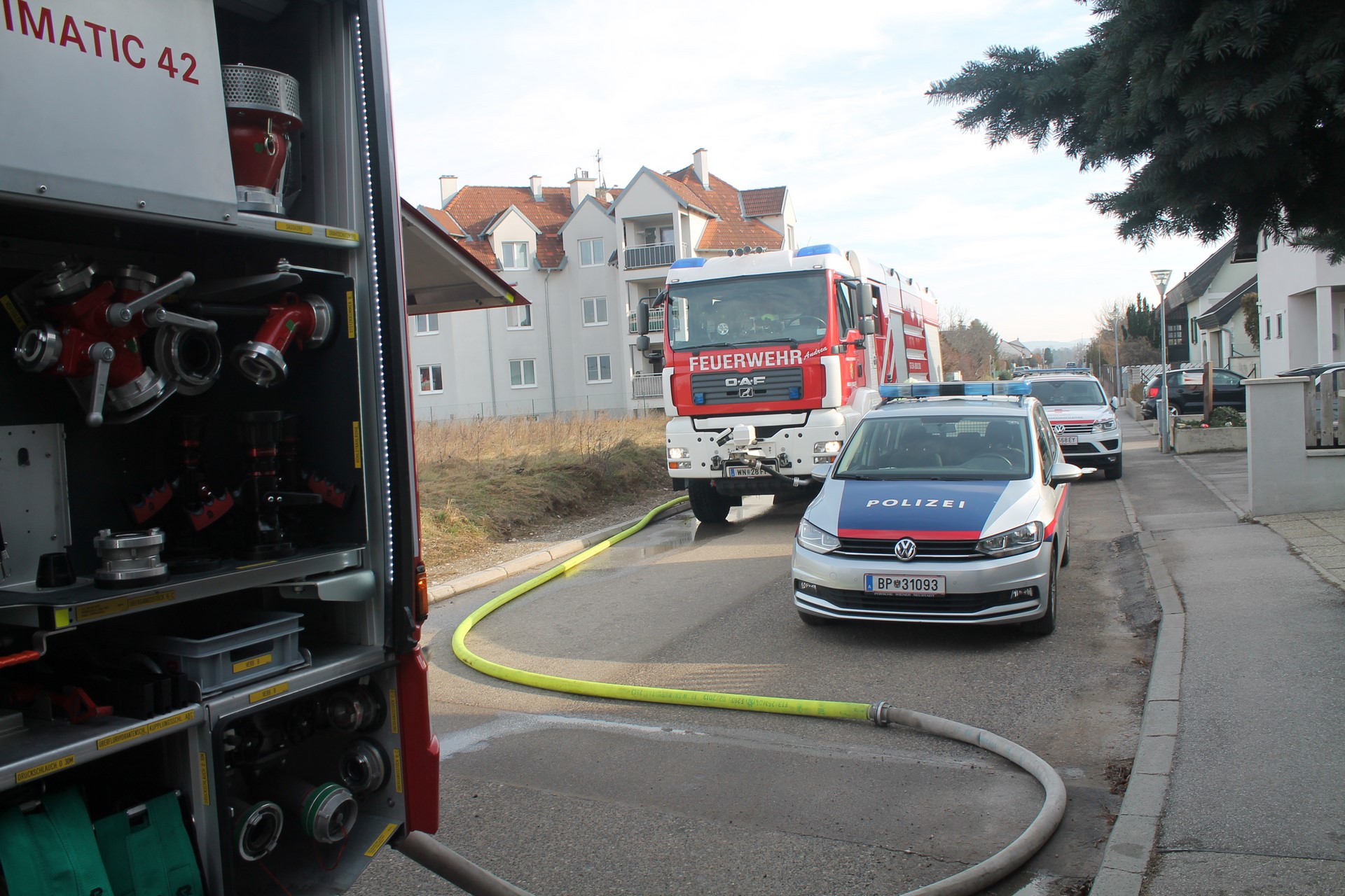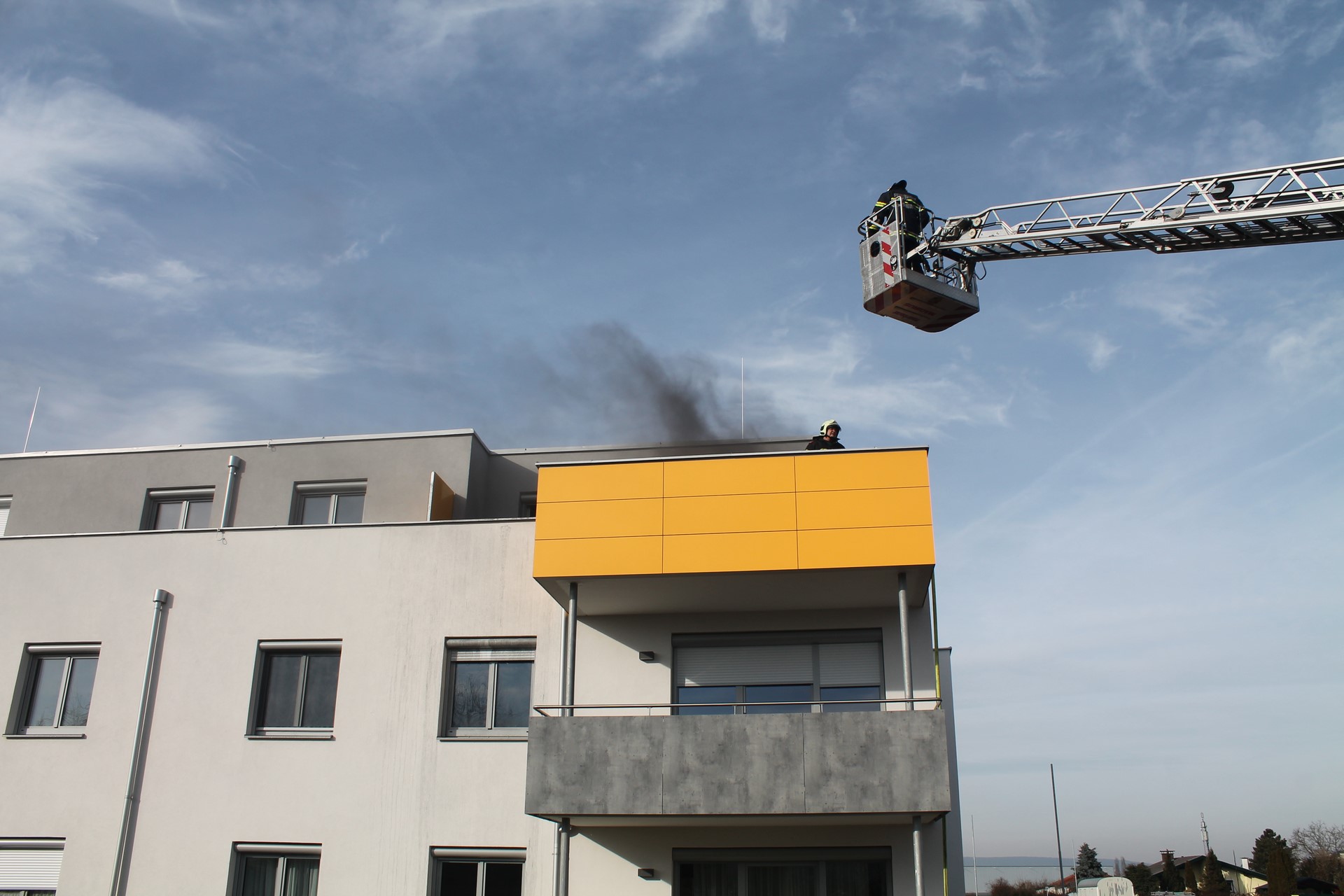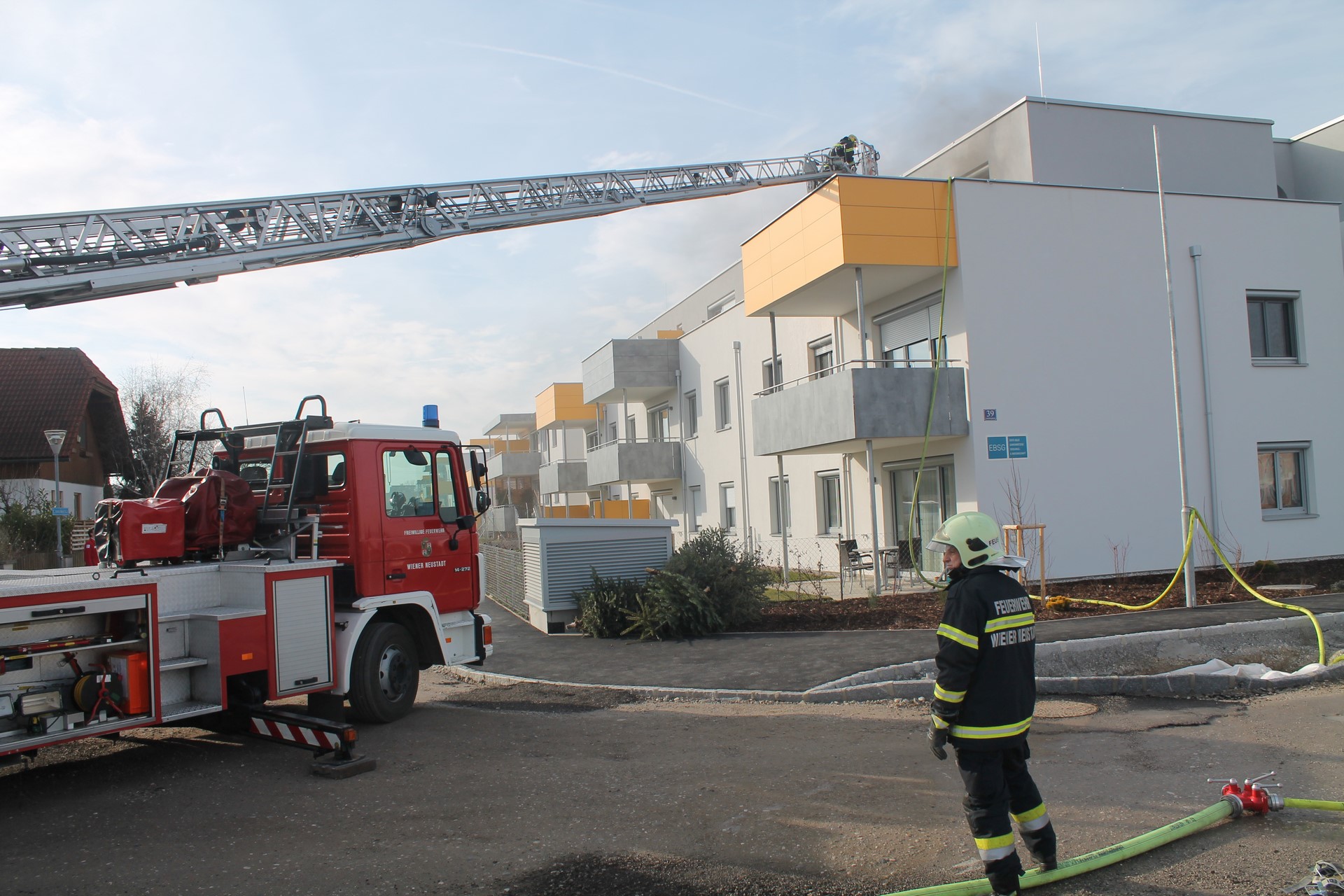 Vor Ort eingetroffen erkundete der Einsatzleiter BR Josef Bugnar die Lage und wies die nachtreffenden Kräfte ein. Der Trupp des ersten eingetroffenen Tanklöschfahrzeuges ging über das Stiegenhaus mit einer Leitung zur Brandwohnung vor. Da der Bau erst vor wenigen Wochen an die Mieter übergeben wurde, war zufällig eine Vertreterin der Baufirma anwesend, welche den Einsatzkräften Zugang zur Wohnung ermöglichte.