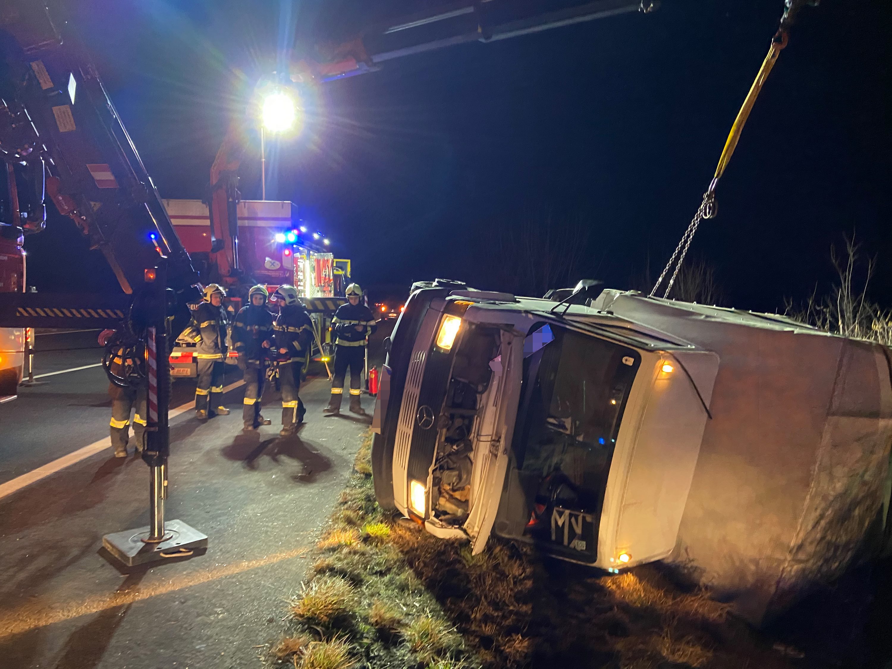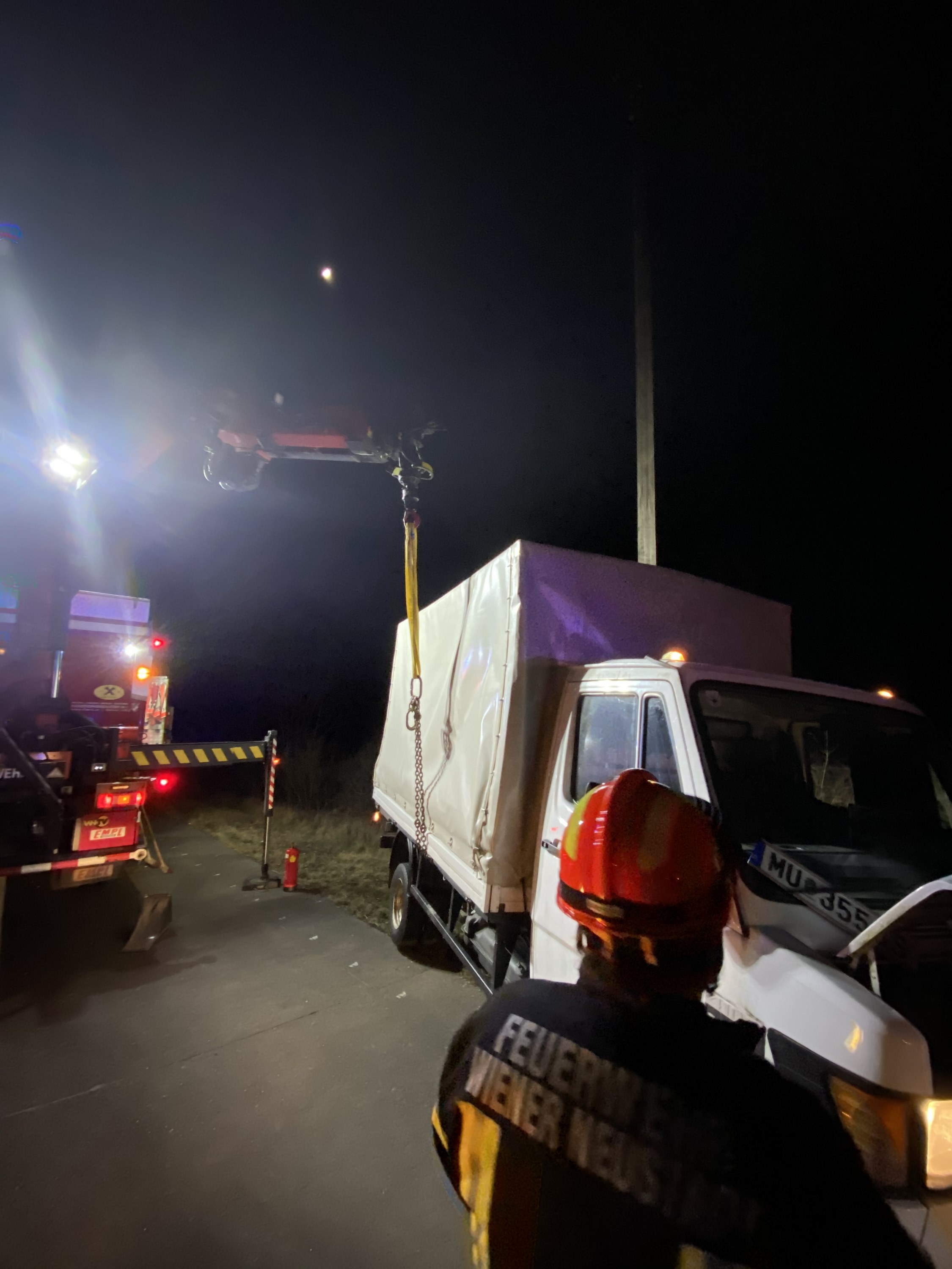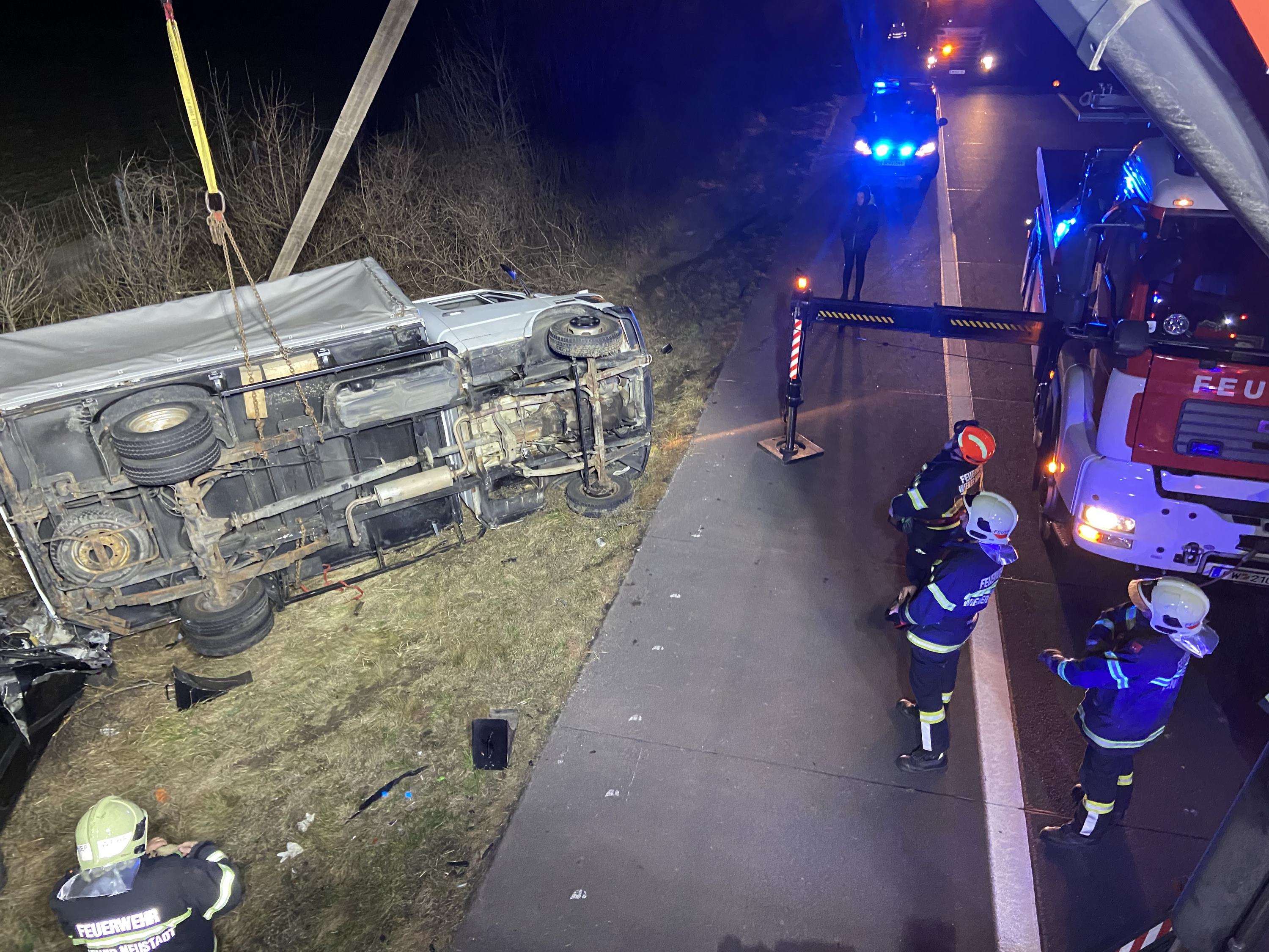 Die Feuerwehr richtete den Klein-Lkw mit den zwei Kränen von Rüst 1 und Last 4 auf und stellte diesen am Fahrbahnrand zur weiteren Bergung durch ein gewerbliches Unternehmen ab. „Heute waren die Schutzengel auf der Südautobahn beschäftigt. Andernorts hatten die Unfallbeteiligten leider nicht so viel Glück“, so Kommandant Josef Bugnar. Die Feuerwehr unterstützte das Unternehmen bei der Abschleppung und sicherte das Abschleppfahrzeug bei der Fahrt ab.