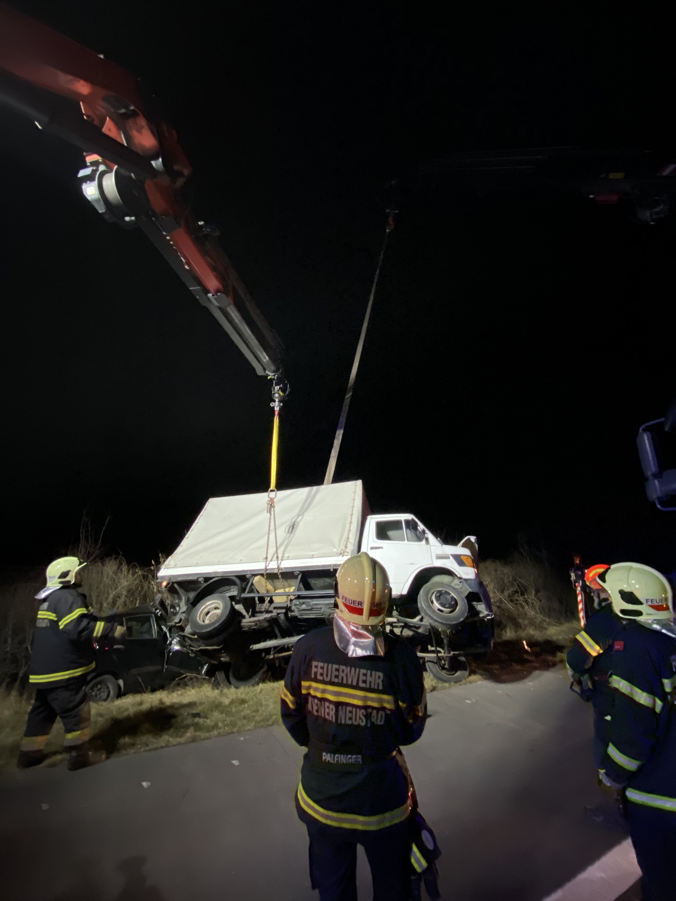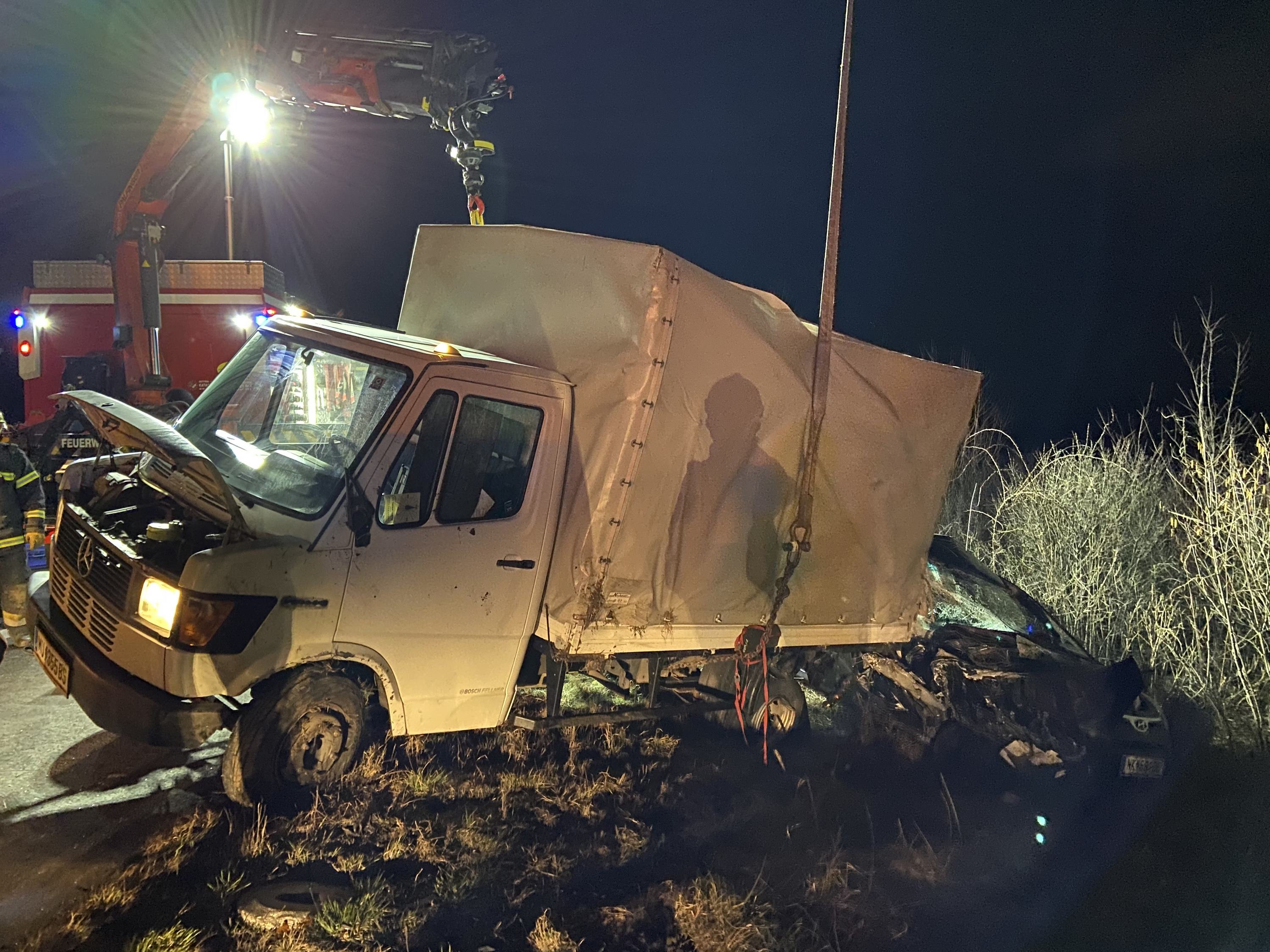 Am Einsatzort angekommen stellte der Einsatzleiter fest, dass keine Menschen in den Fahrzeugen eingeklemmt oder in Gefahr waren. Der Klein-Lkw kam auf dem Pkw auf dessen Beifahrerseite zu liegen. „Wäre hier jemand gesessen, wäre es schlimm ausgegangen“, so einer der Feuerwehrmänner. Wie durch ein Wunder blieben alle Beteiligten unverletzt.