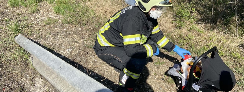 An der Unfallstelle angekommen erkundete der Einsatzleiter und stellte fest, dass die junge Mutter mit einem Kleinkind am Seitenstreifen in Sicherheit, aber sichtlich geschreckt befand. Das Fahrzeug war durch die Wucht des Aufpralls um 180 Grad gedreht gegen die Fahrtrichtung zu stehen gekommen. Zwei Kameraden übernahmen die Betreuung des Kleinkindes und der Mutter bis der Rettungsdienst eintraf. Währenddessen wurde die Unfallstelle durch das nachfolgende Großtanklöschfahrzeug gesichert und die auslaufenden Betriebsmittel gebunden. Im Anschluss auf die Unfallaufnahme durch die Polizei wurde das Fahrzeug von der Feuerwehr zum Autobahnrastplatz Leobersdorf verbracht, von wo es von einem privaten Unternehmen abgeholt werden kann.