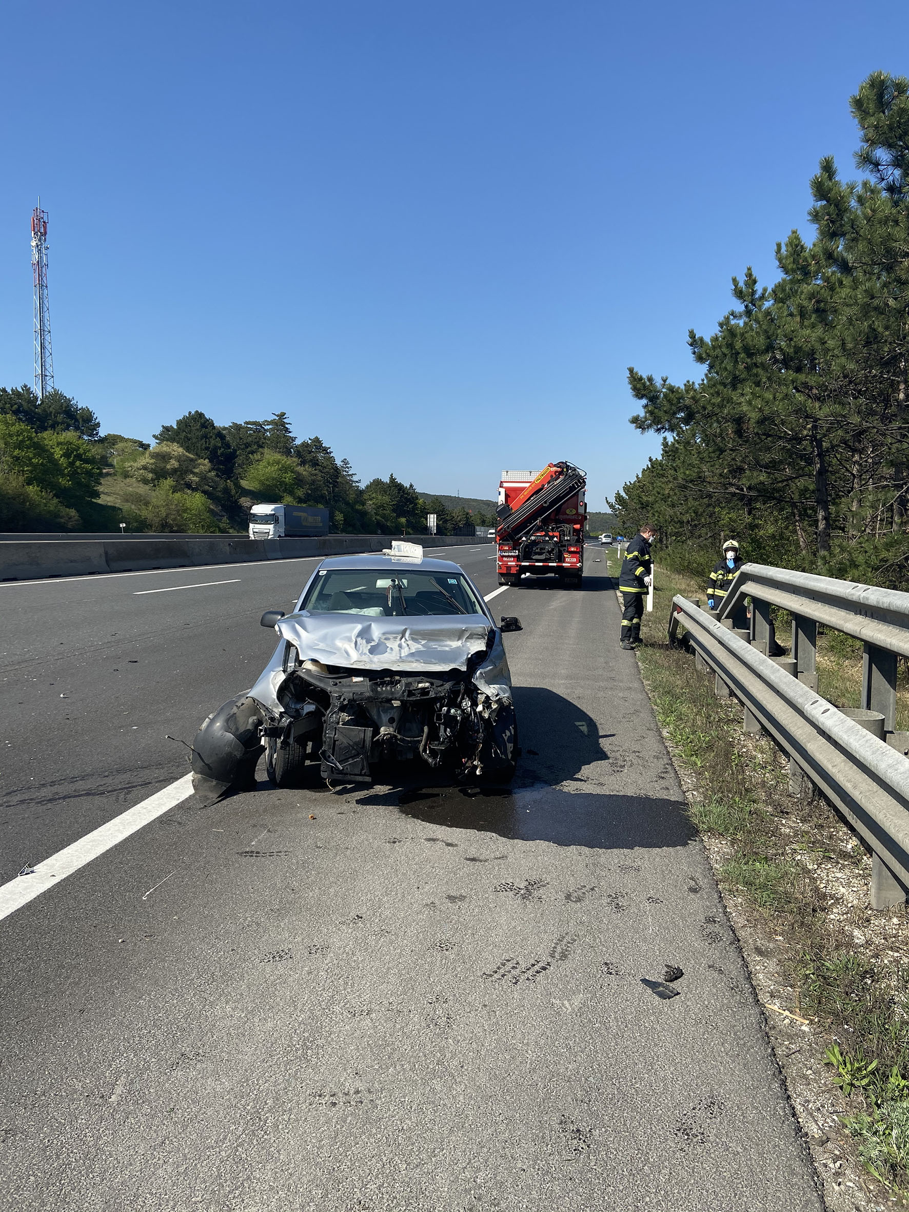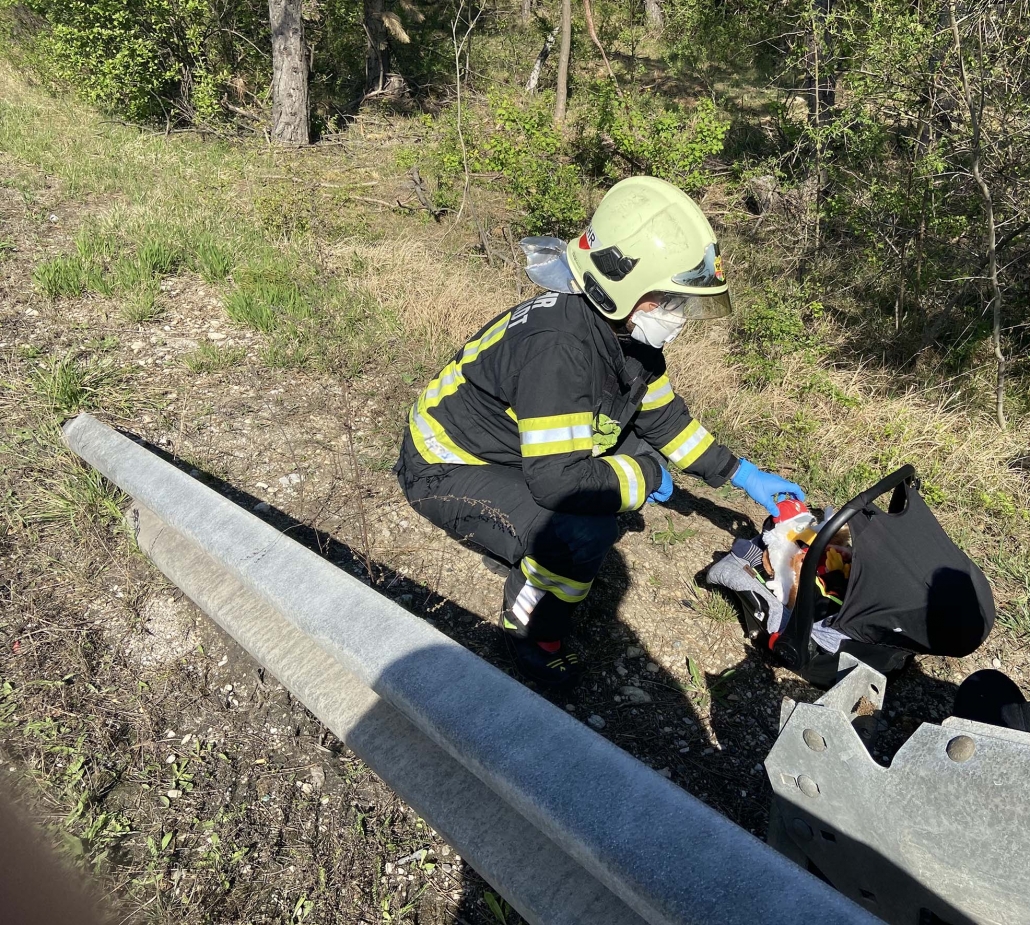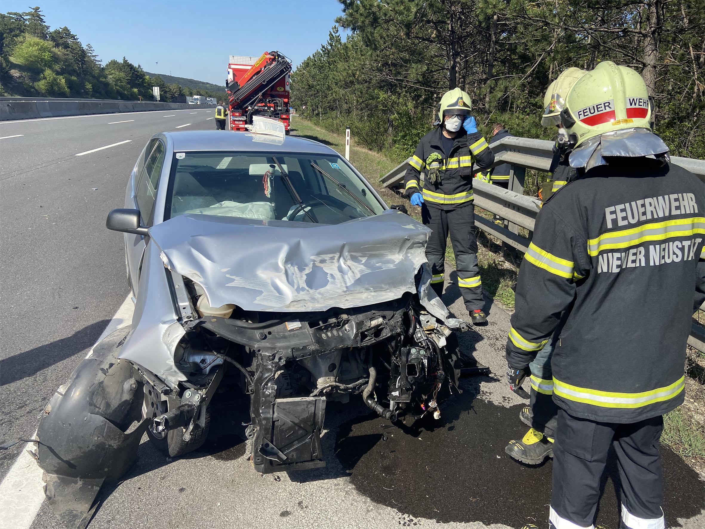 An der Unfallstelle angekommen erkundete der Einsatzleiter und stellte fest, dass die junge Mutter mit einem Kleinkind am Seitenstreifen in Sicherheit, aber sichtlich geschreckt befand. Das Fahrzeug war durch die Wucht des Aufpralls um 180 Grad gedreht gegen die Fahrtrichtung zu stehen gekommen. Zwei Kameraden übernahmen die Betreuung des Kleinkindes und der Mutter bis der Rettungsdienst eintraf. Währenddessen wurde die Unfallstelle durch das nachfolgende Großtanklöschfahrzeug gesichert und die auslaufenden Betriebsmittel gebunden. Im Anschluss auf die Unfallaufnahme durch die Polizei wurde das Fahrzeug von der Feuerwehr zum Autobahnrastplatz Leobersdorf verbracht, von wo es von einem privaten Unternehmen abgeholt werden kann.