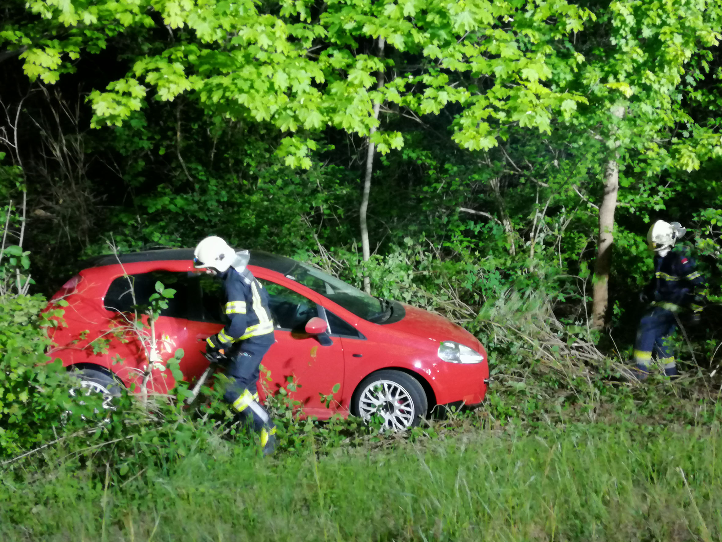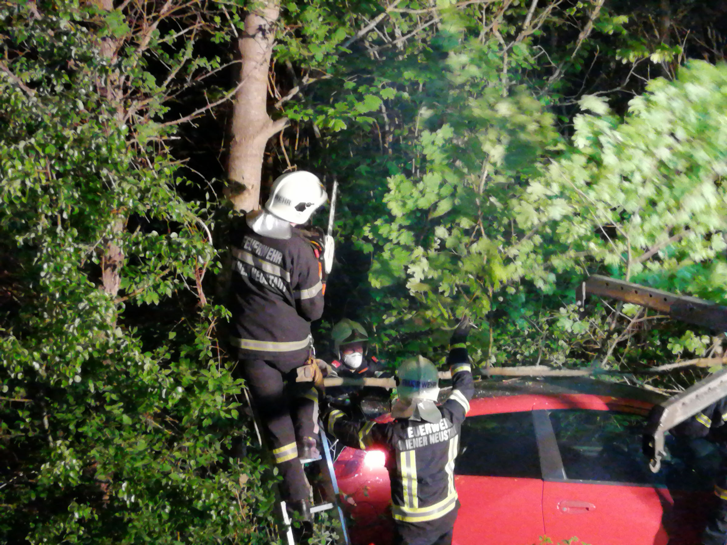 Die Nachtbereitschaft der Freiwilligen Feuerwehr Wiener Neustadt setzte sich sofort in Bewegung und rückte mit einem schweren Rüstfahrzeug und einem Großtanklöschfahrzeug als Absicherungsfahrzeug zum Einsatzort aus. Da der Pkw nahe einer Baumgruppe auf den Rädern zum Stehen kam, konnte der Lenker das Fahrzeug selbst verlassen. Die Einsatzkräfte mussten den Pkw von Geäst befreien um diesen mittels Kran des schweren Rüstfahrzeuges bergen zu können. Das Fahrzeug musste danach zu einem Abstellplatz geschleppt werden.