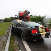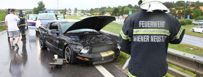 Bei regennasser Fahrbahn verlor am Samstagnachmittag, 12.07., ein 28- jähriger Mustangfahrer aus dem Bezirk Baden die Kontrolle über sein Auto und kollidierte auf der Auffahrtsrampe zur A2 mit den Leitplanken. Der Sportwagen wurde dabei stark beschädigt und blieb fahrunfähig liegen. Der Lenker blieb dabei unverletzt. Das Fahrzeug wurde durch die Feuerwehr von der Rampe geschleppt und auf einem Parkplatz abgestellt.