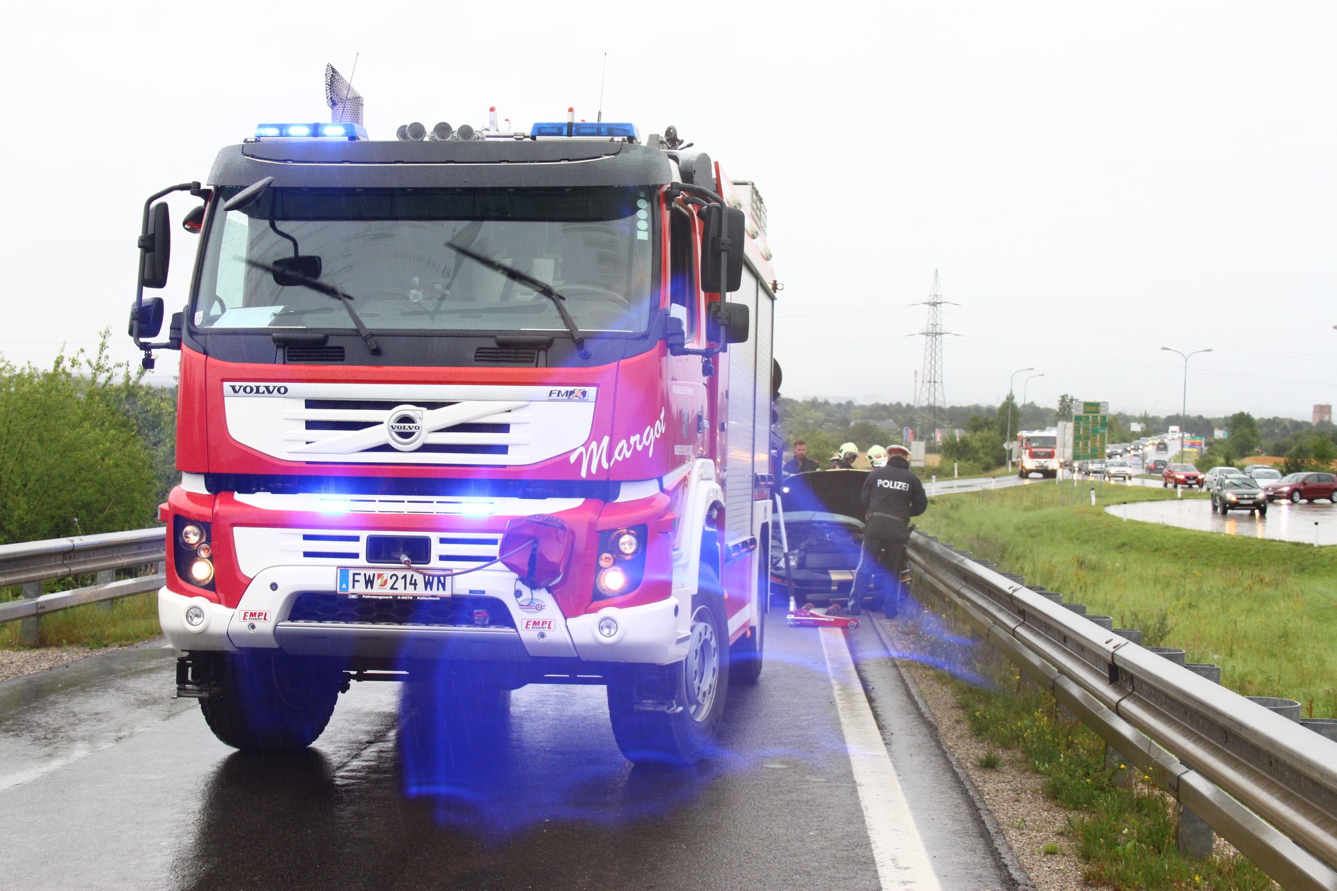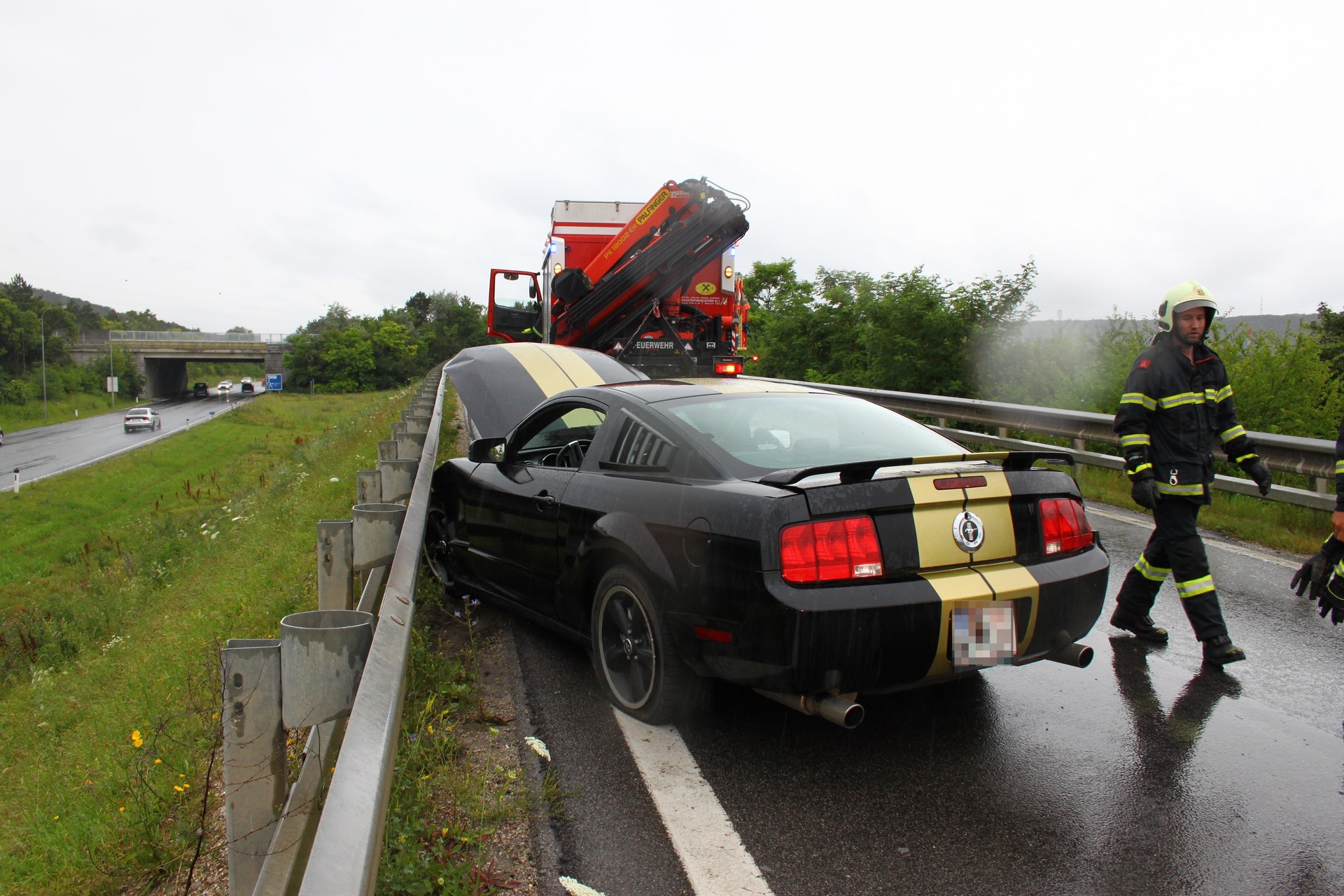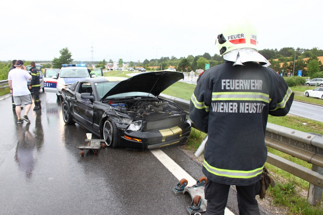 Bei regennasser Fahrbahn verlor am Samstagnachmittag, 12.07., ein 28- jähriger Mustangfahrer aus dem Bezirk Baden die Kontrolle über sein Auto und kollidierte auf der Auffahrtsrampe zur A2 mit den Leitplanken. Der Sportwagen wurde dabei stark beschädigt und blieb fahrunfähig liegen. Der Lenker blieb dabei unverletzt. Das Fahrzeug wurde durch die Feuerwehr von der Rampe geschleppt und auf einem Parkplatz abgestellt.