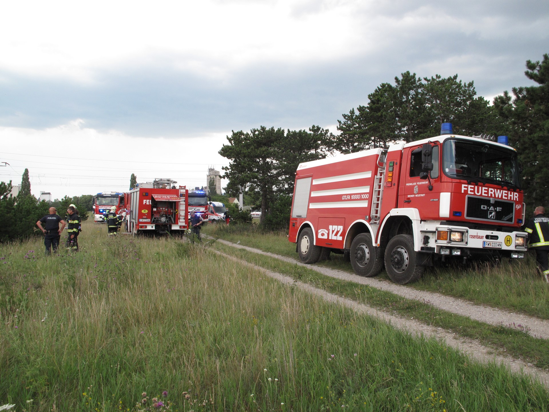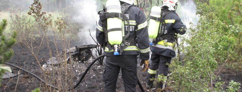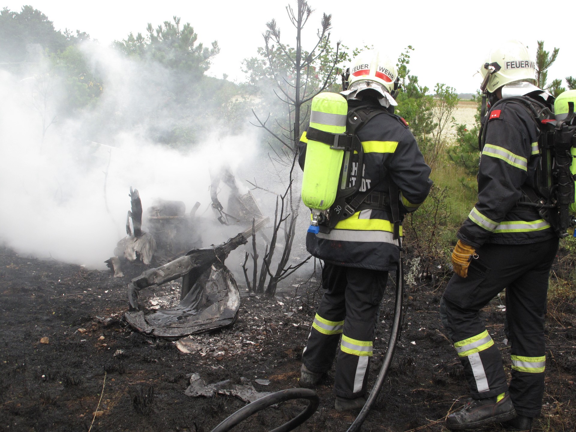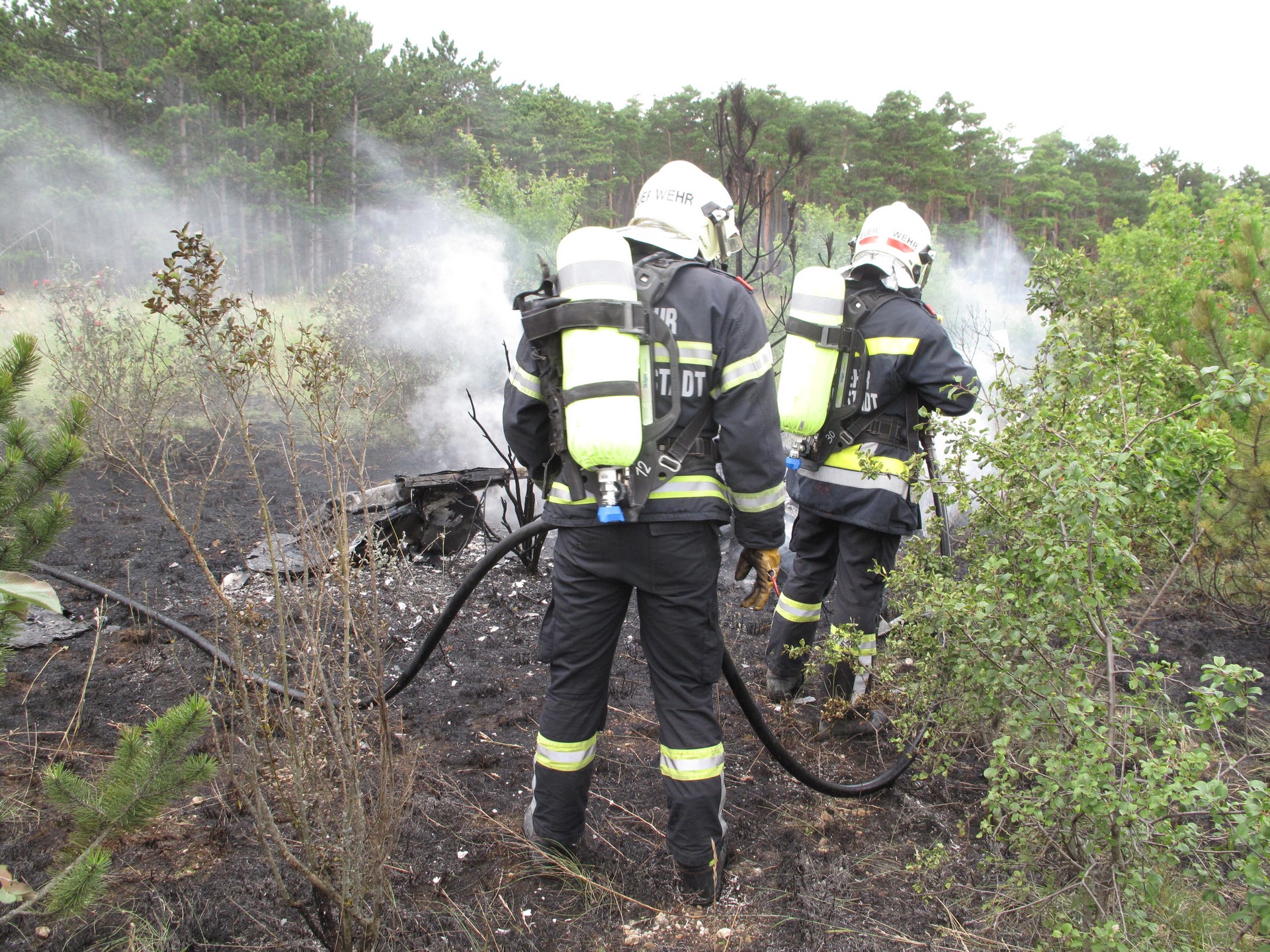 Vor Ort eingetroffen führte die Feuerwehr Wiener Neustadt, welche mit mehreren Fahrzeugen und etwa einem Dutzend Einsatzkräften vor Ort waren, die Brandbekämpfung durch. Durch den Absturz kam es im Bereich der Unglücksstelle zu einem sich rasch ausbreitenden Flur- und Baumbrand.