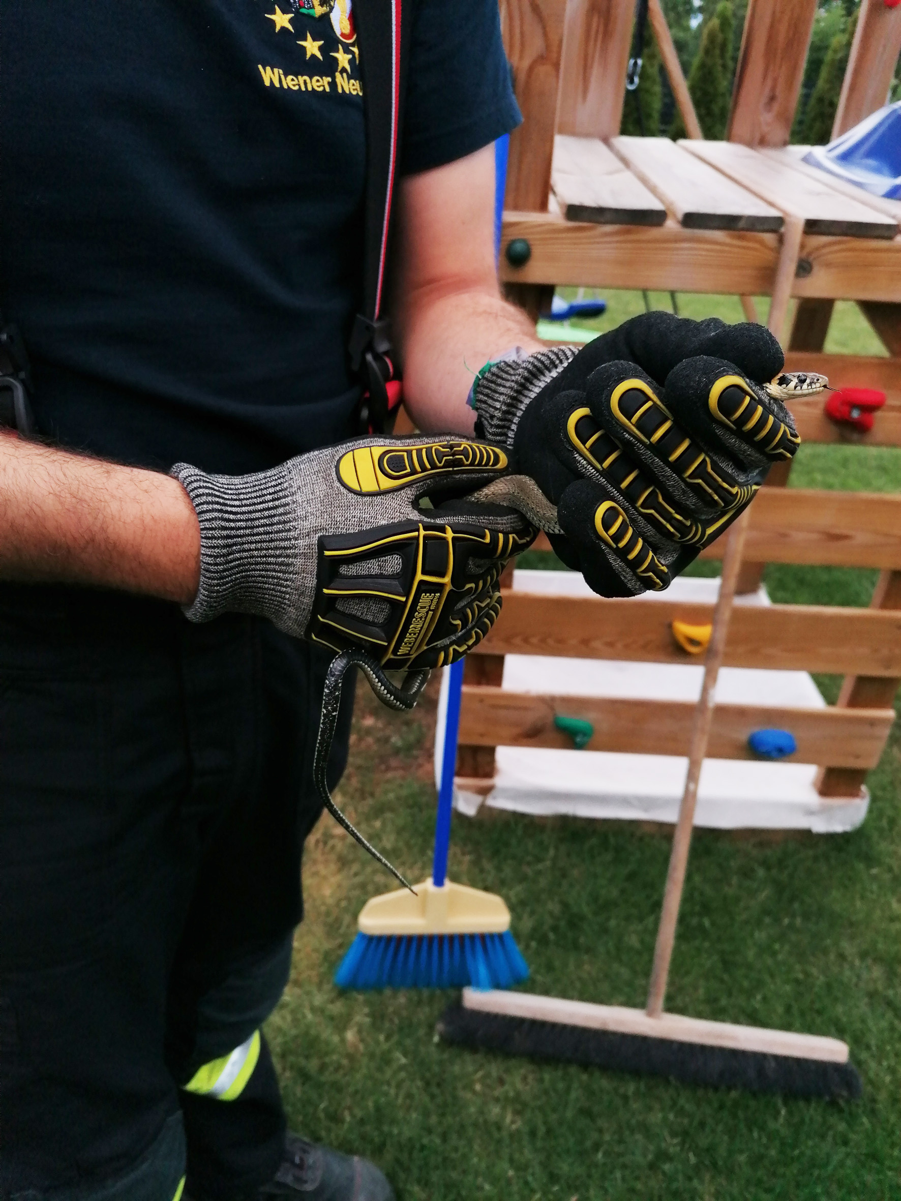 Heimische Schlangen sind keine Seltenheit in Gärten. Unsere heimischen Schlangen sind auch nicht gefährlich, dennoch haben immer wieder Menschen Angst vor den sich schlängelnden Tieren oder man möchte nicht, dass Kinder mit diesen Reptilien in Berührung kommen. Deshalb wurden drei Mann der Sonntagsbereitschaft der Freiwillige Feuerwehr Wiener Neustadt von einer gerade abgeschlossenen Türöffnung zu einem privaten Garten gerufen, wo sich eine Schlange nahe dem Kinderspielturm in einer Tujenhecke an einem Ast hochschlängelte.
