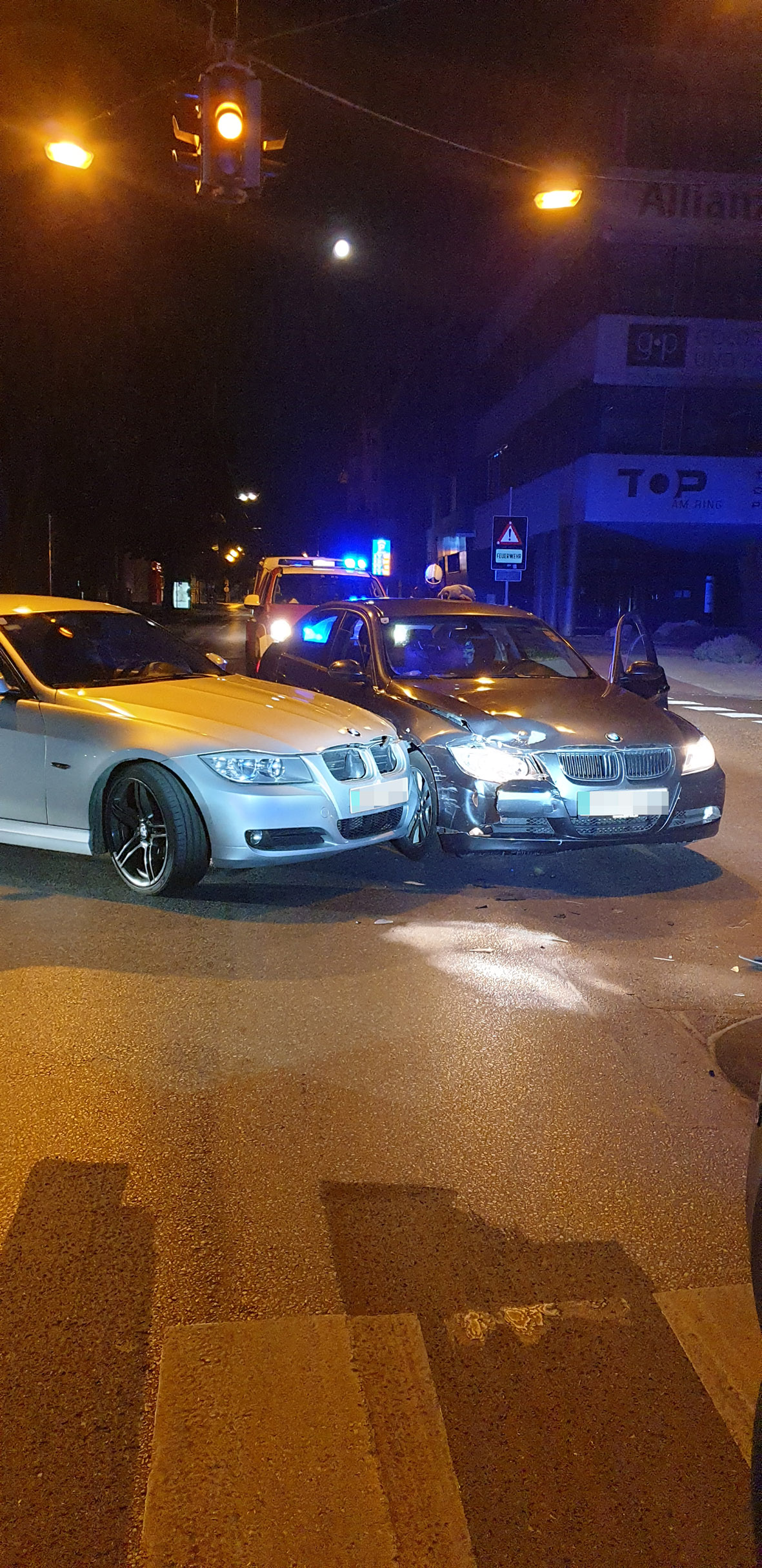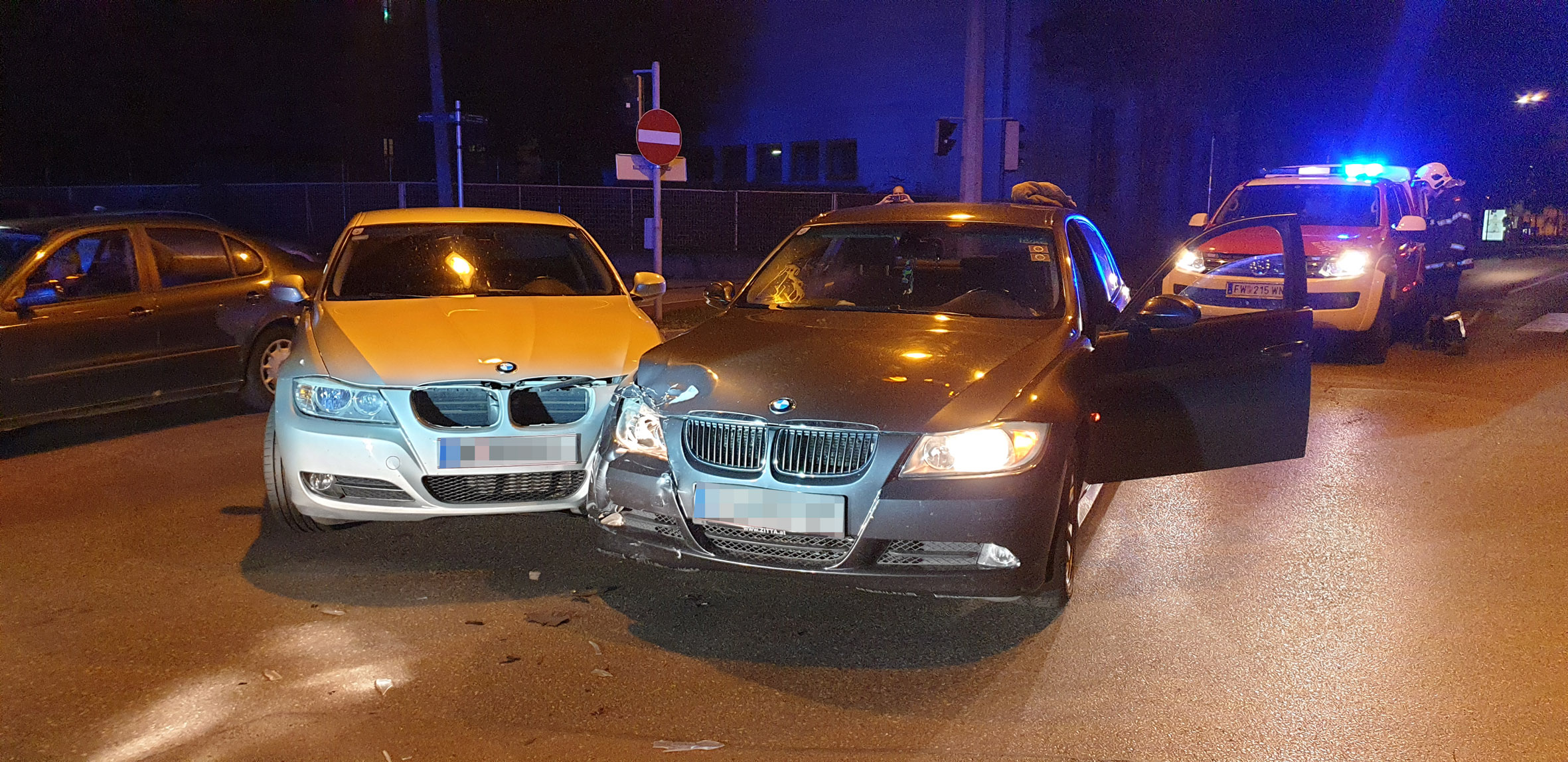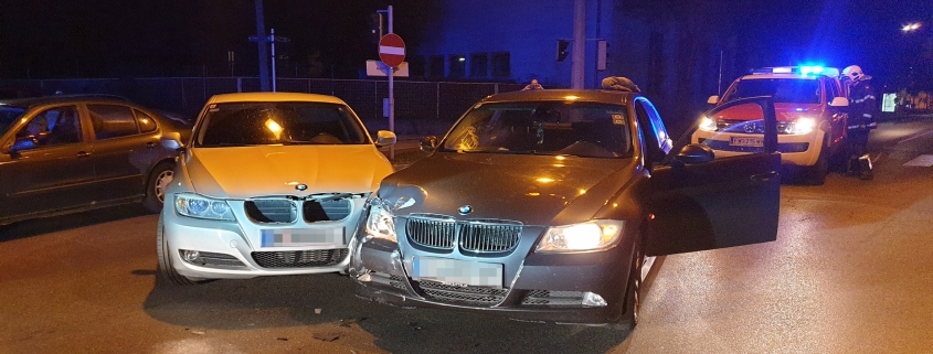 Die Nachtbereitschaft der Freiwilligen Feuerwehr Wiener Neustadt wurde gegen 01:35 Uhr am 4. Juli zu einem Verkehrsunfall am Babenbergerring gerufen. Zwei BMW kollidierten mitten auf der Straße.
