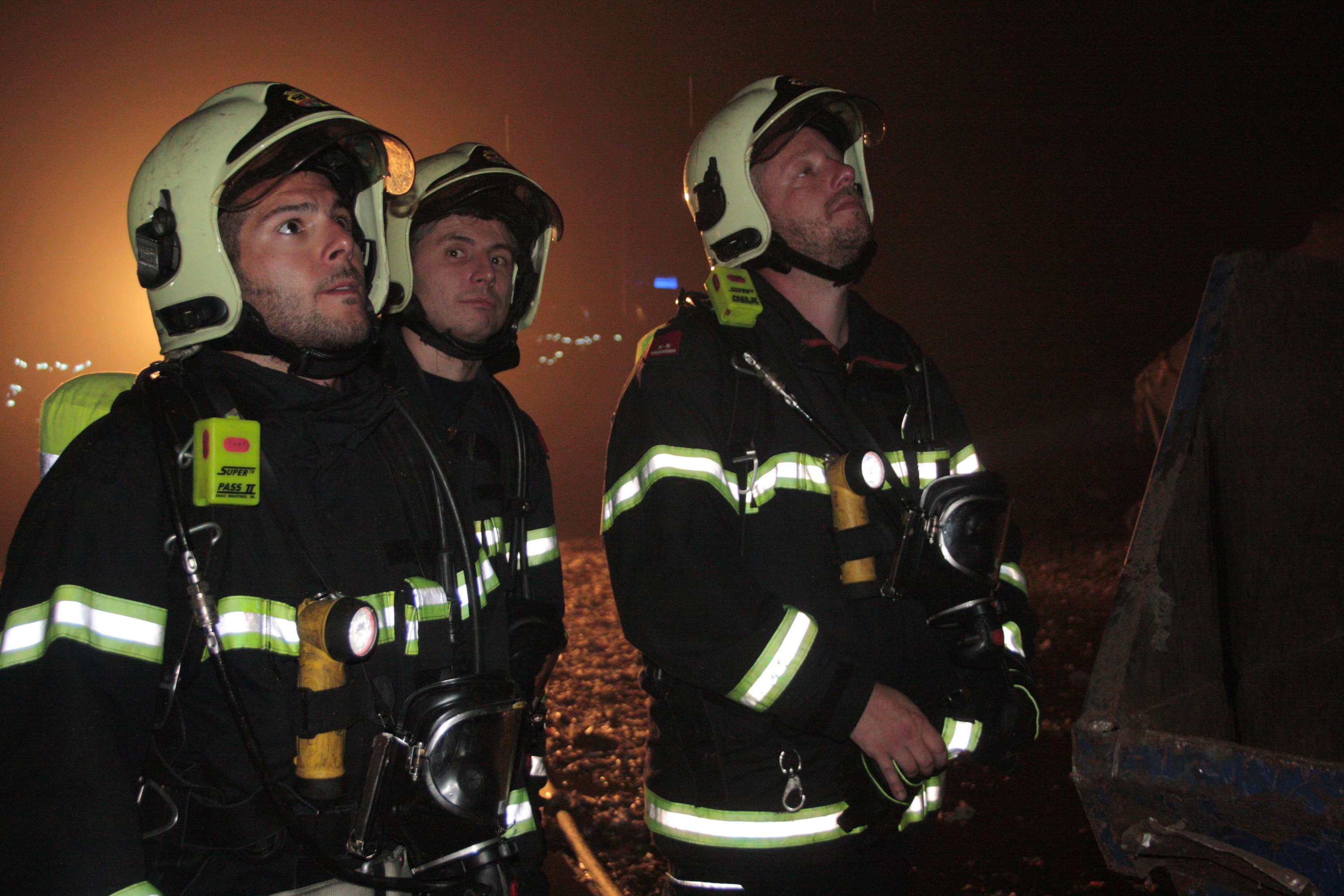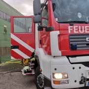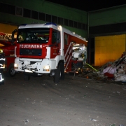 Die ersteintreffende Mannschaft begann mit schwerem Atemschutz ausgerüstet Sekundärbrände zu bekämpfen, um zur Maschine vordringen zu können. Der Dichte Rauch, welcher vom brennenden Kunststoff ausging, behinderte den Einsatz, weshalb der Löschunterstützungsanhänger in Stellung gebracht werden musste. Damit konnte der Rauch so weit aus der Halle gedrückt werden, dass mit dem Entfernen der Kunststoffteilchen rund um die Maschine begonnen werden konnte. „Zunächst wurde die gesamte Maschine über die dafür vorhandenen Punkte geflutet“, so Einsatzleiter Brandrat Christian Pfeiffer.