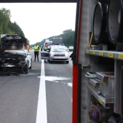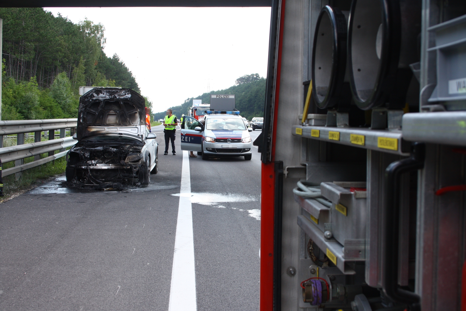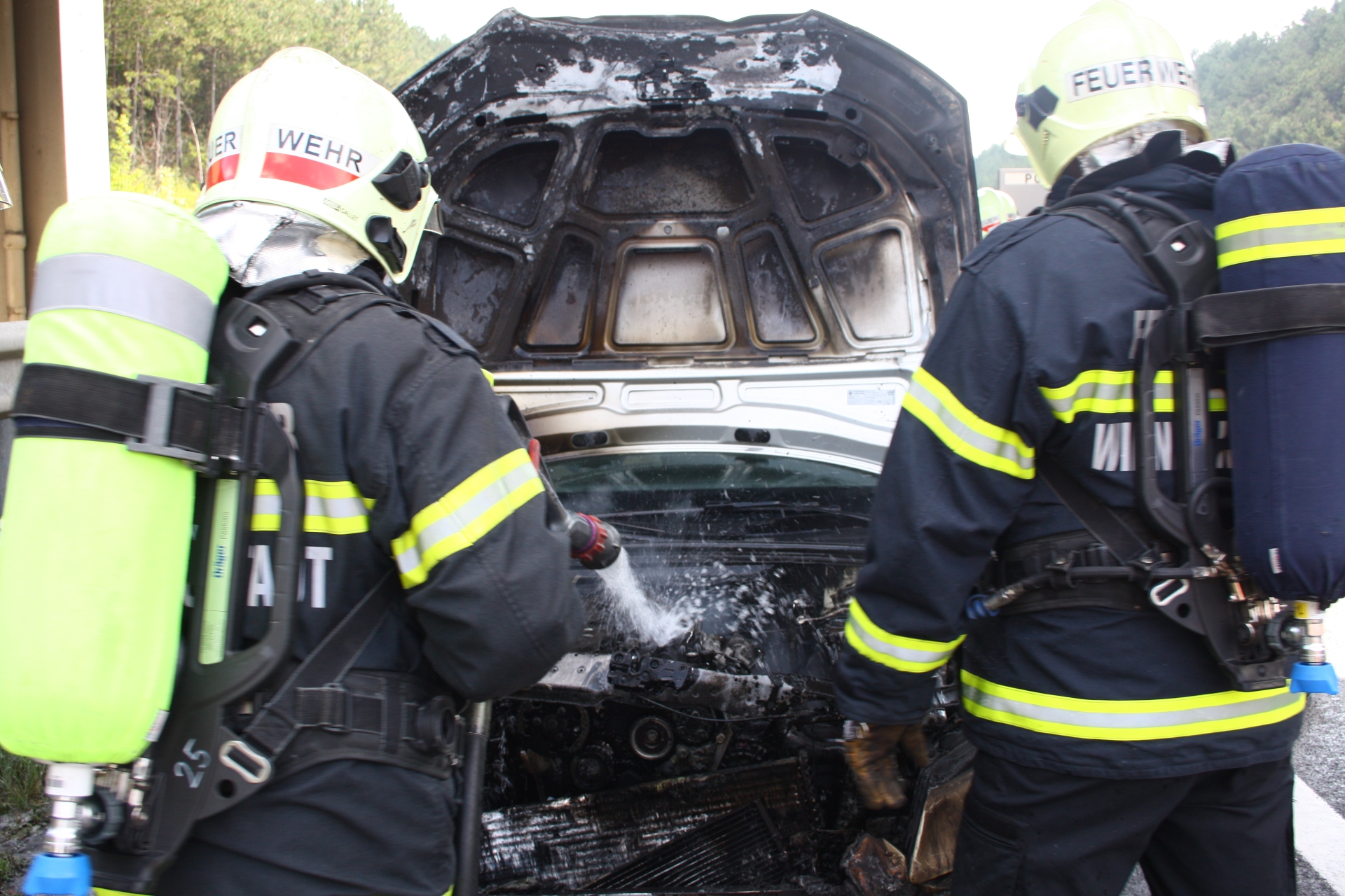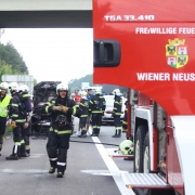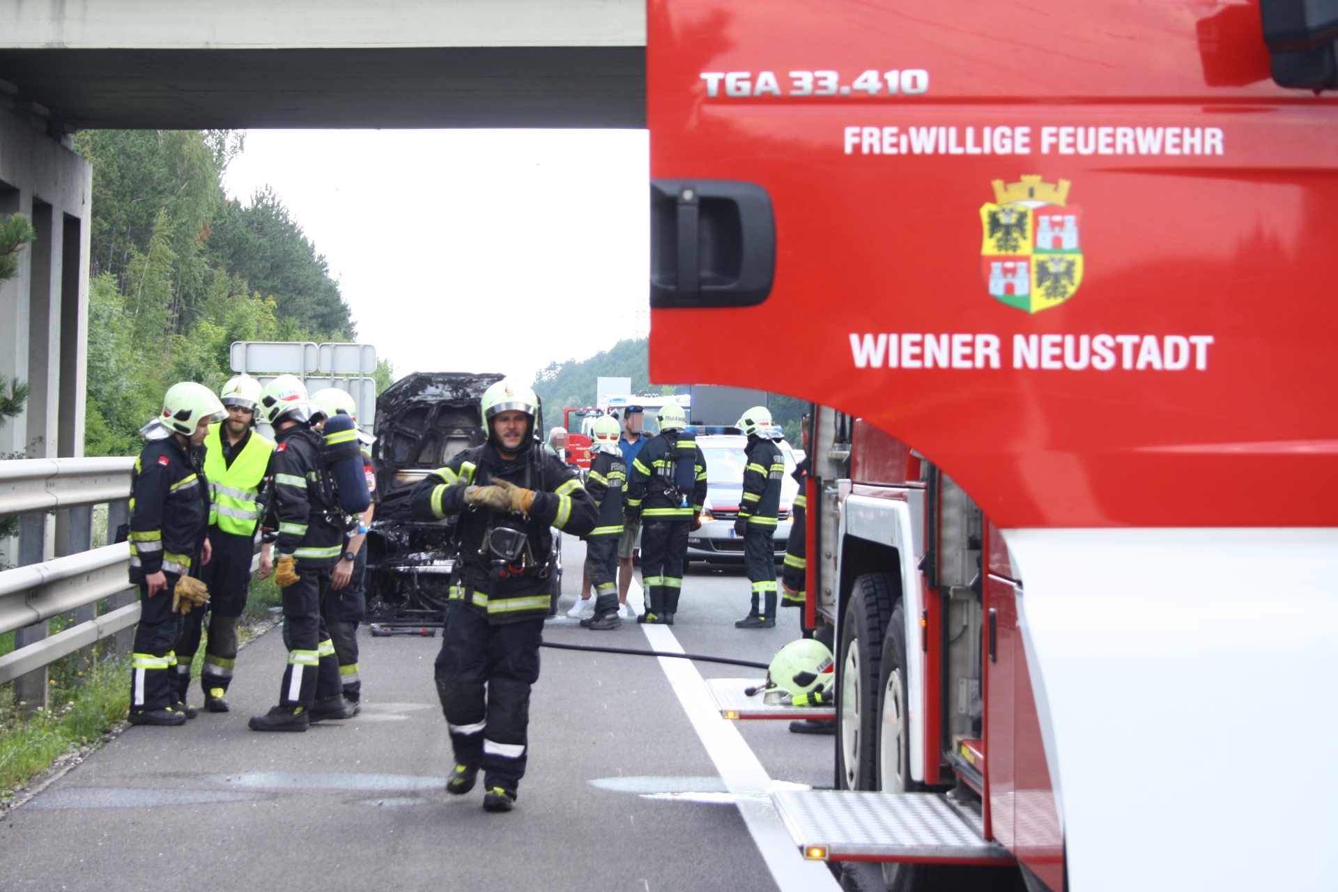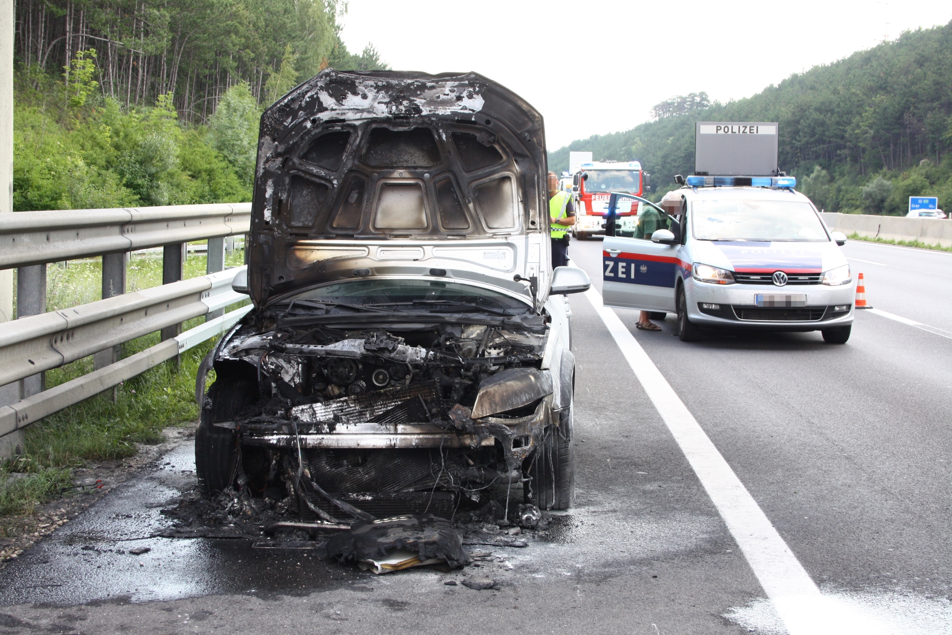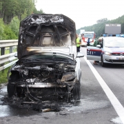 Zu einem Fahrzeugbrand auf die A2 rückte die Feuerwehr Wiener Neustadt am Samstagnachmittag, 08.08., aus. Gegen 14.45 Uhr wurde die Feuerwehr durch mehrere Autolenker verständigt, dass in Fahrtrichtung Wien aus dem Motorblock eines Audis Rauch und Flammen schlagen. Obwohl sich der Brand bis zum Eintreffen der Feuerwehr bereits auf den gesamten Motorblock und Teile des Innenraums ausgebreitet hatte, verhinderten erste Löschmaßnahmen von nachfolgenden Autolenkern mittels Handfeuerlöschern den Vollbrand des Pkws. Der Restbrand konnte rasch mittels Hochdruckrohr gelöscht werden. Am Audi entstand dennoch Totalschaden. Das Fahrzeug wurde nach den Löschmaßnahmen von einem Privatunternehmen abtransportiert. Verletzt wurde niemand.