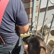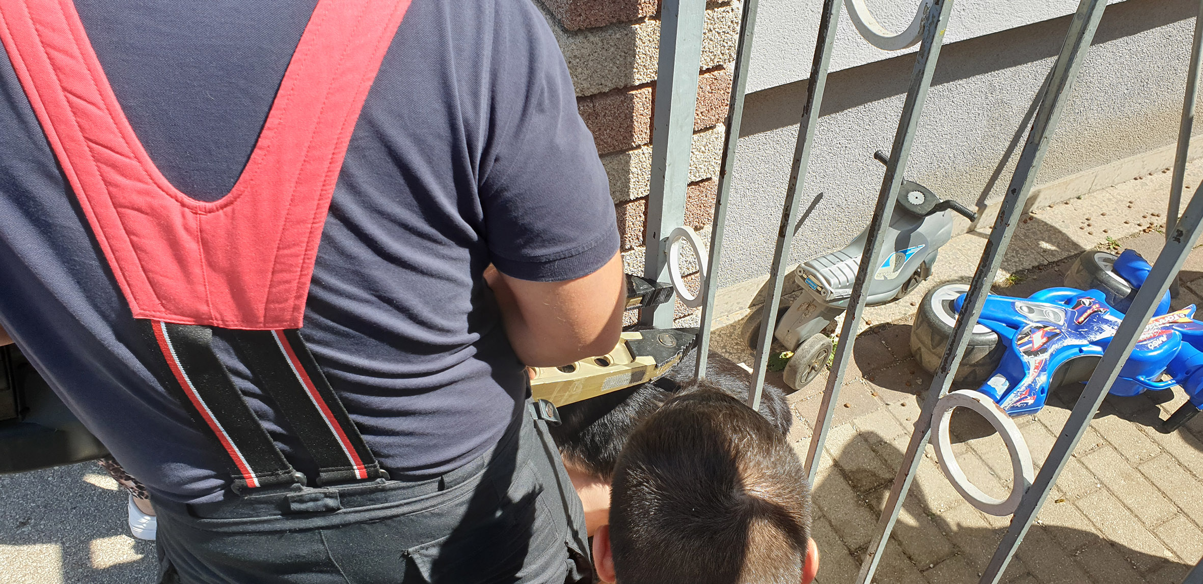 Die zufällig im Haus anwesende Mannschaft rückte unverzüglich zur „Tierrettung“ aus. Am Einsatzort angekommen übernahm ein Kamerad die Betreuung von Hund und Frauerl, während die übrigen Kameraden das Gartentor begutachteten. Der Einsatzleiter entschied mit dem hydraulischen Spreizer die Stäbe gerade so weit auseinander zu drücken, dass Luna sich befreien kann.