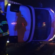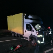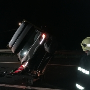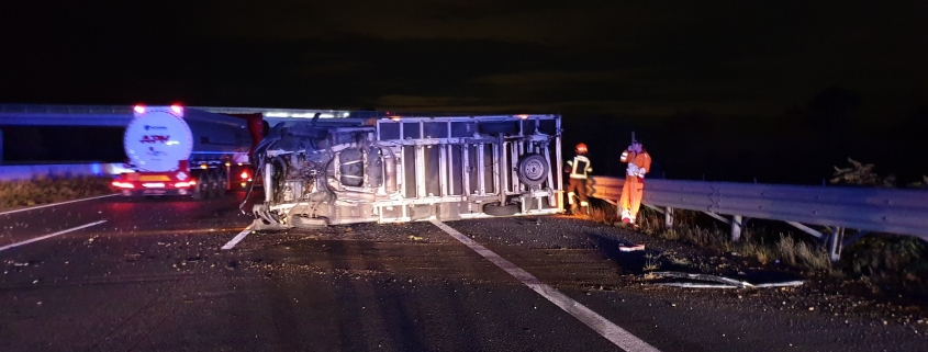 Ein Kleinlastwagen stürzte am Montag, 2.11.2020, aus unbekannter Ursache auf der A2 Südautobahn in Fahrtrichtung Wien um. Die Feuerwehr Wiener Neustadt rückte mit der Hausmannschaft und der alarmierten Bereitschaftsgruppe zur Unfallstelle aus.