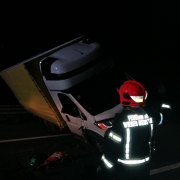 Am Einsatzort angekommen bot sich der Feuerwehr folgende Lage: Ein Klein-Lkw lag über die erste Spur und den Pannenstreifen, Trümmerteile lagen verstreut über die gesamte Fahrbahn und alle Fahrspuren. Der Fahrer wurde bereits vom Roten Kreuz versorgt. Nach Freigabe des Einsatzortes durch die Exekutive wurden zwei Fahrzeuge der Feuerwehr mit Seilwinden in Stellung gebracht und das Unfallfahrzeug wurde auf die Räder gestellt.