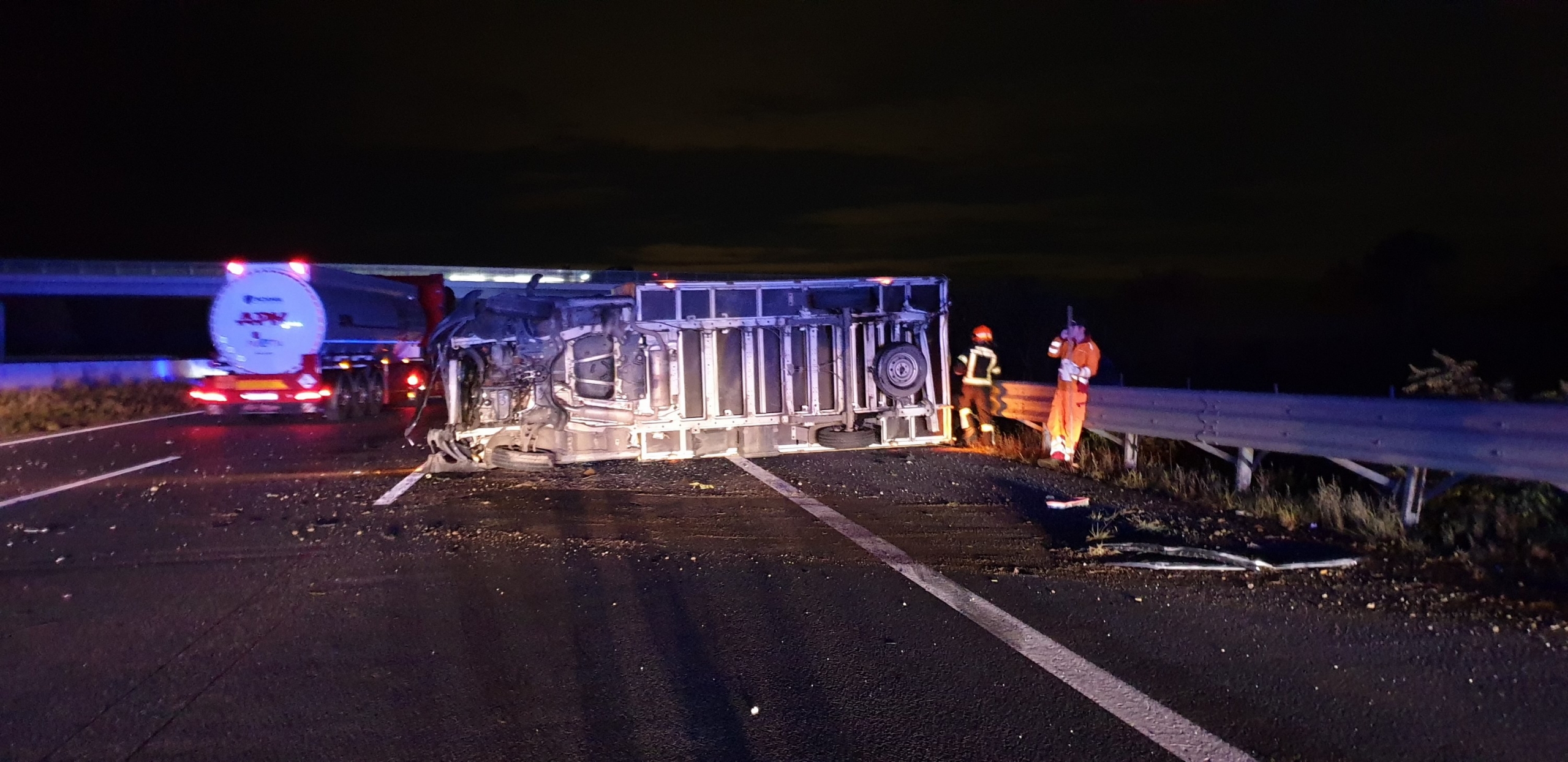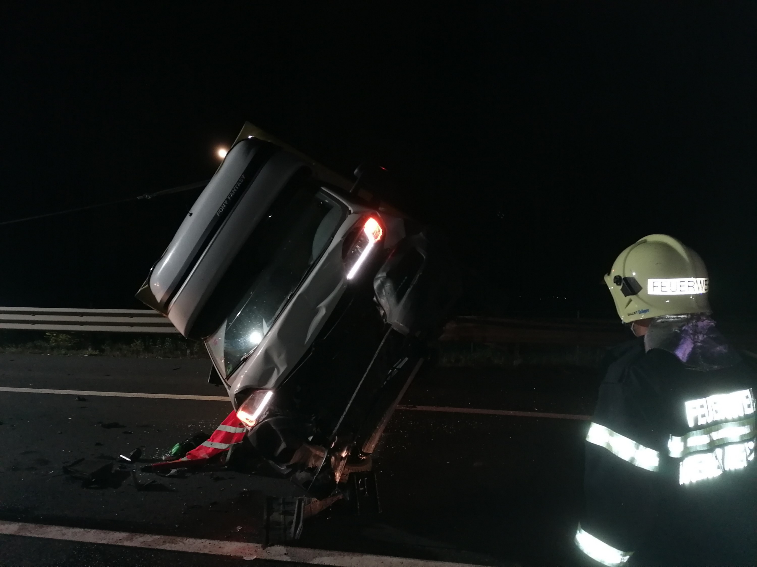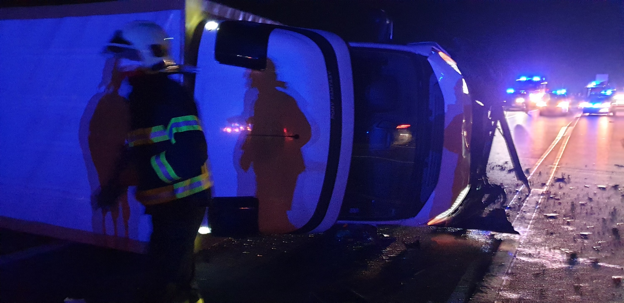 Ein Kleinlastwagen stürzte am Montag, 2.11.2020, aus unbekannter Ursache auf der A2 Südautobahn in Fahrtrichtung Wien um. Die Feuerwehr Wiener Neustadt rückte mit der Hausmannschaft und der alarmierten Bereitschaftsgruppe zur Unfallstelle aus.