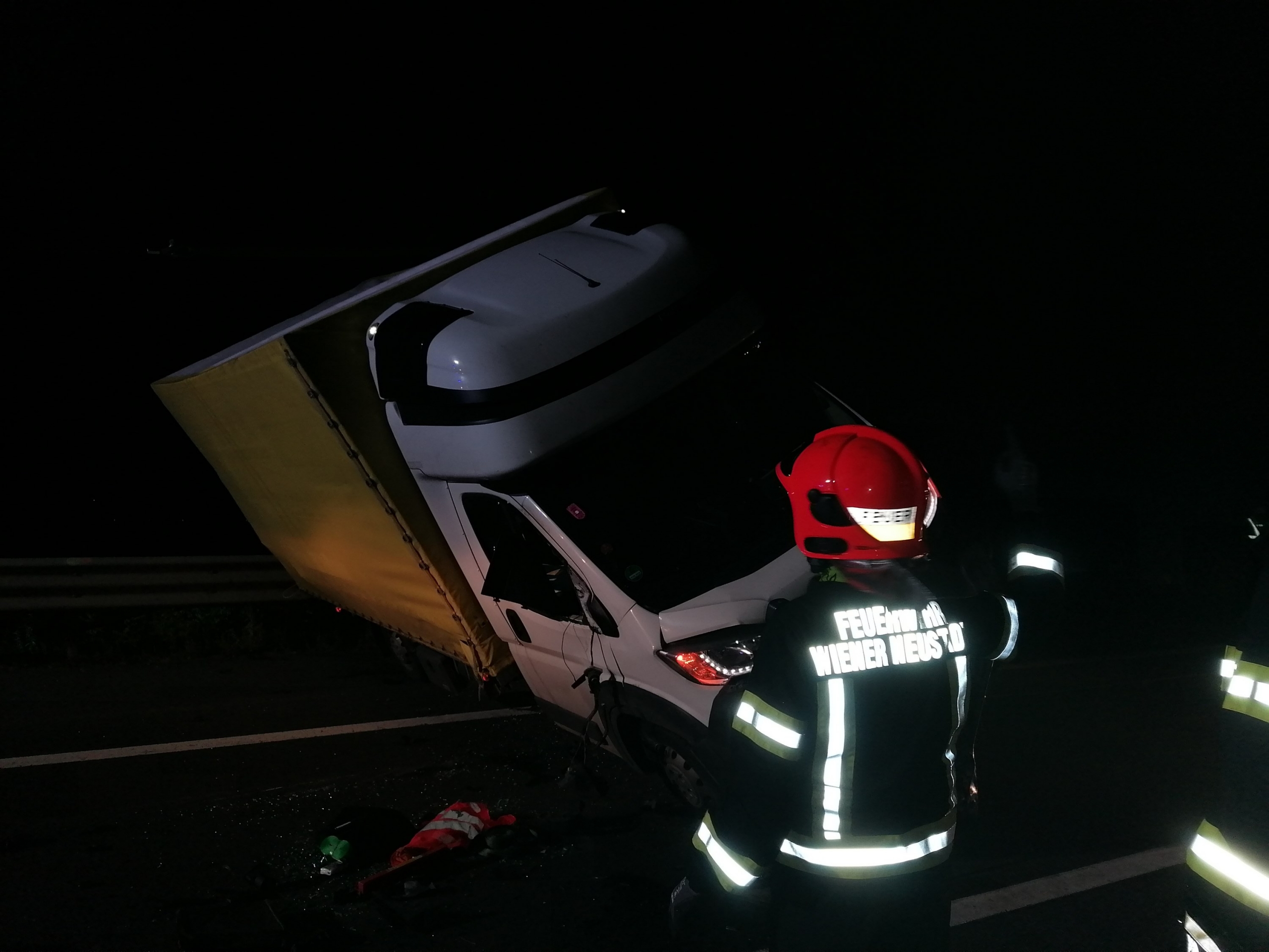 Am Einsatzort angekommen bot sich der Feuerwehr folgende Lage: Ein Klein-Lkw lag über die erste Spur und den Pannenstreifen, Trümmerteile lagen verstreut über die gesamte Fahrbahn und alle Fahrspuren. Der Fahrer wurde bereits vom Roten Kreuz versorgt. Nach Freigabe des Einsatzortes durch die Exekutive wurden zwei Fahrzeuge der Feuerwehr mit Seilwinden in Stellung gebracht und das Unfallfahrzeug wurde auf die Räder gestellt.
