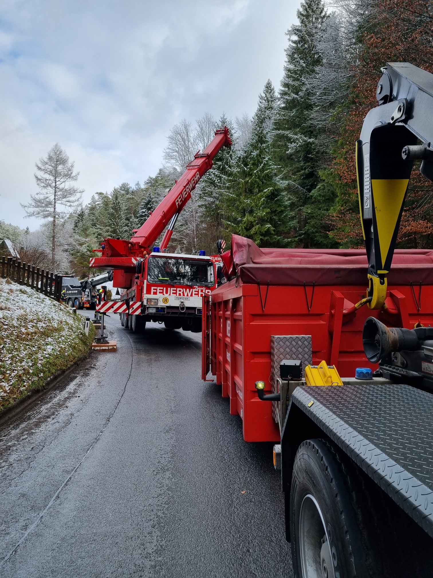 Vor Ort stellte sich für die Bergemannschaft heraus, dass der Sattelschlepper ohne größere Beschädigungen lediglich im schlammigen Straßengraben festsaß. Während der Sattelaufleger mit dem Kranfahrzeug angehoben wurde, konnte die stecken gebliebene Zugmaschine durch ein Bergefahrzeug einer anwesenden Privatfirma aus dem Graben gezogen werden.