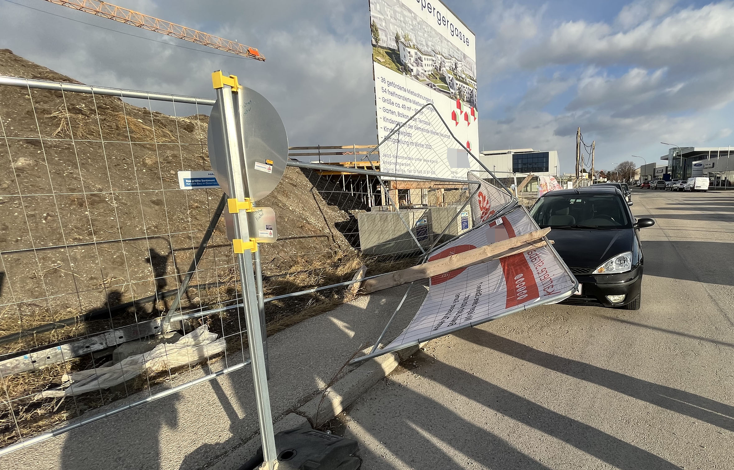 Ein Bauzaun wurde in der Luchsbergergasse auf einen parkenden Pkw geweht. Die Feuerwehr sicherte den Bauzaun und die Polizei nahm den Schaden am Pkw auf.