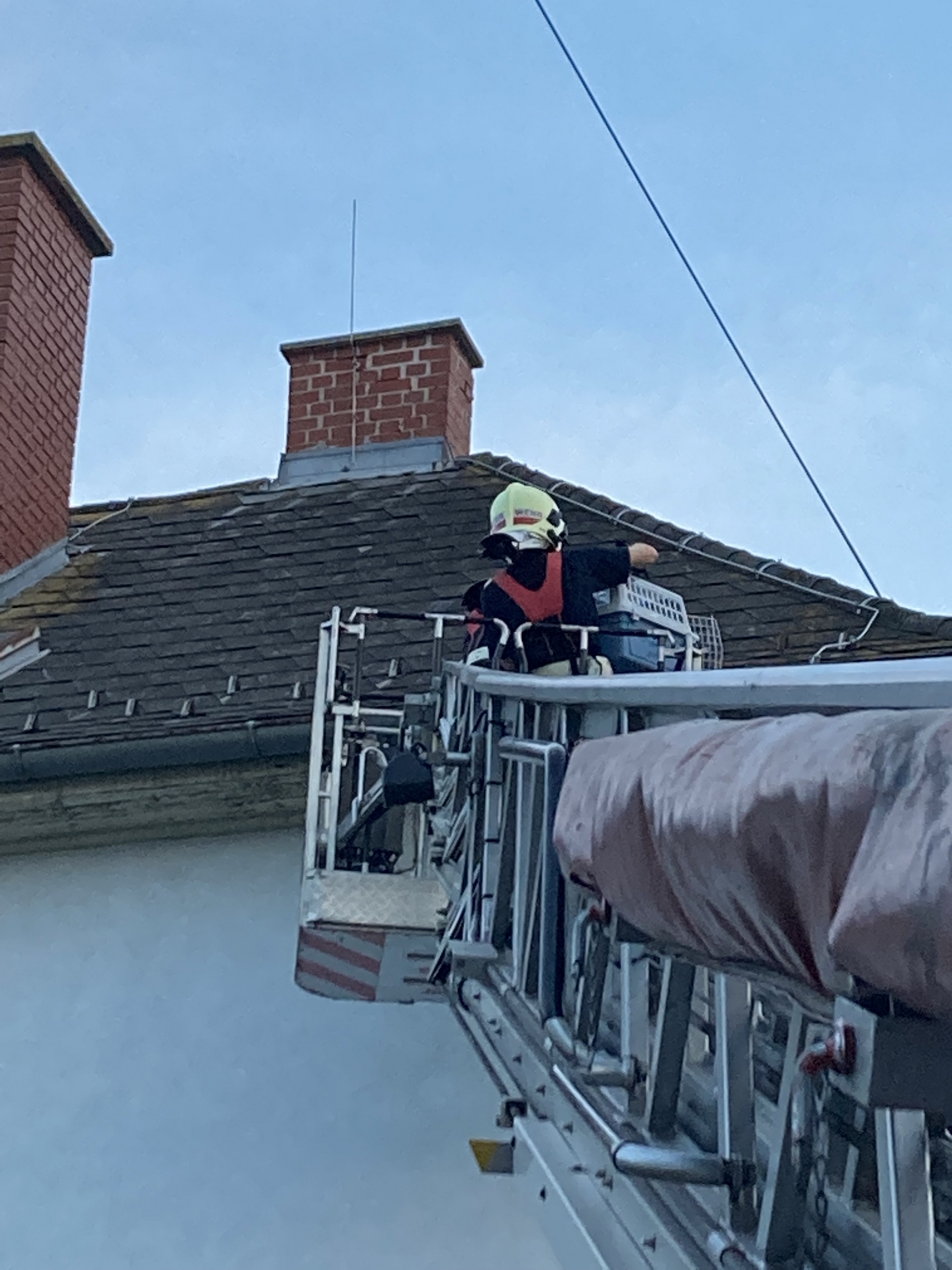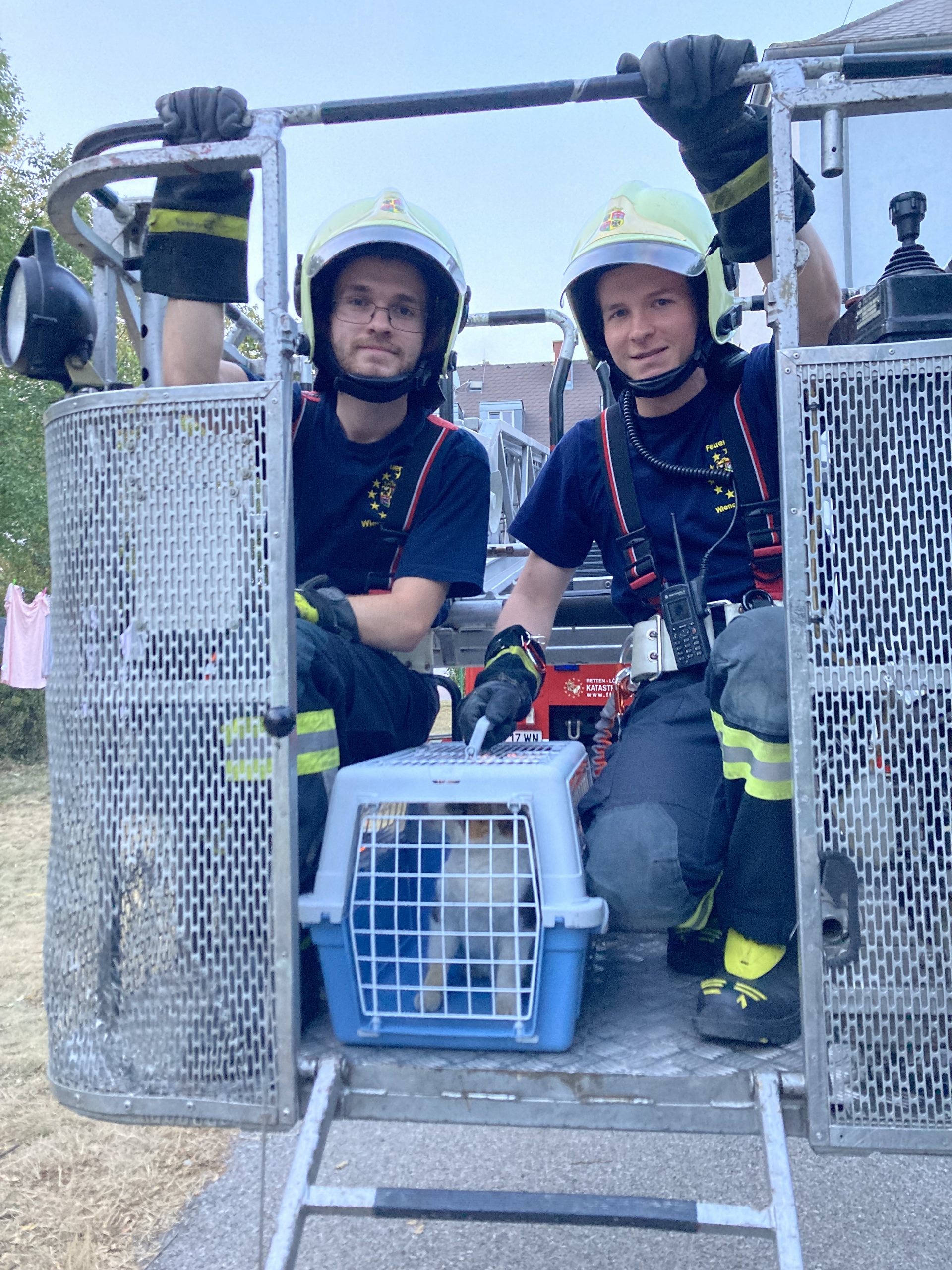 Drei Tage verschollen war eine Katze in Wiener Neustadt, als sie zufällig in einer Dachrinne entdeckt wurde. Das Tier war bei seiner Rettung am Donnerstag bereits durch die Hitze geschwächt und ließ sich von den Feuerwehrleuten Christian und Michael problemlos einfangen. Wieder am Boden angekommen wurde der Stubentiger mit einer Schale Wasser versorgt und an den erleichterten Besitzer übergeben.