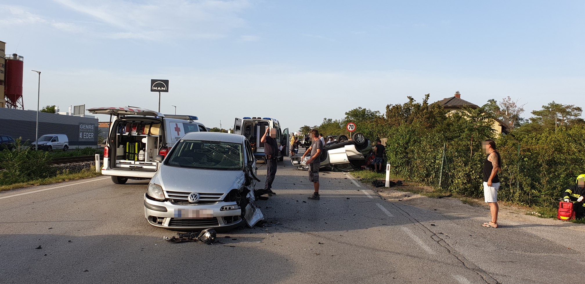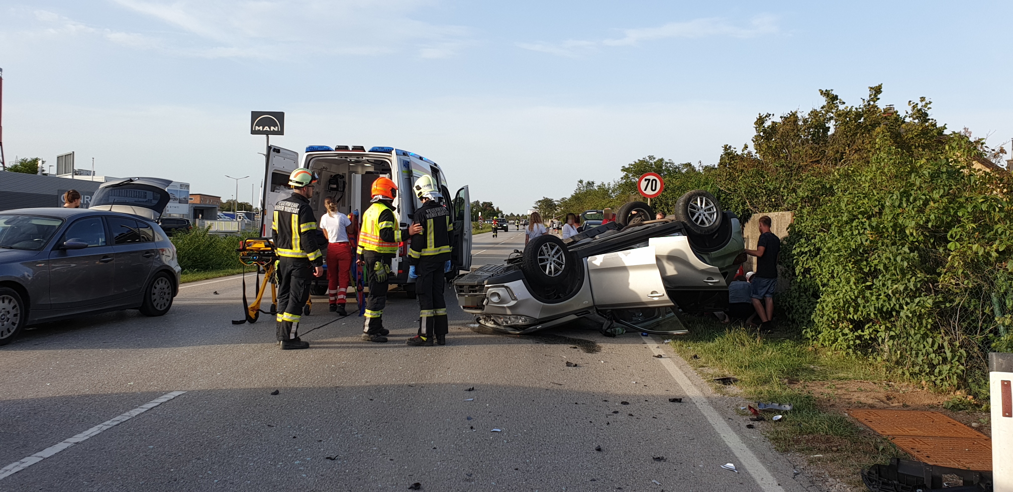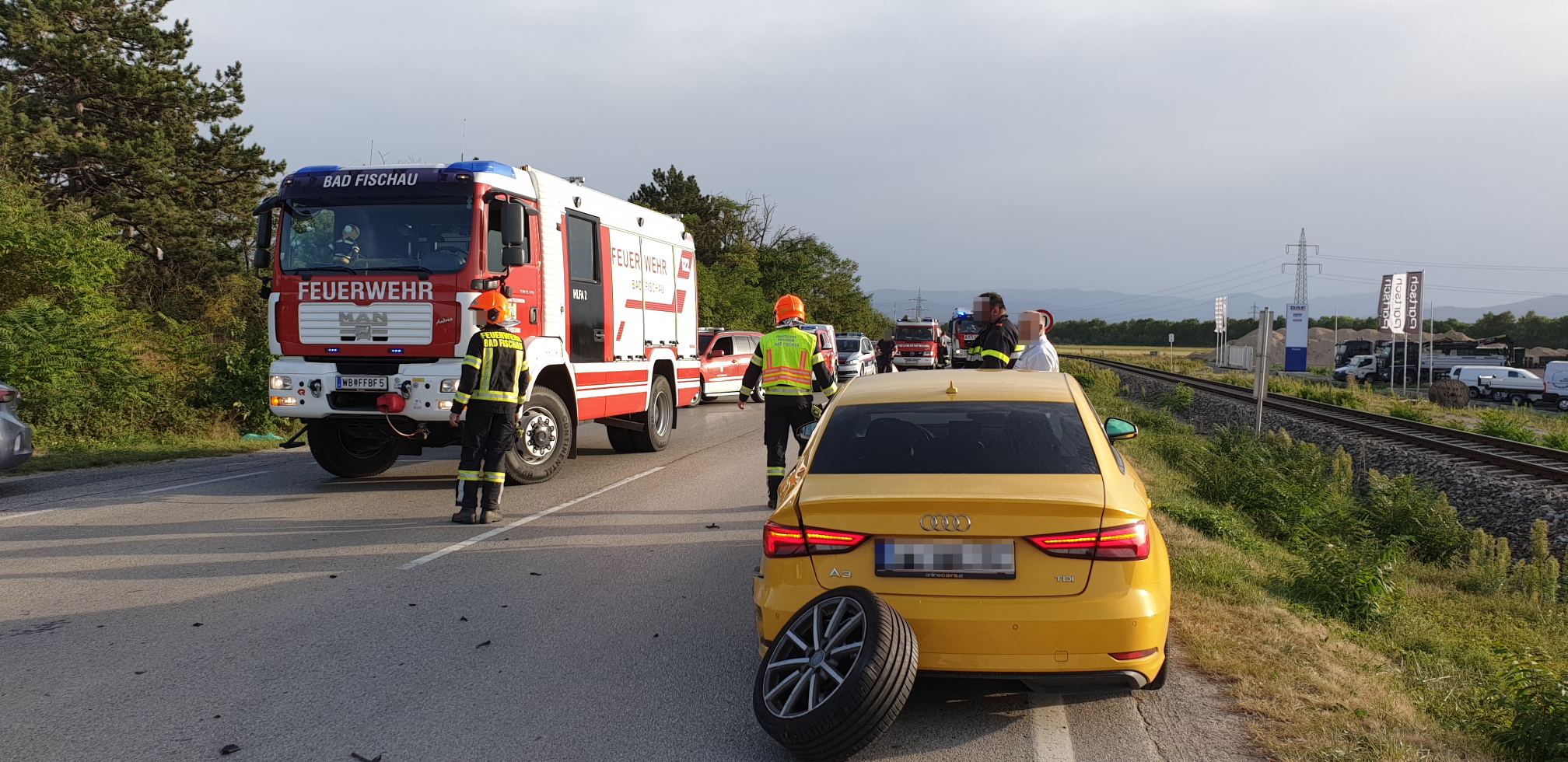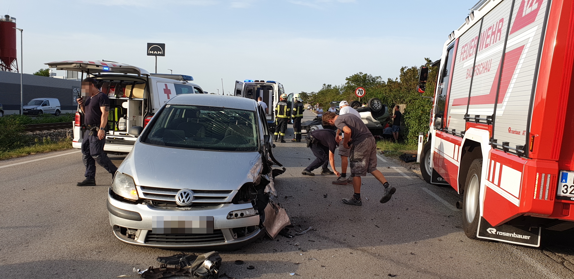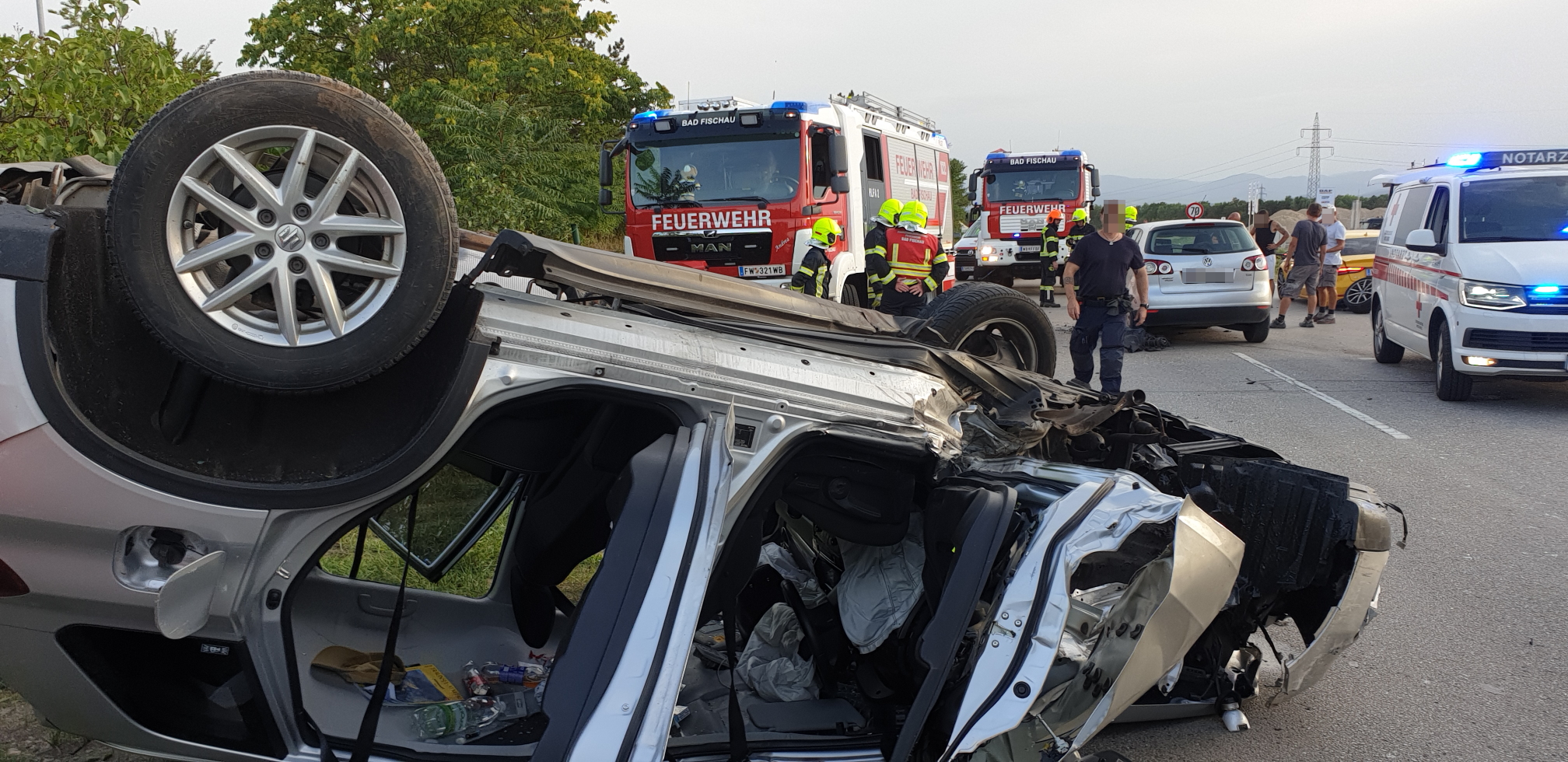 Beim Eintreffen des Vorausrüstfahrzeuges der FF Wiener Neustadt war die Feuerwehr Bad Fischau bereits vor Ort. Glücklicherweise war keiner der Betroffenen in den Unfallfahrzeugen eingeklemmt. Insgesamt wurden bei der Kollission und dem darauffolgenden Fahrzeugüberschlag jedoch fünf Personen zum Teil schwer verletzt. Alle Beteiligten mussten vor Ort, teils notärztlich, versorgt werden.