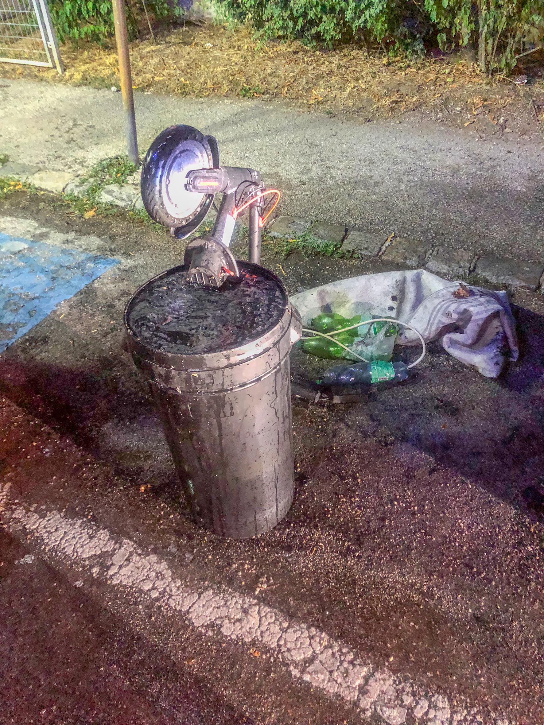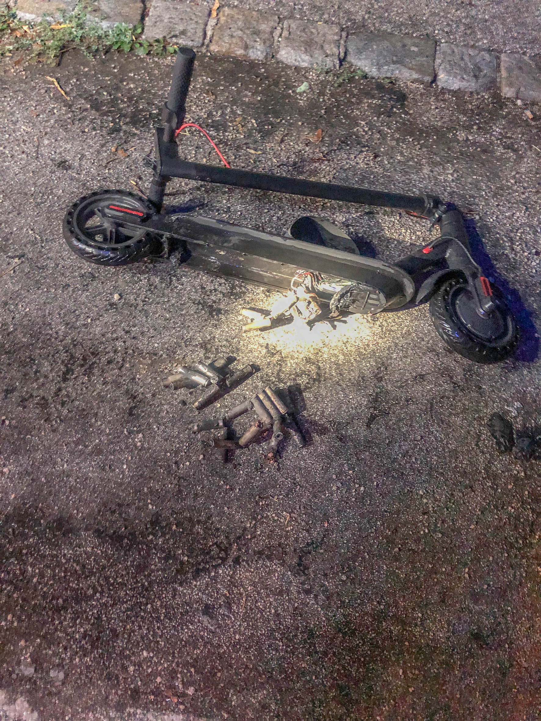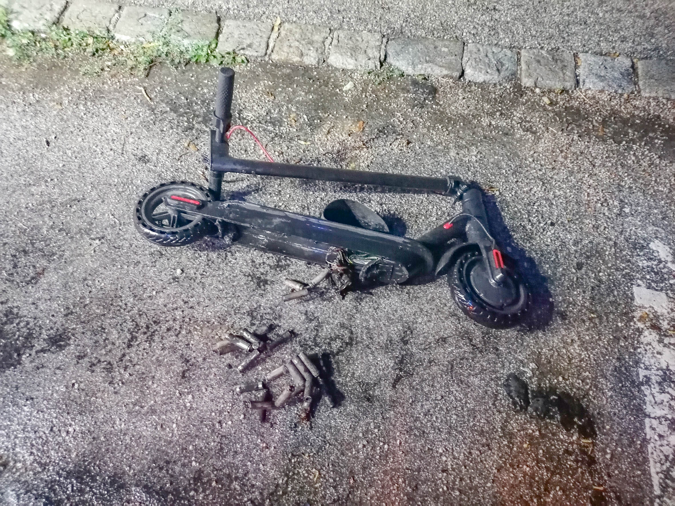 Die Kameraden der Freiwilligen Feuerwehr Wiener Neustadt überprüften den e-Scooter und führten weitere Belüftungsmaßnahmen durch. Der Einsatzleiter forderte einen Einwegbehälter an, welcher mit Wasser gefüllt wurde. Der e-Scooter sowie die Teile der Akkus, welche umherlagen, wurden in diesem Wasserbad versenkt und von der Feuerwehr abgestellt. „Diese Maßnahme ist notwendig, da einmal zu brennen begonnene Lithium-Akkus, wenn diese nicht vollständig ausgebrannt sind, noch eine ganze Weile später noch zu brennen beginnen können“, so Einsatzleiter Sigmund Spitzer. Der Besitzer wurde angewiesen, den Scooter fachgerecht bei den WNSKS zu entsorgen.