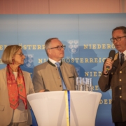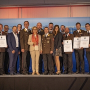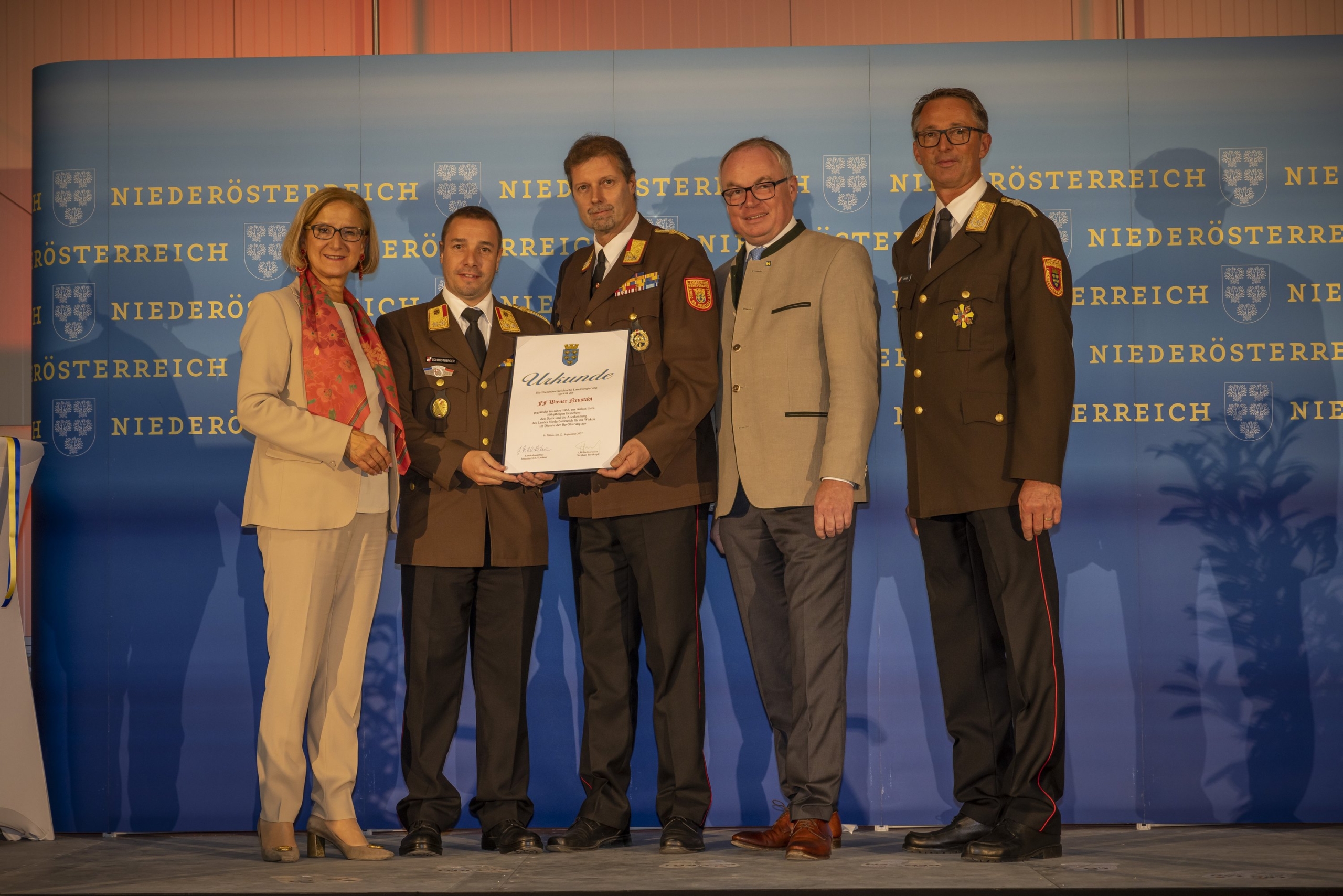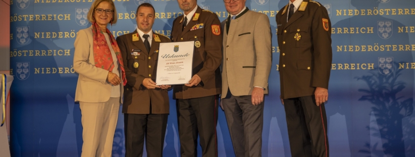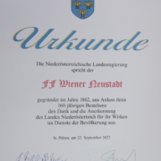 Feuerwehrkommandant Christian Pfeiffer und sein Stellvertreter Norbert Schmidtberger übernahmen die offizielle Urkunde, in welcher die Niederösterreichische Landesregierung der FF Wiener Neustadt „den Dank und die Anerkennung des Landes Niederösterreich für ihr Wirken im Dienste der Bevölkerung“ ausspricht.