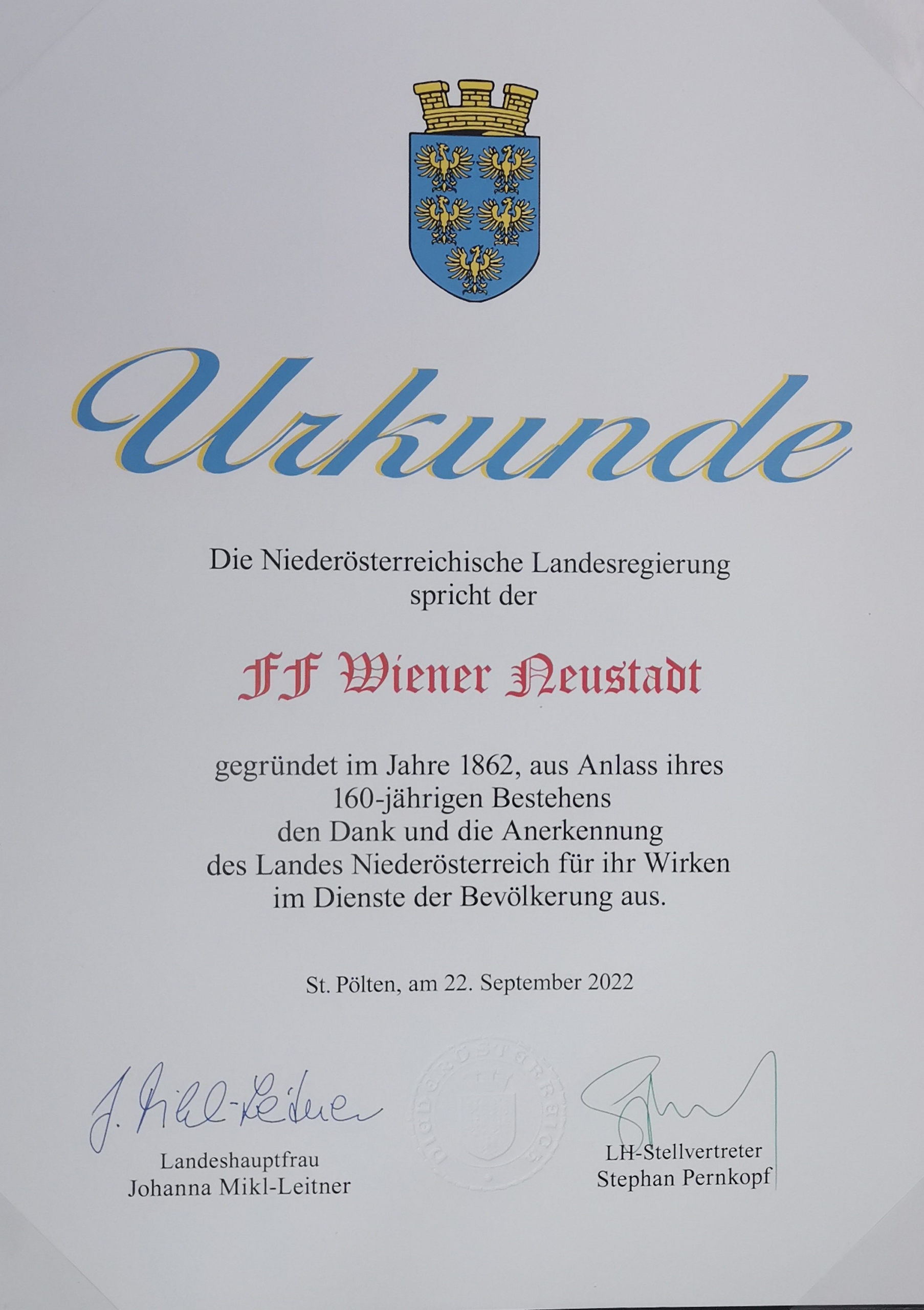 Am 26. Oktober 1862 wurde die Freiwillige Feuerwehr Wiener Neustadt gegründet. Damit ist diese eine der Gründungsfeuerwehren des Niederösterreichischen Landesfeuerwehrverbandes. Beim Festakt des Landes Niederösterreich werden jährlich die Urkunden für 100, 125, 140 und 150jährige Bestandsjubiläen durch die Landeshauptfrau und den zuständigen Landesrat LH-Stv. Stephan Pernkopf vergeben. Heuer wurden erstmalig auch die Urkunden zum 160jährigen Bestehen von niederösterreichischen Feuerwehren vergeben. Landesbranddirektor-Stellvertreter Martin Boyer würdigte in seinen Grußworten die Arbeit der Freiwilligen Feuerwehren, welche bereits über ein Jahrhundert für die Sicherheit der Bevölkerung ihre Freizeit spenden.