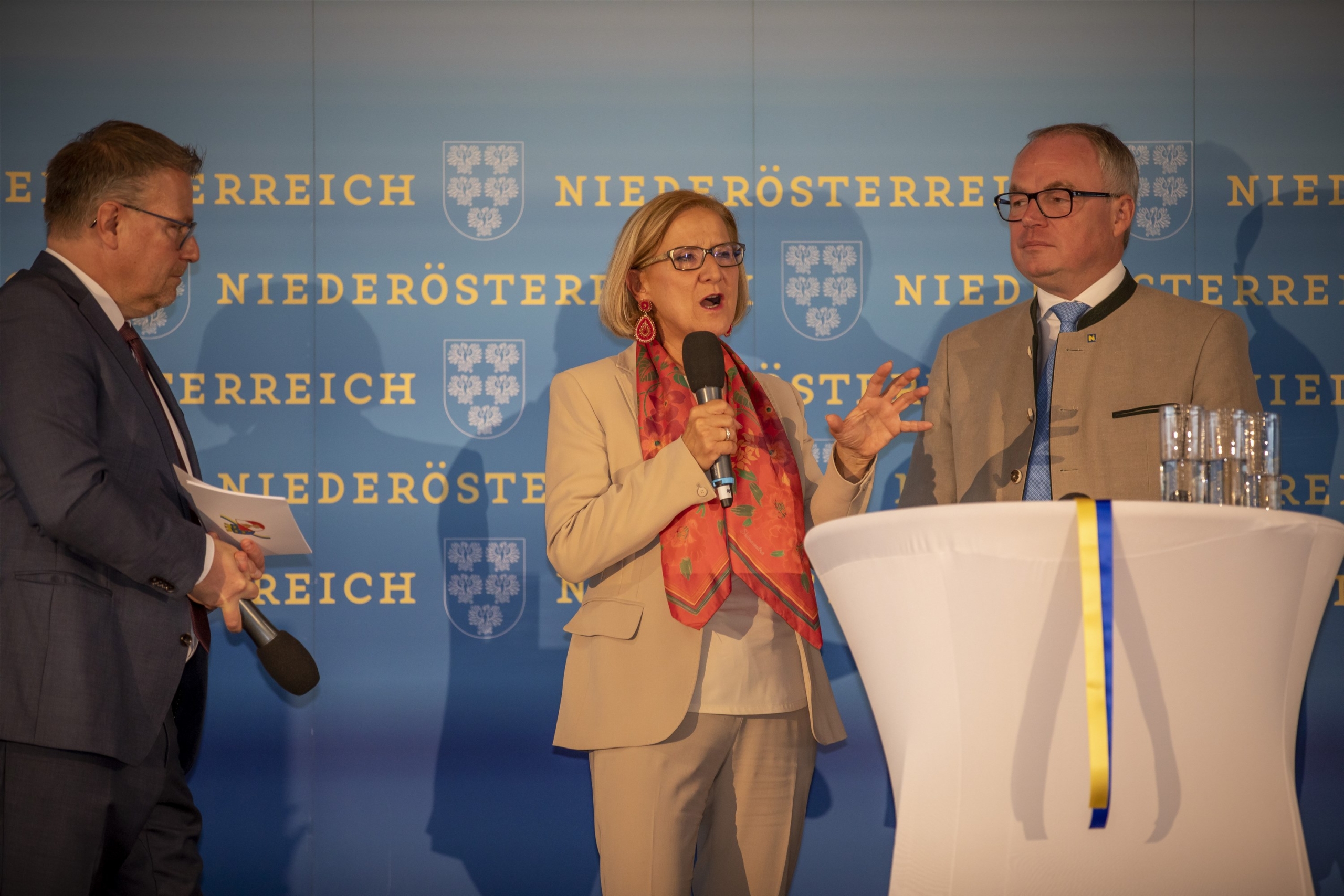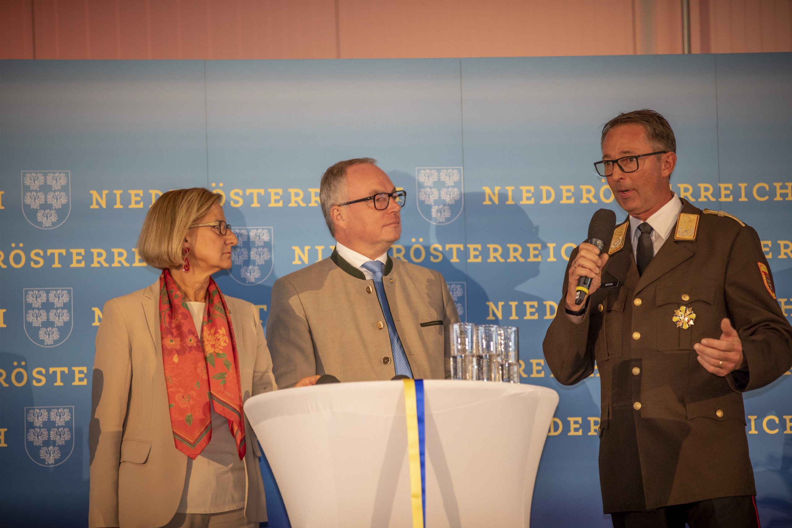 Zur Urkundenüberreichung zum 160jährigen Bestehen der Freiwilligen Feuerwehr Wiener Neustadt durch Landeshauptfrau Johanna Mikl-Leitnerrückten Feuerwehrkommandant Branddirektor Brandrat Christian Pfeiffer und der Feuerwehrkommandant-Stellvertreter, Bezirksfeuerwehrkommandant-Stellvertreter Brandrat Norbert Schmidtberger am Donnerstag, 22.9.2022, nach Tulln aus.