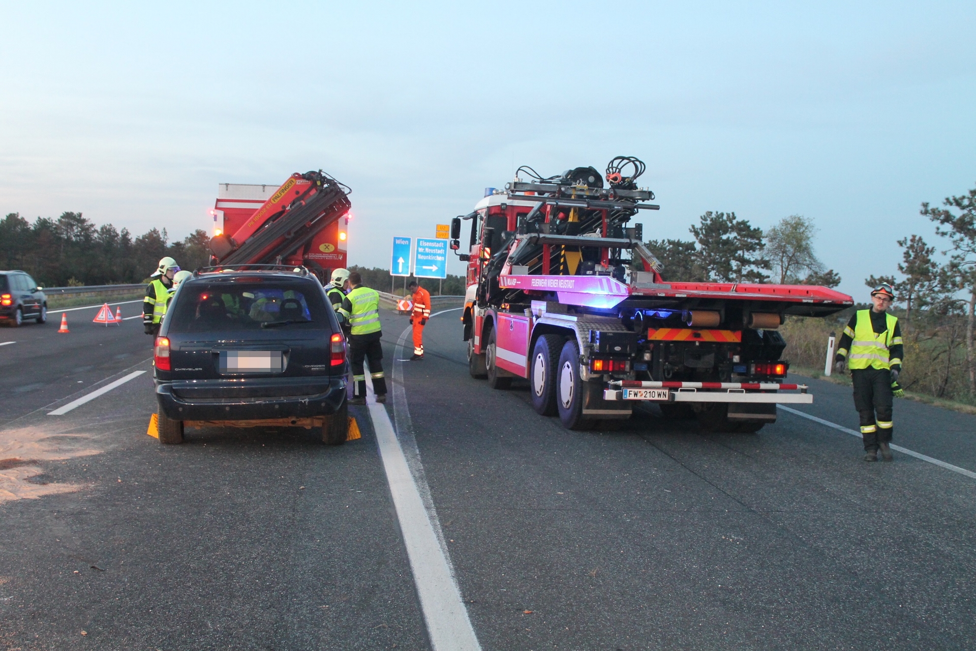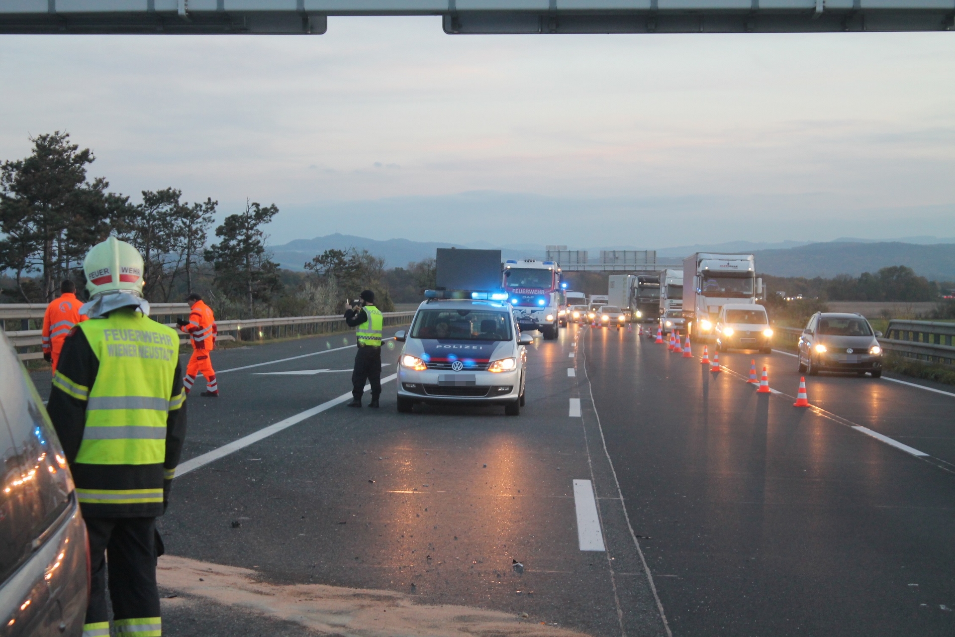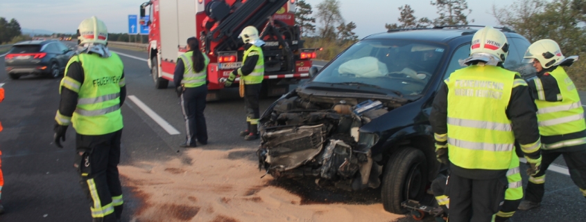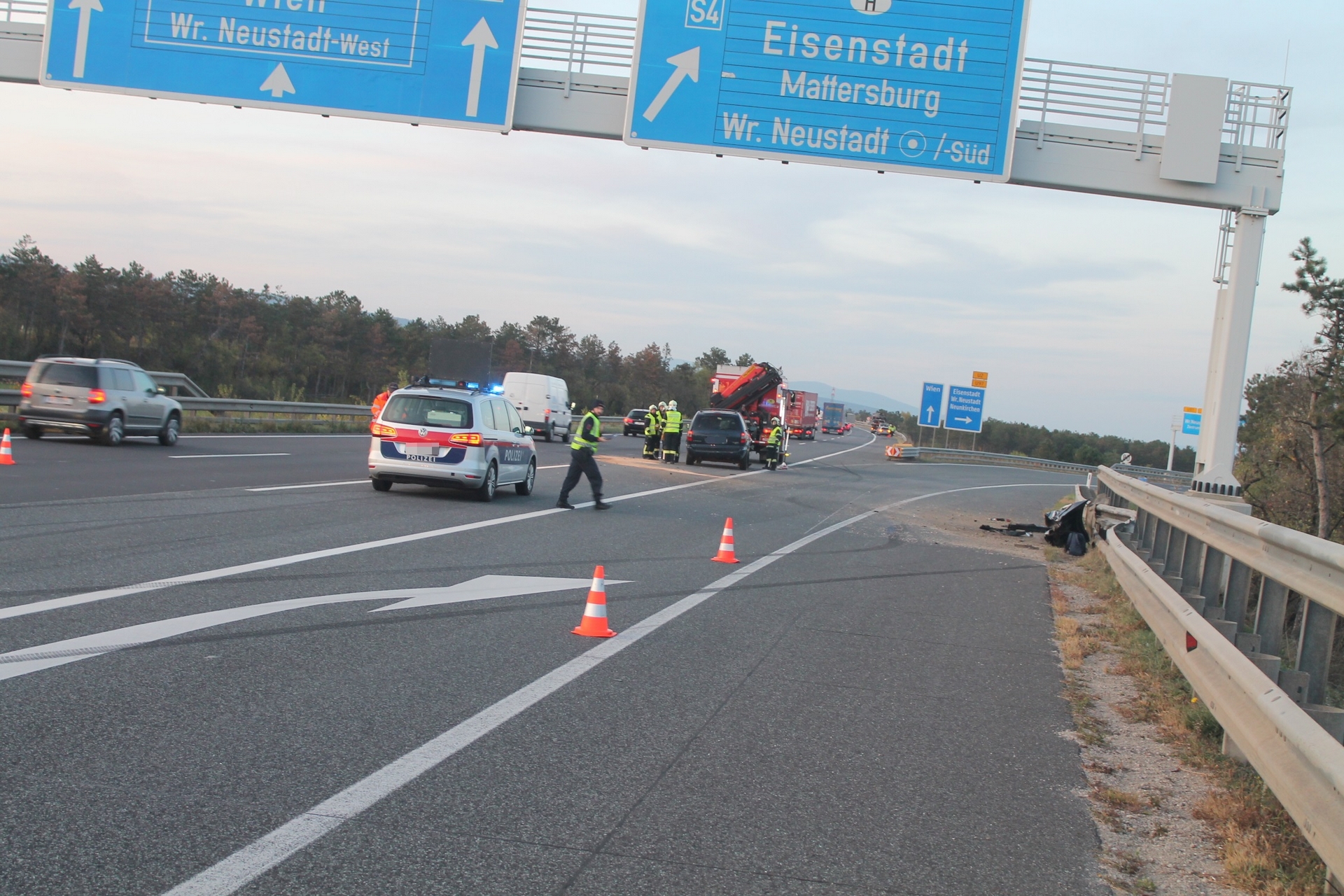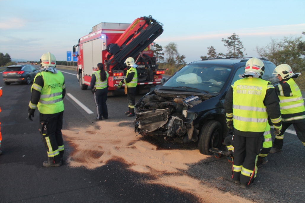 Einen langen Stau verursachte ein Verkehrsunfall auf der A2 in Fahrtrichtung Wien bei der Abfahrt zur S4. Nach einer Kollision zwischen zwei Pkws mussten zwei Spuren sowie die Abfahrt zur S4 über zwei Stunden gesperrt werden. Zur Reinigung der durch Betriebsmittel stark verschmutzten Fahrbahn musste eine Hochdruckkehrmaschine angefordert werden. Während die Freiwillige Feuerwehr Wiener Neustadt die Bergung eines der Unfallfahrzeuge durchführte, wurde das zweite Unfallfahrzeug von einem Privatunternehmen abtransportiert. Eine Person wurde leicht verletzt und vom Roten Kreuz ins Krankenhaus gebracht.