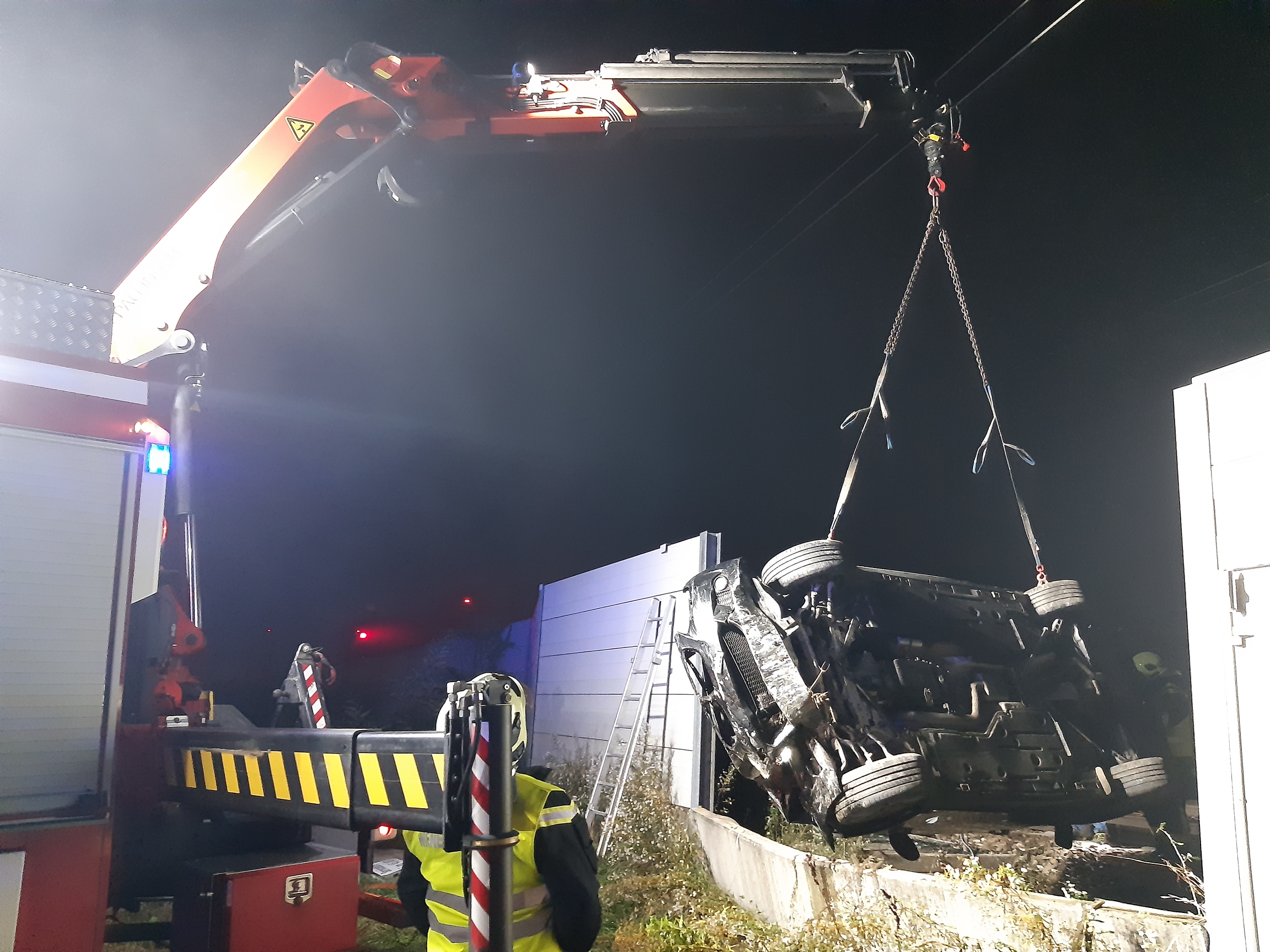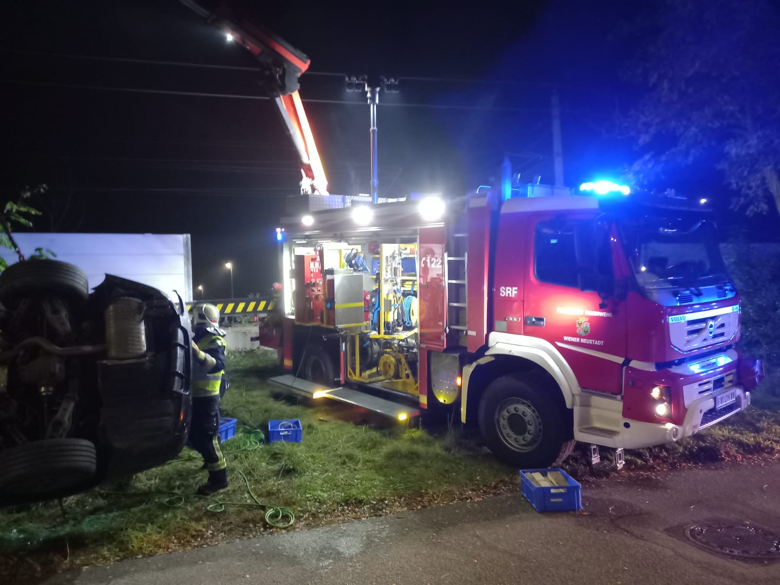 Nach der Freigabe durch die Polizei sowie der Bestätigung der Streckensperre und Erdung durch den ÖBB- Einsatzleiter führte die Freiwillige Feuerwehr Wiener Neustadt die Fahrzeugbergung durch. Nachdem Teile der beschädigten Lärmschutzwand entfernt worden waren, konnte das Unfallfahrzeug mit dem Kran des schweren Rüstfahrzeuges von der Strecke gehoben werden.