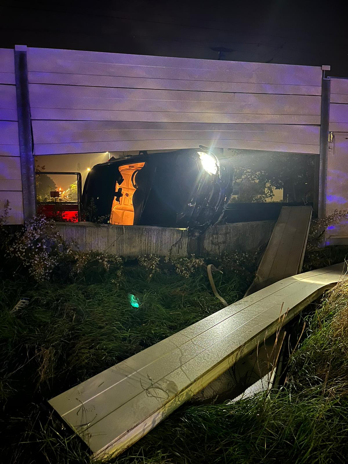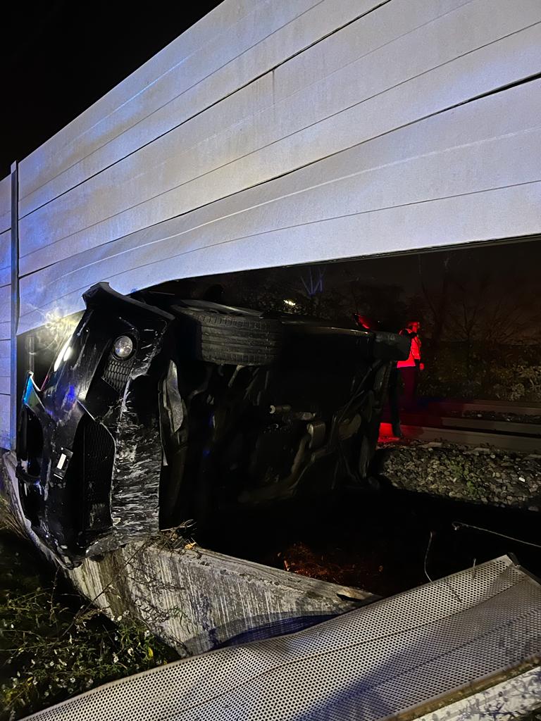 In der Wiener Neustädter Badenersiedlung kam der Autolenker aus unbekannter Ursache von der Fahrbahn ab. Der BMW flog über das Gleisbett und blieb auf der anderen Seite der Schienen in der Lärmschutzwand stecken, wobei das Fahrzeugheck teilweise in den Gleiskörper ragte.