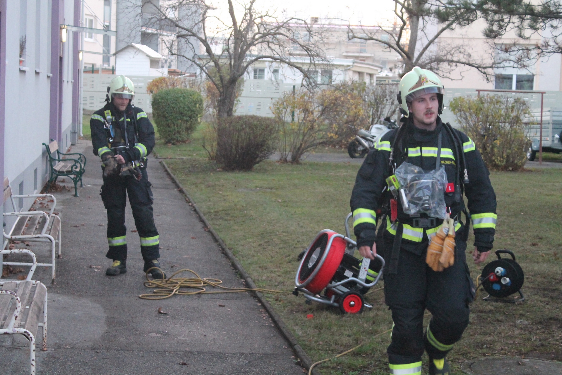 Geistesgegenwärtig reagierte ein Feuerwehrmann aus Wiener Neustadt. Löschmeister Christian, welcher sich bei der Alarmierung um die Ecke der Einsatzstelle befand, leitete vor Eintreffen der Einsatzkräfte vor Ort die Evakuierung des Wohnhauses ein und brachte auch die Bewohnerin der Brandwohnung durch den Rauch ins Freie.