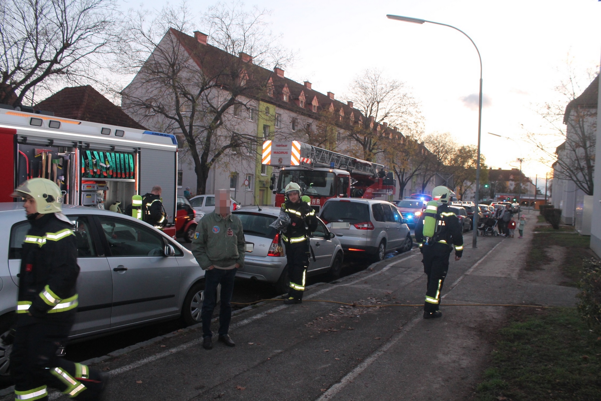 Dem Anzeiger zufolge war eine Bewohnerin im ersten Stock eines Mehrparteienhauses in der Mießlgasse eingeschlossen und konnte aufgrund der starken Verrauchung nicht mehr flüchten. Aus einem offenen Fenster drang bereits starker Rauch.