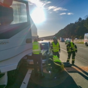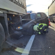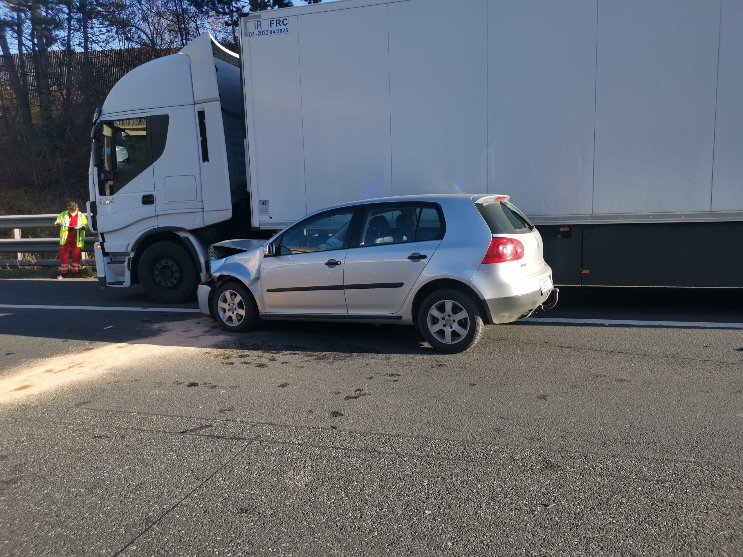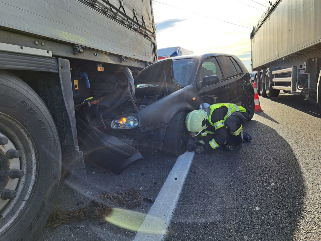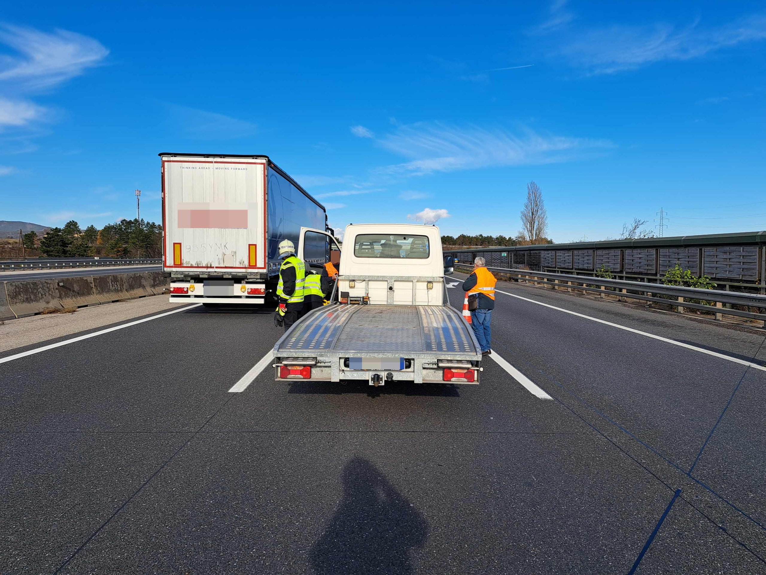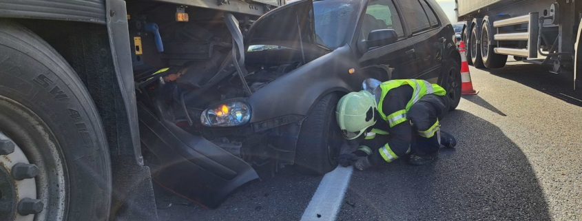 An der Einsatzstelle führte der zuerst eingetroffene Fahrzeugkommandant die Erkundung durch. Der bereits anwesende Rettungsdienst versorgte bereits den Fahrer des Pkw, der schräg auf einen Sattelauflieger aufgefahren war. Es war nur eine Fahrspur frei. Die Mitarbeiter der ASFINAG hatten die Unfallstelle perfekt abgesichert und so konnte nach der Aufnahme des Unfalls durch die Polizei und der darauffolgenden Freigabe des Unfallortes rasch mit den Arbeiten begonnen werden. Im Stau an der Unfallstelle vorbei blieb plötzlich ein italienischer Transporter auf Höhe der Einsatzkräfte stehen: Der Sprit war ihm ausgegangen. Sofort wurde auch dieses Hindernis parallel beseitigt und durch die Feuerwehrmitglieder konnte der Transporter zur Seite geschoben werden. Die Feuerwehr half mit etwas Diesel aus dem Kanister aus, damit zumindest die Fahrt zur Tankstelle möglich war.