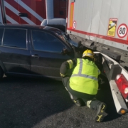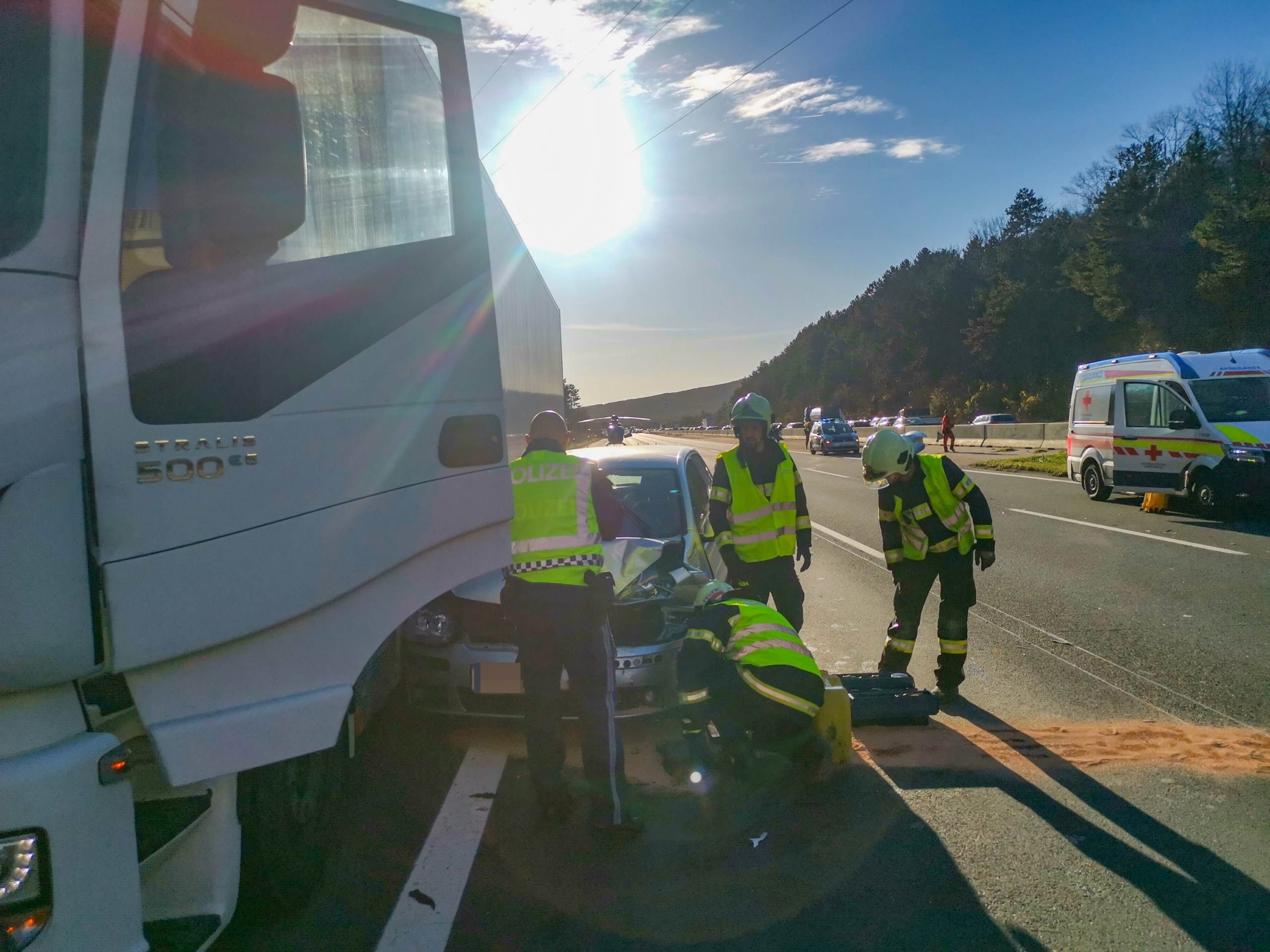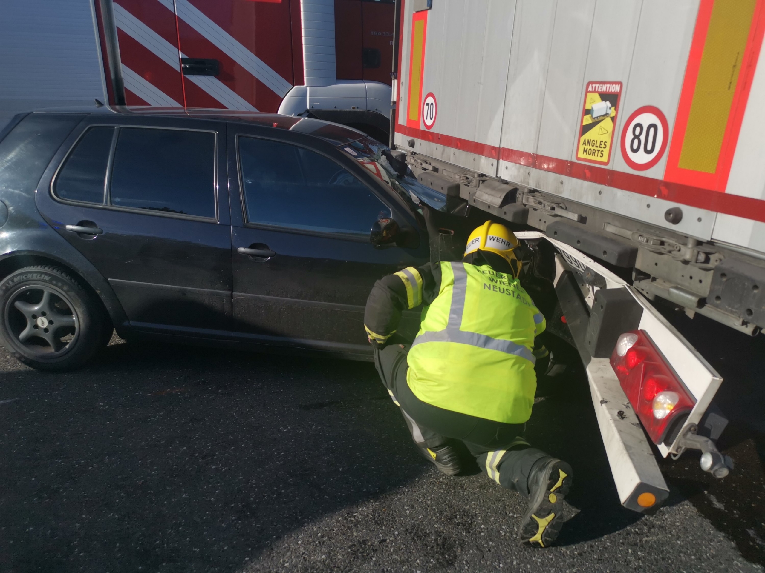 Parallel dazu ließen Kameraden der Feuerwehr die Luft aus den Vorderreifen des verunfallten Pkw, um diesen etwas abzusenken, und veranlasste den Lkw-Fahrer, die Luftfederung seines Aufliegers aufzublasen. Damit konnte der Lkw einfach vom Fahrzeug „herunterfahren“. Der fahruntaugliche Pkw wurde durch das schwere Rüstfahrzeug auf einem Parkplatz gesichert abgestellt, von wo es durch den Besitzer abgeschleppt wird. Der Fahrer des Pkw wurde mit Verletzungen unbestimmten Grades ins Krankenhaus Wiener Neustadt gebracht.