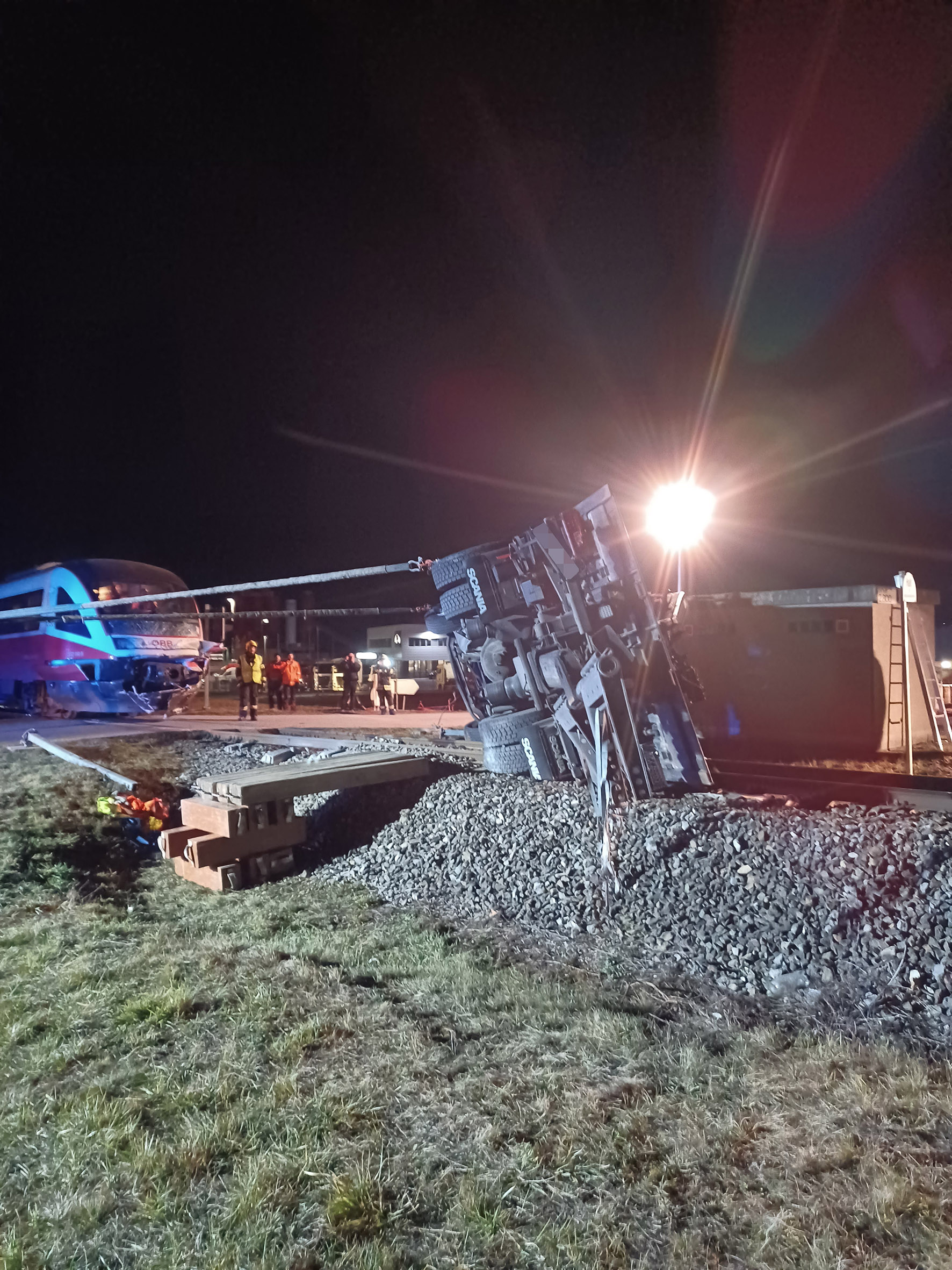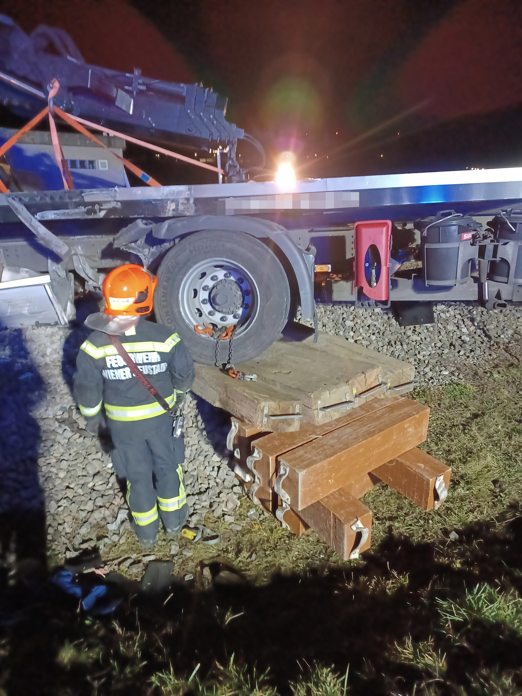 Zur schweren Bergung wurde die Feuerwehr Wiener Neustadt um 15:30 Uhr alarmiert. Die Feuerwehr Wiener Neustadt rückte mit dem schweren Kranfahrzeug sowie den entsprechenden Begleitfahrzeugen aus. Nach der Unfallaufnahme durch die Exekutive und die Freigabe des Unfallortes durch die Unfallkommission, konnten die Bergungsarbeiten beginnen. Die Feuerwehr Wiener Neustadt barg den Lkw von den Gleisen und verhub diesen auf einen Tieflader. Das Wohnmobil wurde auf Ansuchen des Abschleppunternehmens zu der nächsten Werkstatt verbracht. Auch die Garnitur, in welcher sich zum Zeitpunkt des Unfalls fünf Insassen befanden, welche allesamt unverletzt blieben, wurde ebenfalls von der Feuerwehr Wiener Neustadt wieder auf die Gleise gestellt.