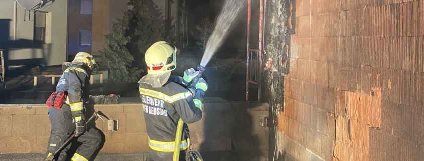 Der schwerwiegendste Einsatz ereignete sich gegen 01.00 Uhr in der Pottendorfer Straße. An einer Baustelle entzündete sich in einem unzugänglichen Dachbereich am Rohbau aufgetragene Teerpappe. Das Feuer konnte sich auf dem leicht entzündlichen Material am gesamten Terrassenbereich rasch ausbreiten und erreichte beim Eintreffen des ersten Feuerwehrfahrzeuges bereits die angrenzenden Fassadenteile. Während die ersteintreffende Mannschaft die ersten Löschmaßnahmen begann, wurden weitere Ergänzungskräfte zum Einsatz alarmiert. Ursprünglich gemeldet wurde lediglich ein Flurbrand.